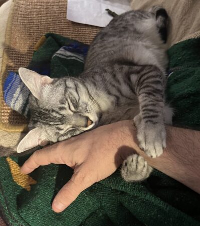 Zulu is fitting in beautifully with our other cats. Bella, our little domestic, actually kind of likes him (which is a miracle), and he and Maximus are getting closer all the time. They play chase regularly and I even saw Maximus give Zulu’s paw a little lick during a nap recently.