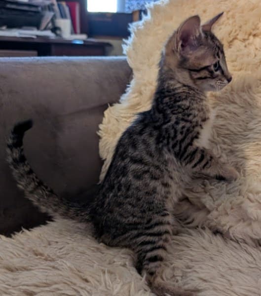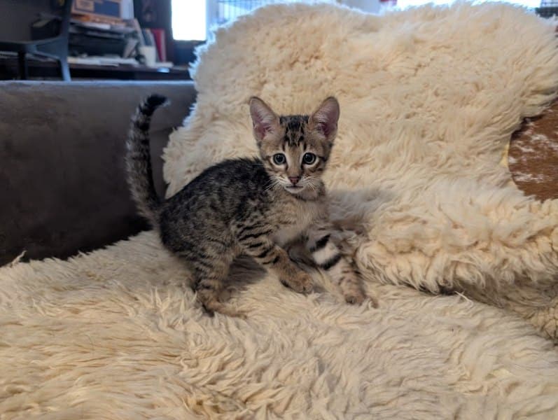Savannah F-4SBT Male Kitten #1 DOB 10-27-25What a sweet face as well as his warm color make this F-4SBt Savannah boy a stand out. Beautifully spotted he will be a stunning adult and fabulous pet for some lucky family. Priced at $2000 as a pet. [Show slideshow]
