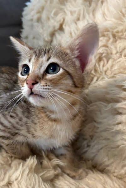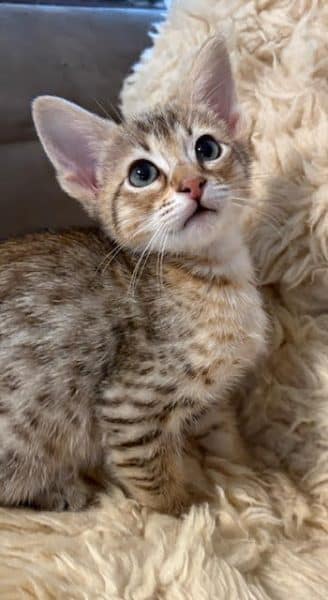 This precious F-4SBT Savannah girl kitten will be going home to Kim and Mathew in VA and be joining another F-6SBT Belle Hollow savannah Maximus who will welcome his new little sister to the family.