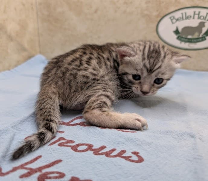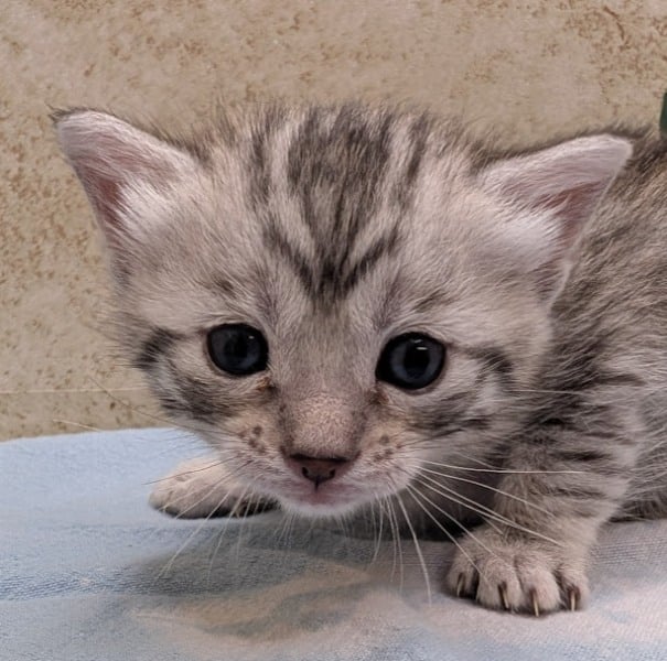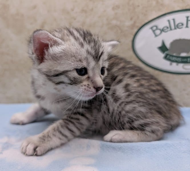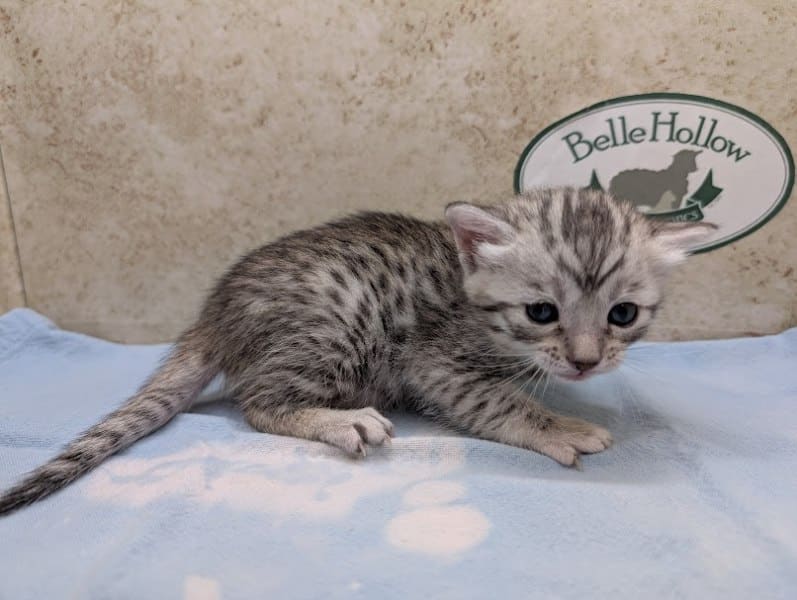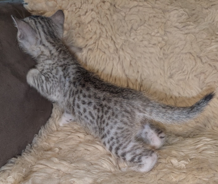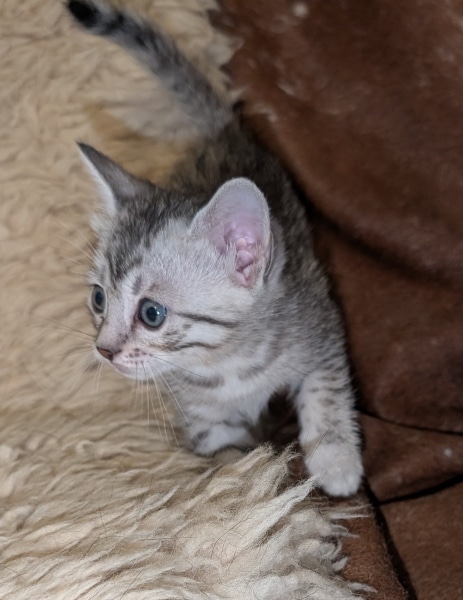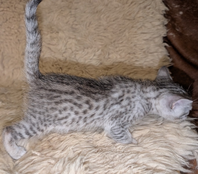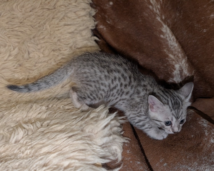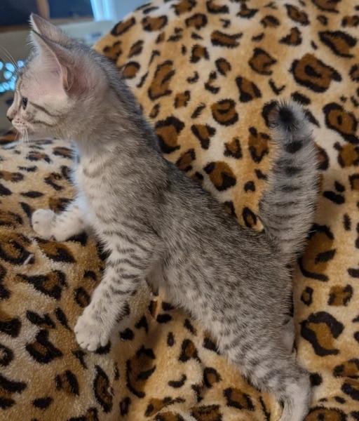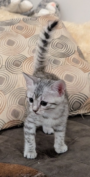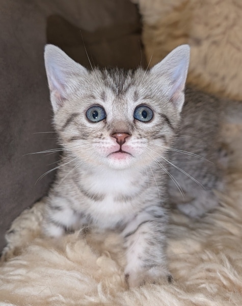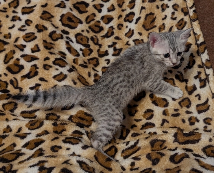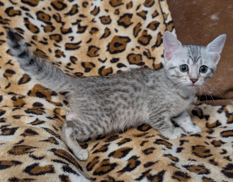 Egyptian Mau Silver female DOB 8-7-25This precious Egyptian Mau girl kitten will make a wonderful pet and loving companion. Having a vary diverse bloodline she's a very special kitten. She will be going home to Edward and wife Abby in NY [Show slideshow]