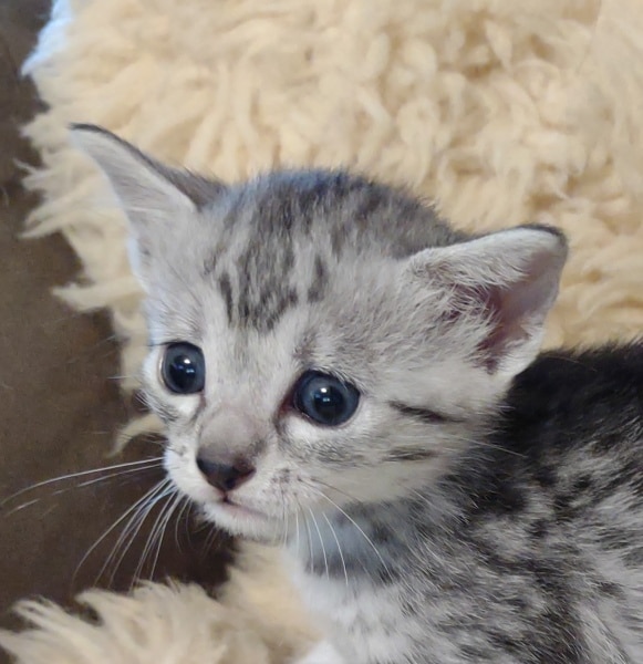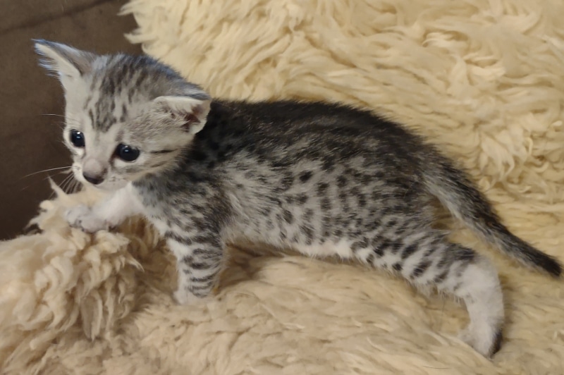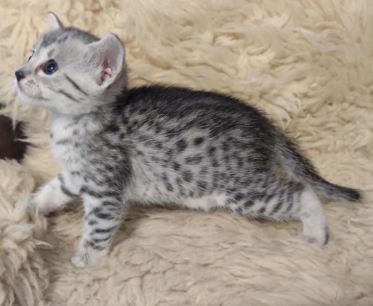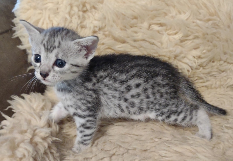 Mau Silver Male kitten #1 DOB 4-4-25This sweet Silver Mau kitten will be going home to Jimmy in SC. His new dad is the grandson of another of our Belle Hollow owners making them a multi-generational Belle Hollow family [Show slideshow]