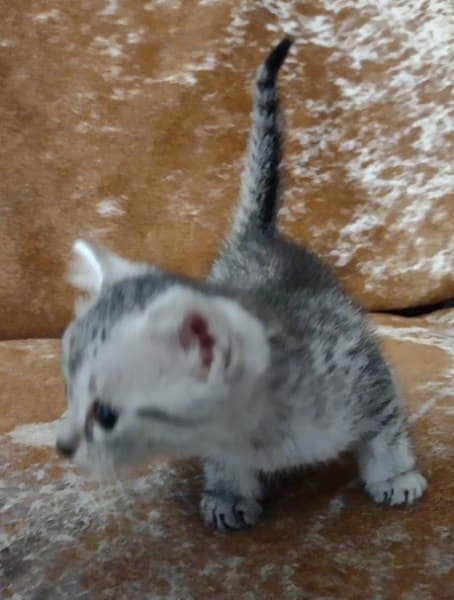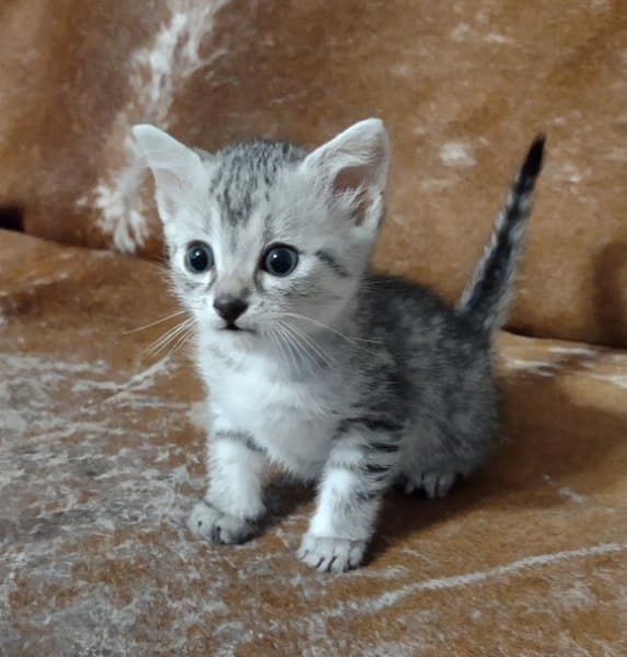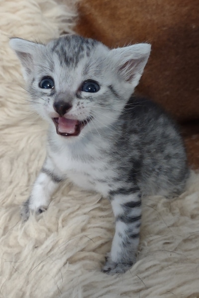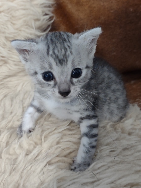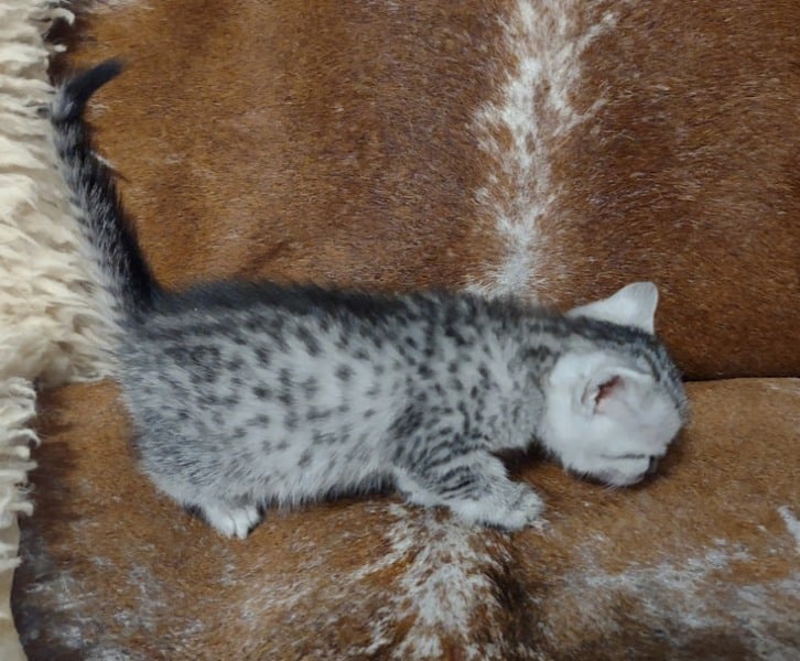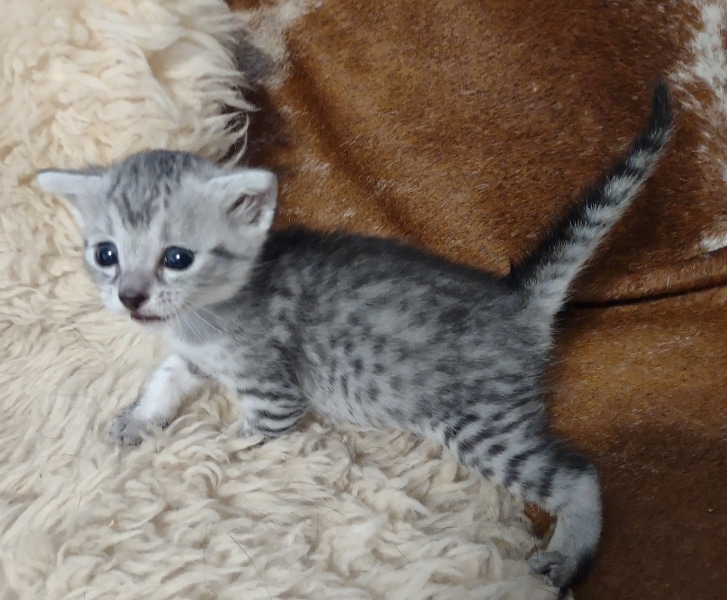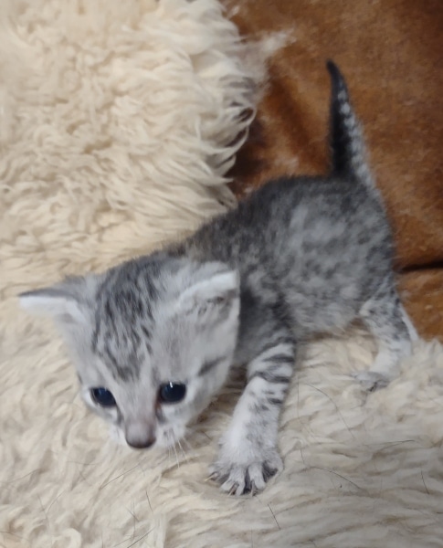 Mauri Mau silver Male DOB 4-4-25This precious tiny silver Mau boy will be going to Barbara in CO who suffered a recent medical issue and needed a sweet baby to live on her lap. [Show slideshow]