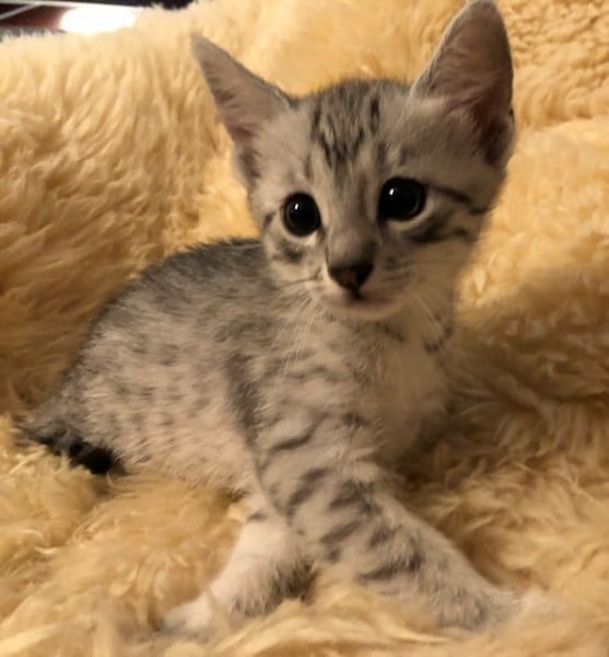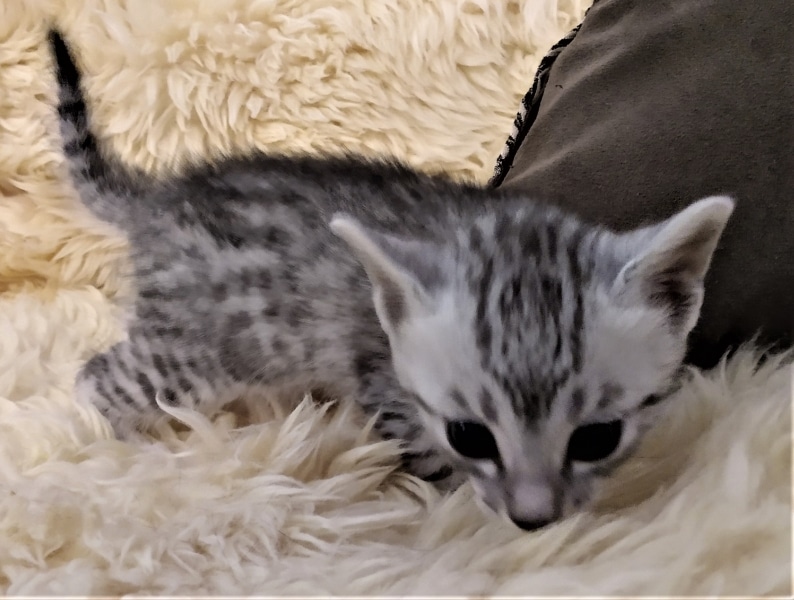 Max, Egyptian Mau, Silver, Male #3, DOB 9-15-19This sweet silver boy is from Bellehollow spotted Destiny and Celestrialspots Northstar of Bellehollow. His grandfather was #1 Mau in TICA 2017. He will be a stunning and loving pet for Jenette and Al and to be a BFF to Sprite their Bengal. [Show slideshow]