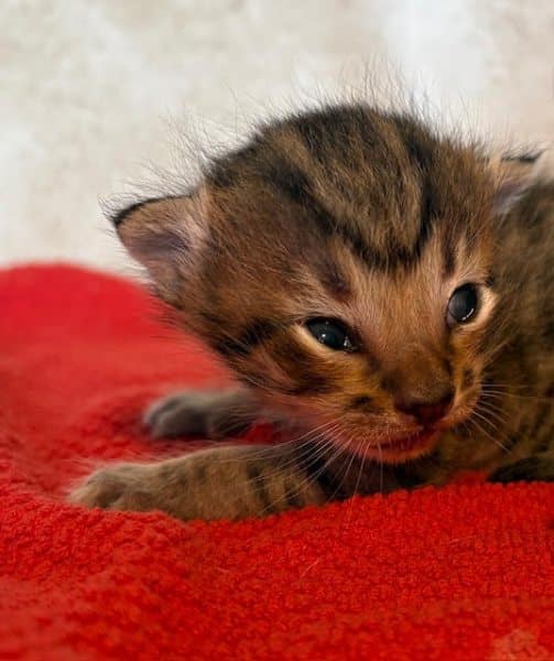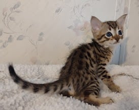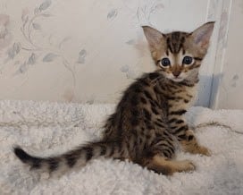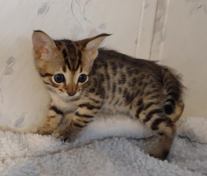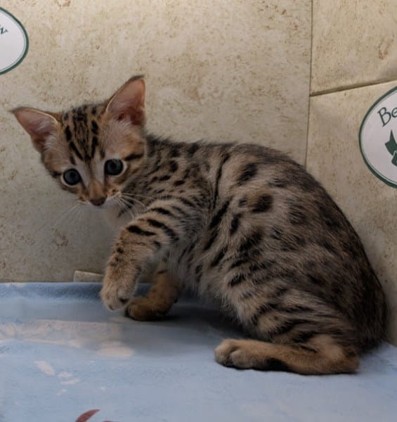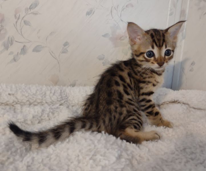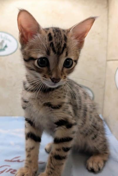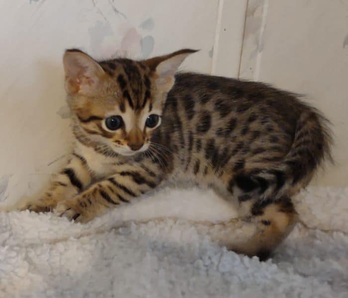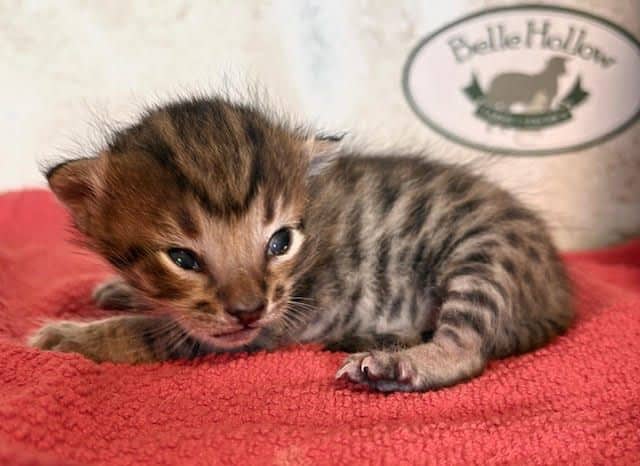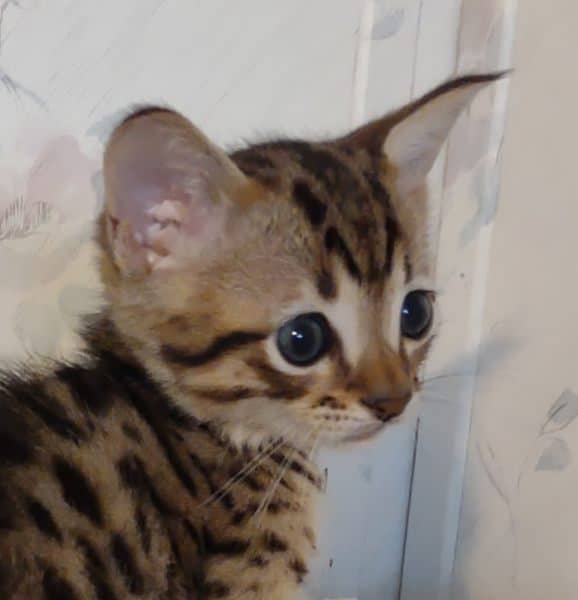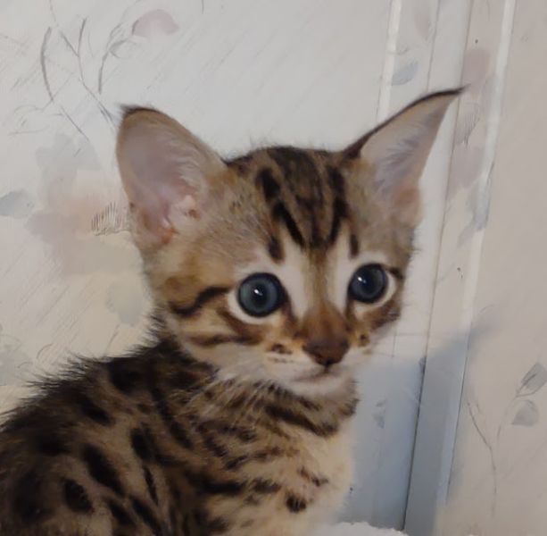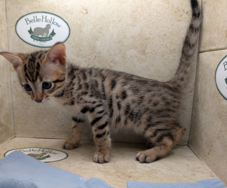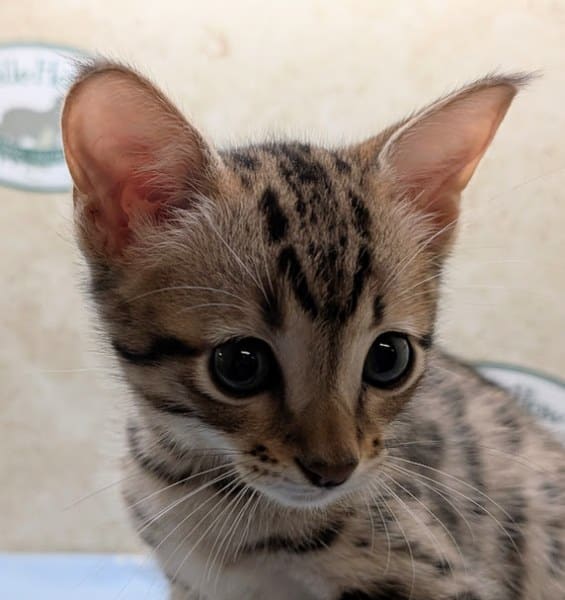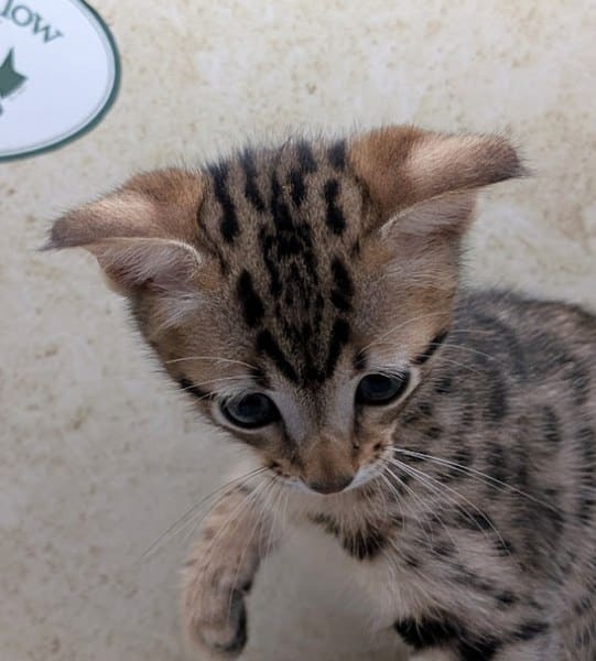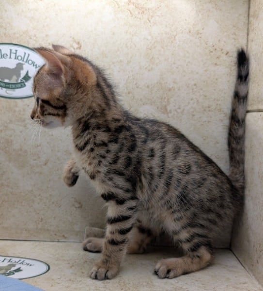 Savannah F-4SBT Brown Spotted kitten Male #1 DOB 6-14-25This sweet F-4SBT savannah kitten is his mothers first litter. Beautifully spotted he will be an exceptional pet from a lovely crossing. Priced reduced to $1600 [Show slideshow]