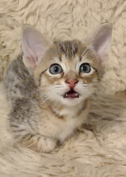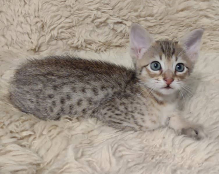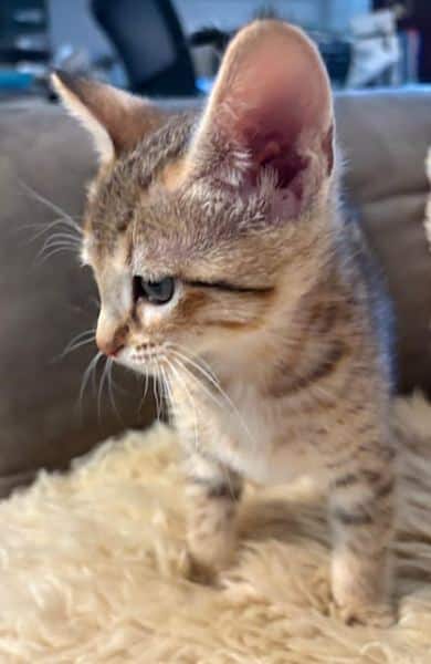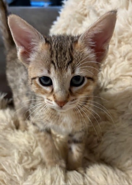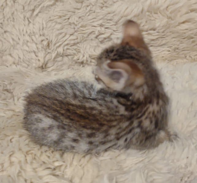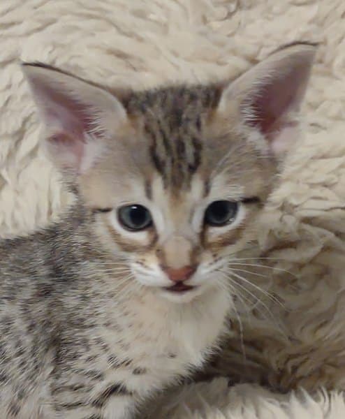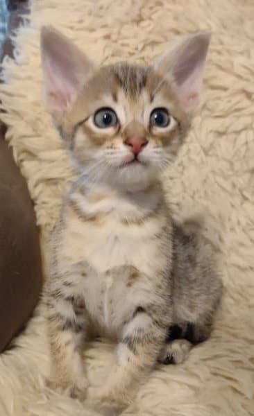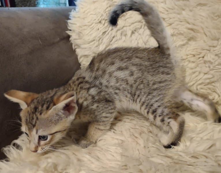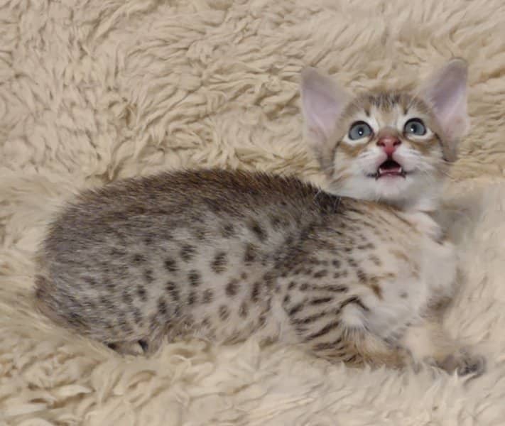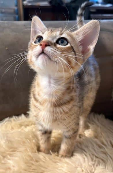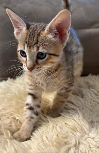 Savannah F-4SBT Female Kitten #1 DOB 5-10-25This sweet girl is just stunning and will have warm color and great spots. From a sweet pairing of Muffin to Aristotle she represents a new line here at Belle Hollow. She will be going home to Dmitry and his wife in MD. [Show slideshow]