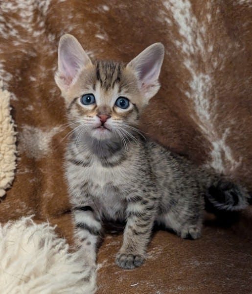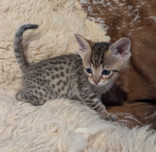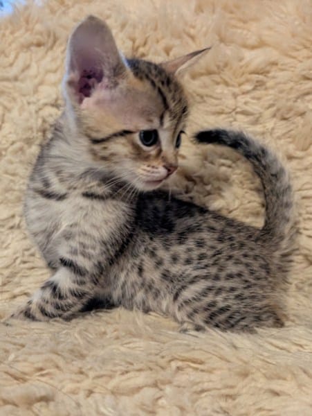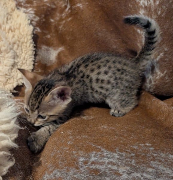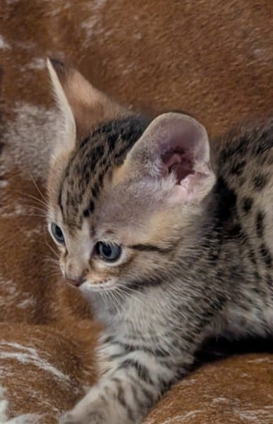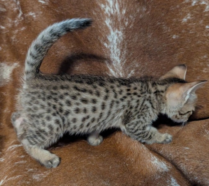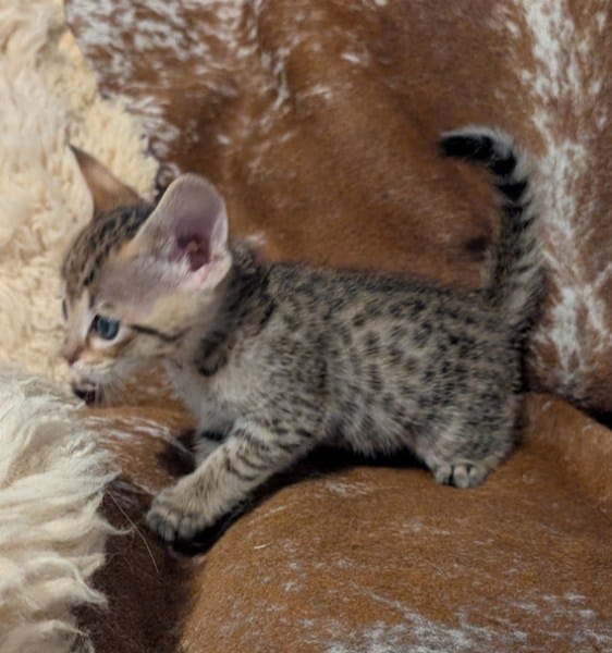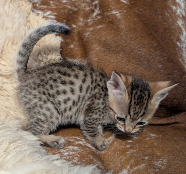 Savannah F-4SBT Male Kitten #2 DOB 11-24-25This precious F-4SBT Male Kitten will make your heart go pitter-patter. Stunning spots from a great proven pairing he will be a loving companion and your new BFF. He will be going home to Maaz and family in NC. [Show slideshow]