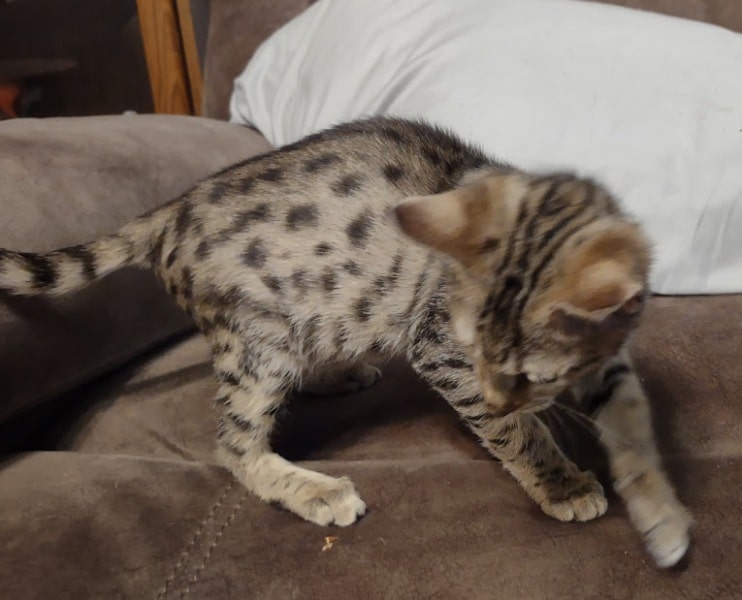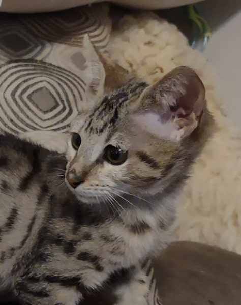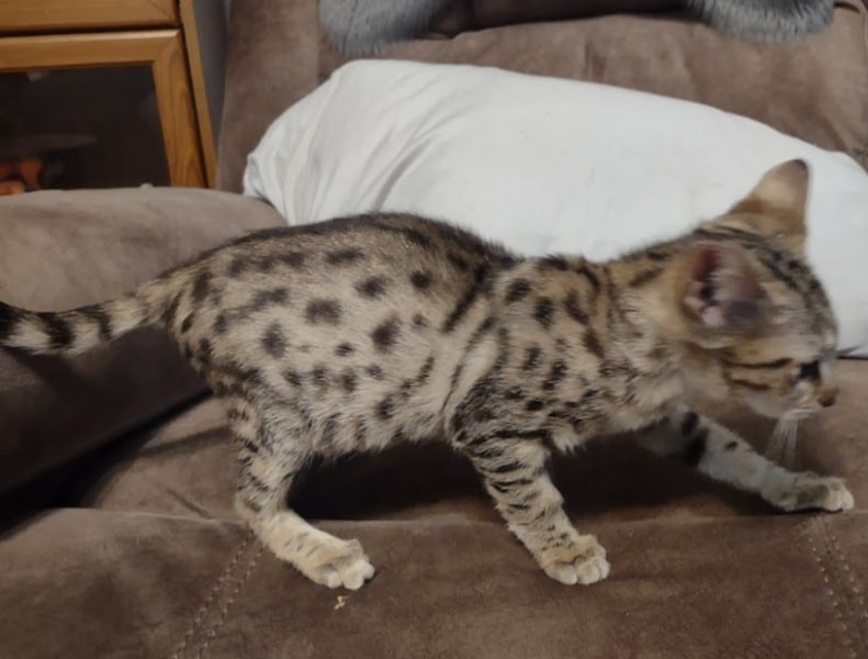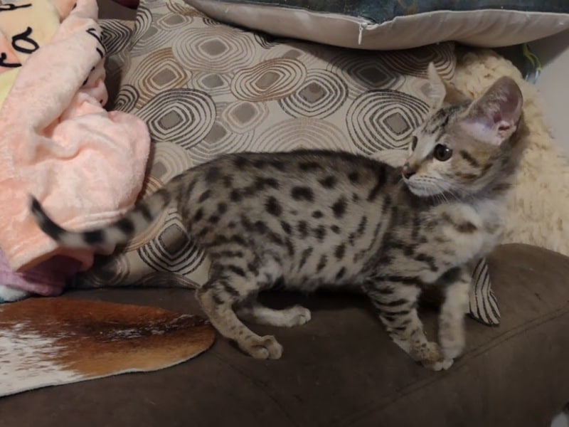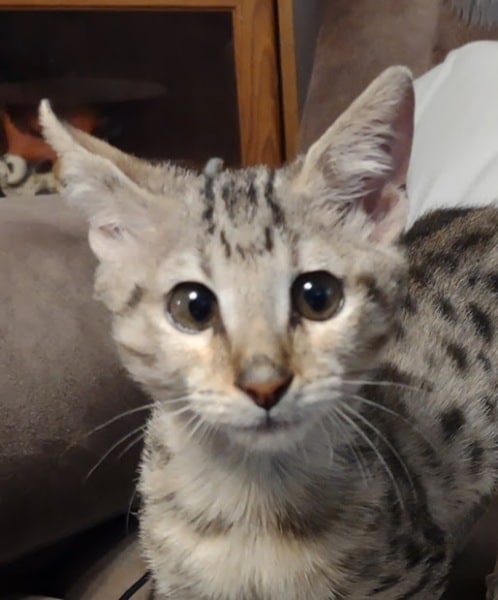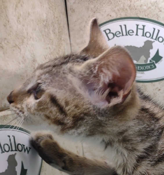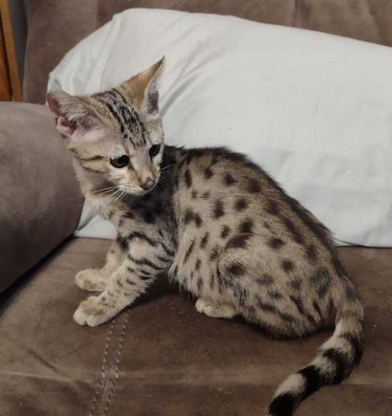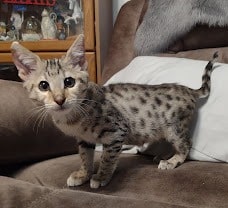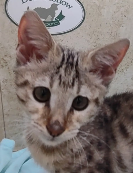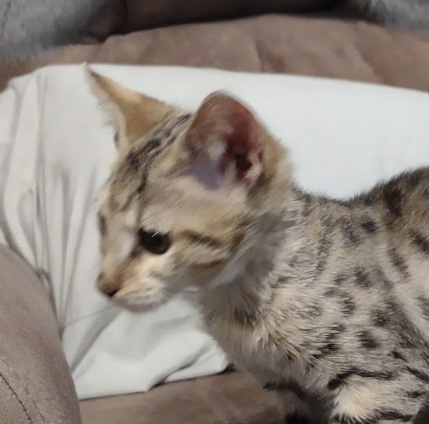 Savannah F-3C female DOB 6-3-23This beautiful F-3C Savannah girl was a little early and I personally bottle raised her from birth. She is a 100% Human Imprint and will be a pet like no other kitten can be. She will be going home to Matt in Florida to be a beloved pet. [Show slideshow]
