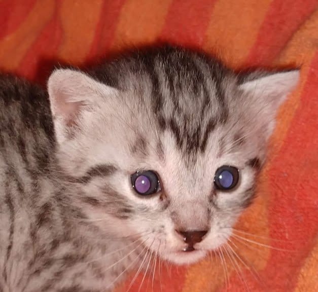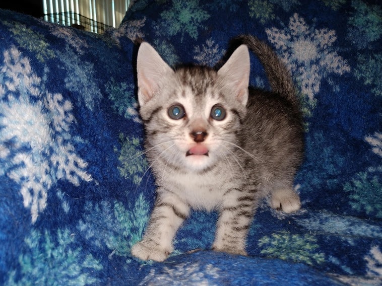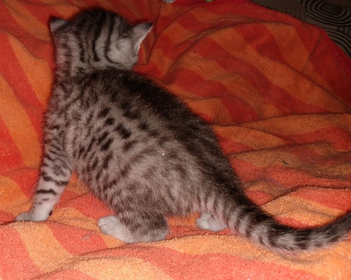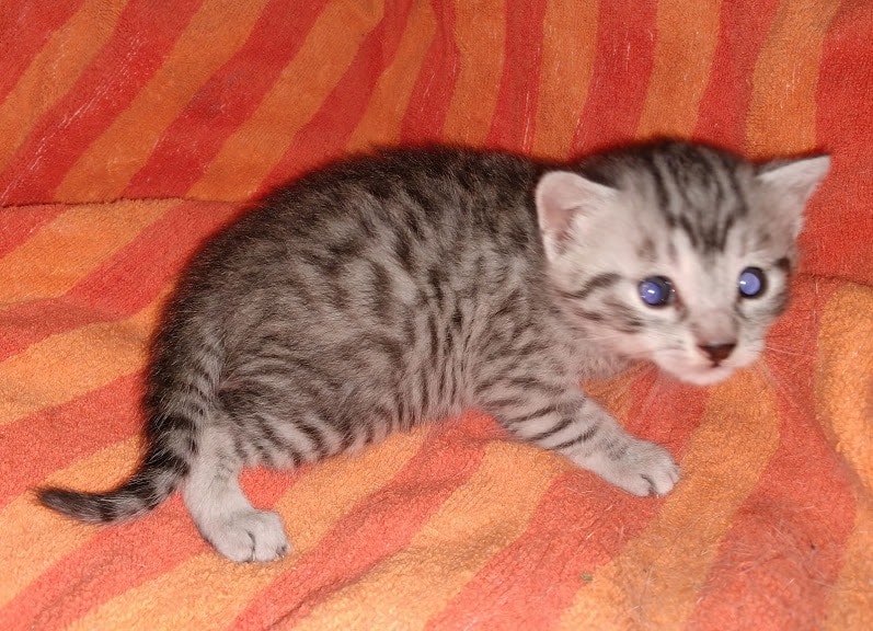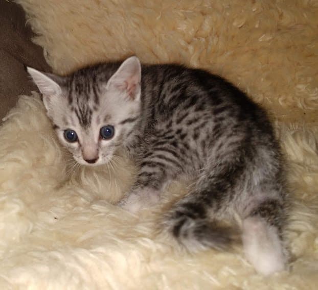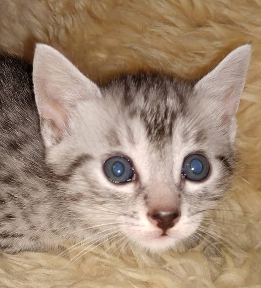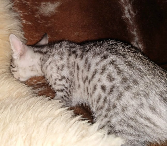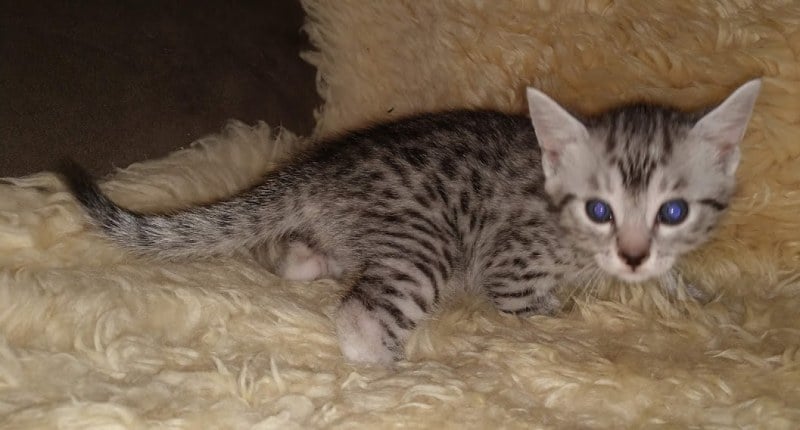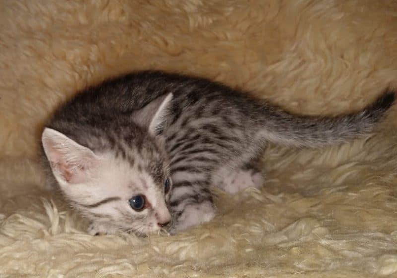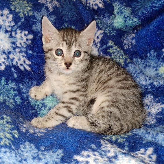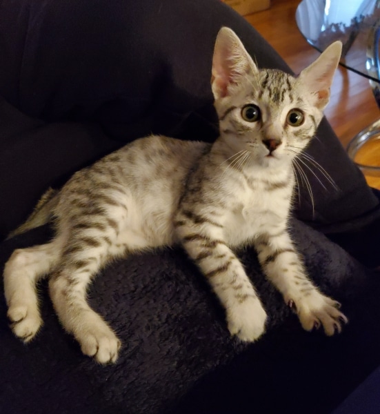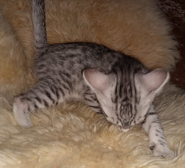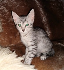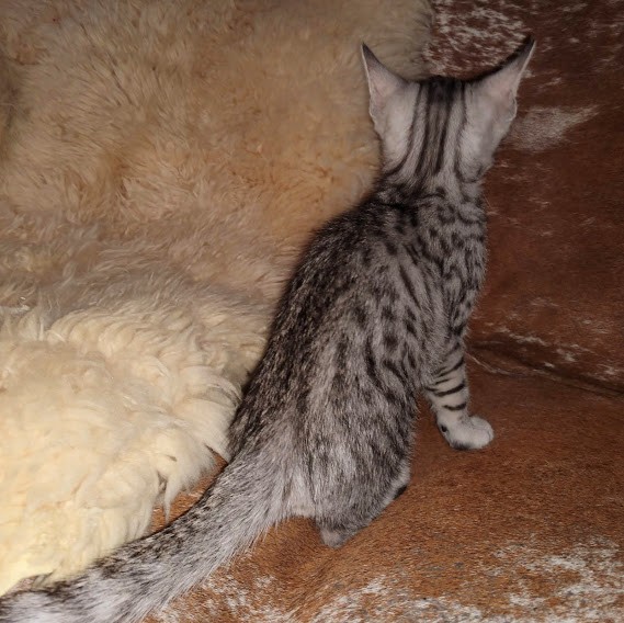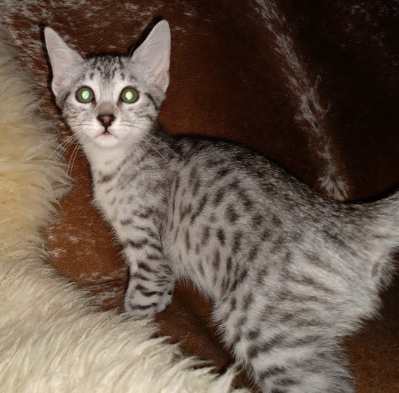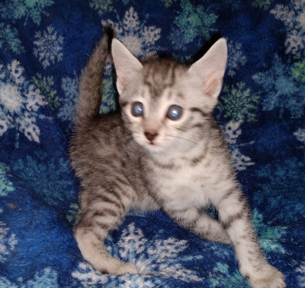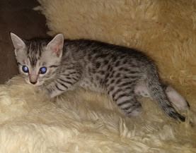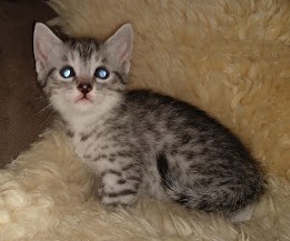 Egyptian Mau Silver Male #3 DOB 9-20-20Shiny and sweet this little silver Mau boy will be a fabulous companion for Tini, Alex and thier twin sons in NY. [Show slideshow]1 2 ►