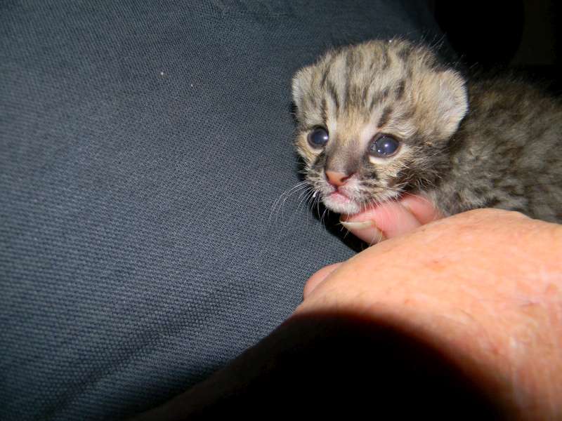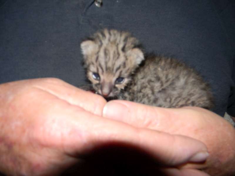This precious little bundleof trouble is just over 2 weeks old and weighing in at just under 8 ounces! A golden spotted Geoffroy’s Cat, she is a full human imprint and will make a superior education cat, quality and a manageable breeding queen and all around good egg.