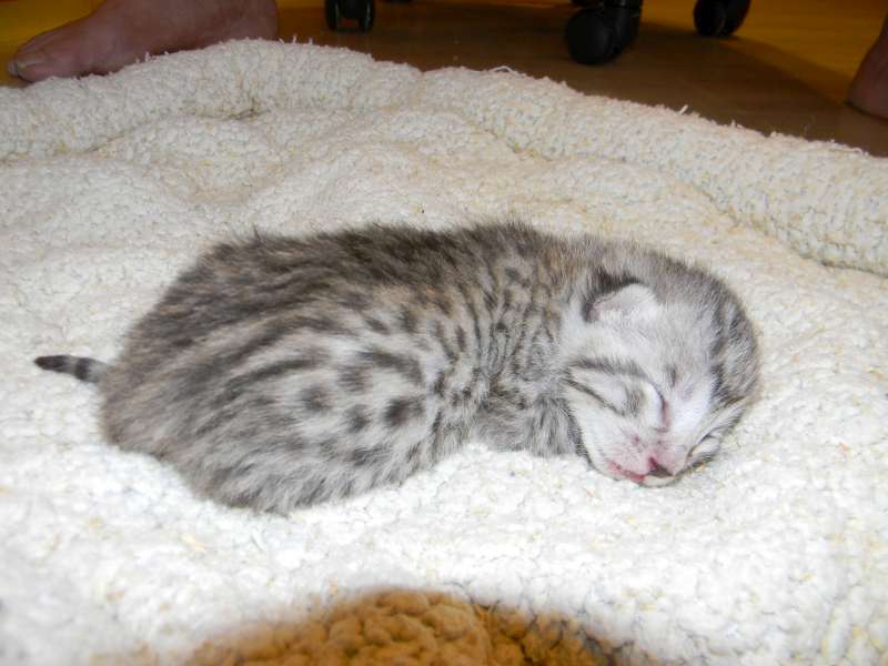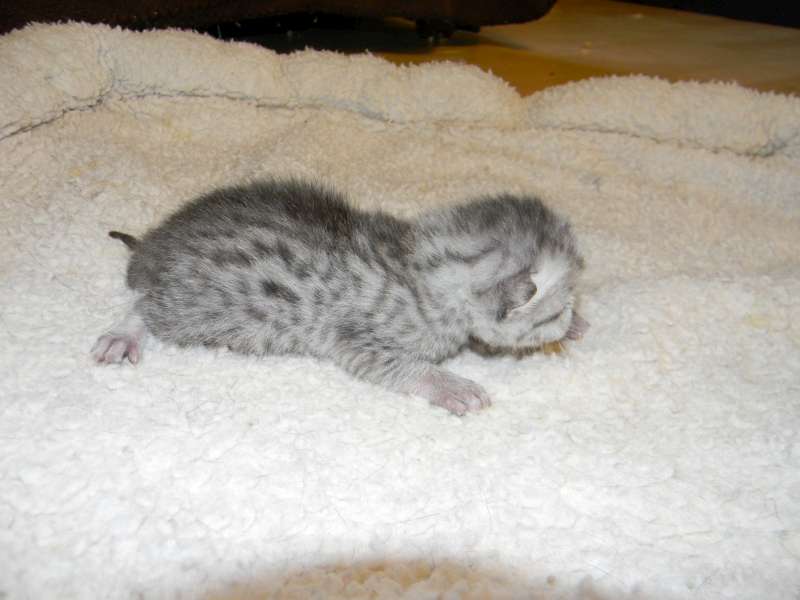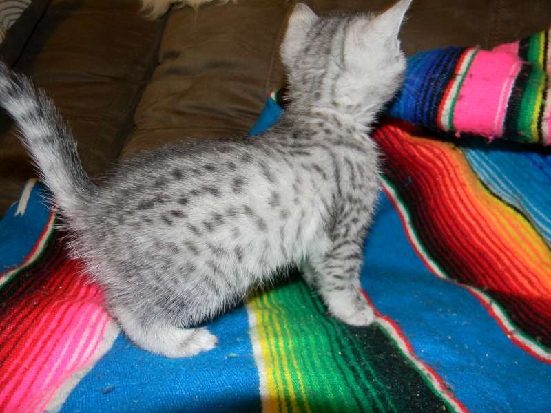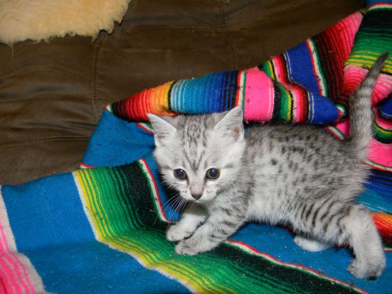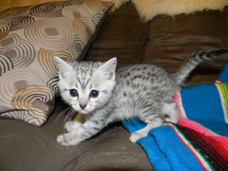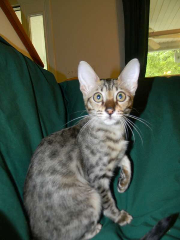 Zena is new in 2012 to our breeding program. She has a lovely pale clear silver coat with darker silver spots. She has a lovely wedge head and expressive eyes along with a winning personality. We are sure she will and some exceptional kittens to our fur family.