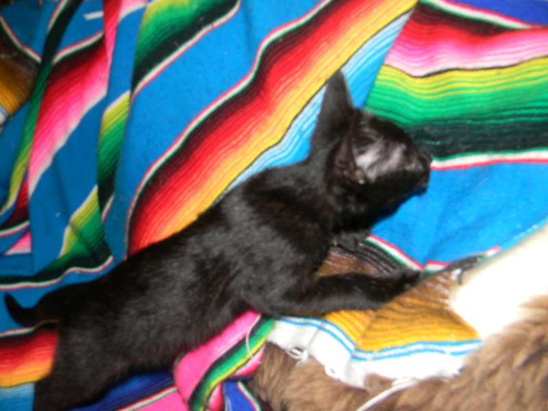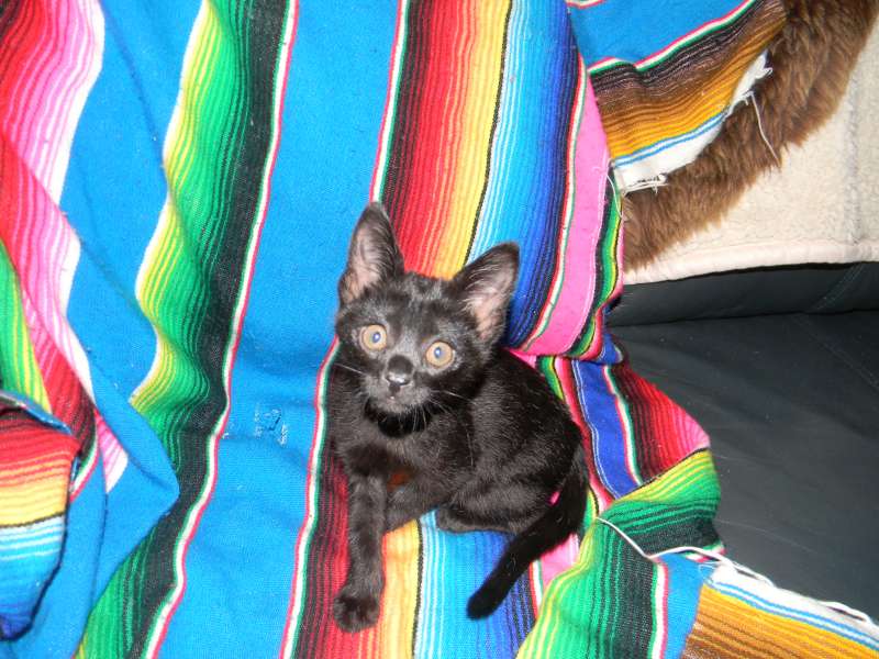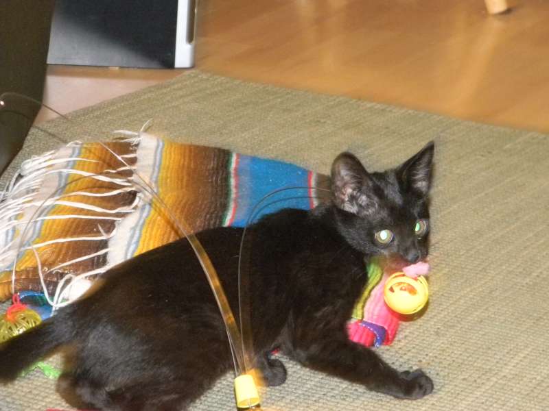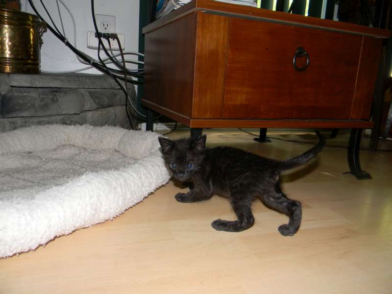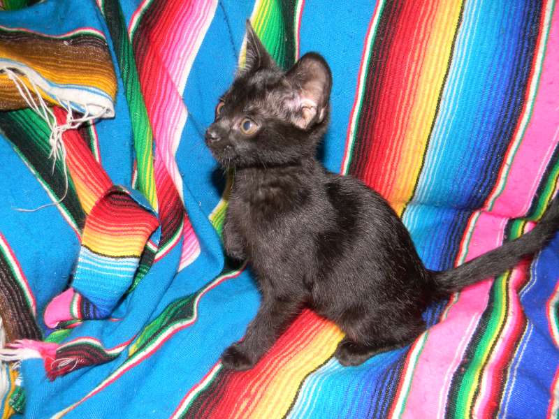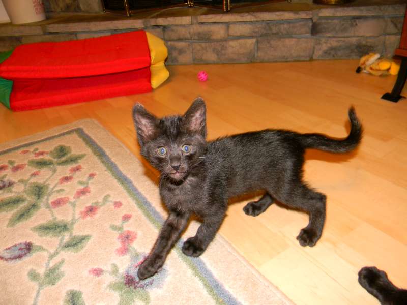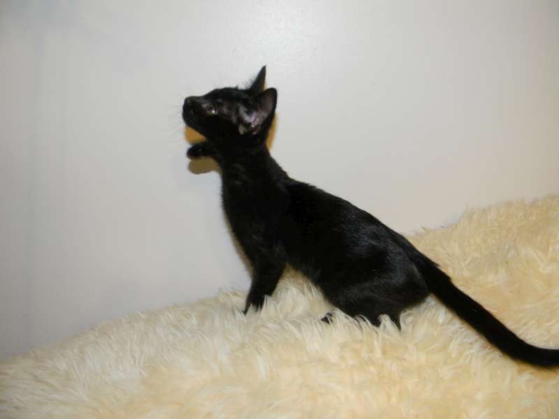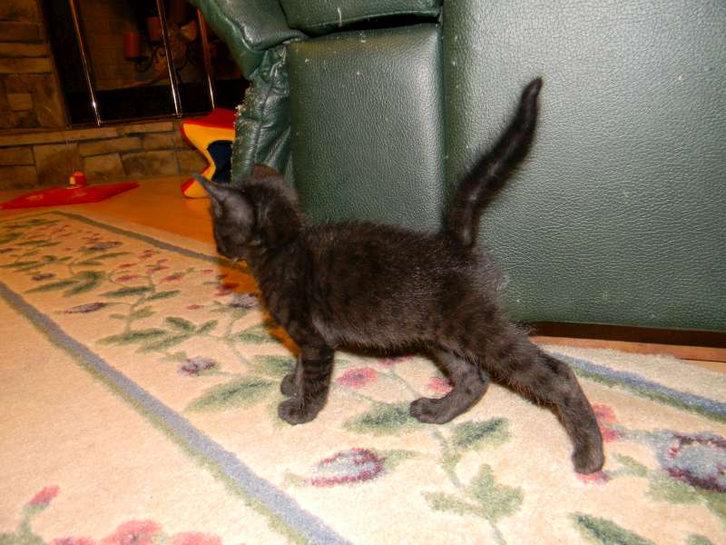 All legs and ears little Inky, F-2B Savannah female, is growing like a weed. She is starting to show her lovely black spots through her black coat.