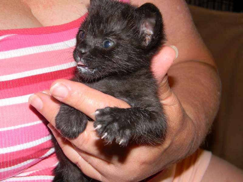 Little Inky has become the bold personality you would expect from a fully Human Imprinted baby. Black on Black Spotted and Purring on contact she is full of curiosity and fun.