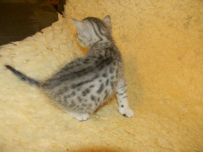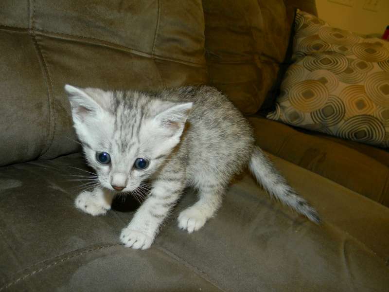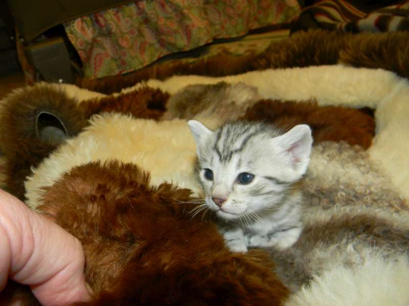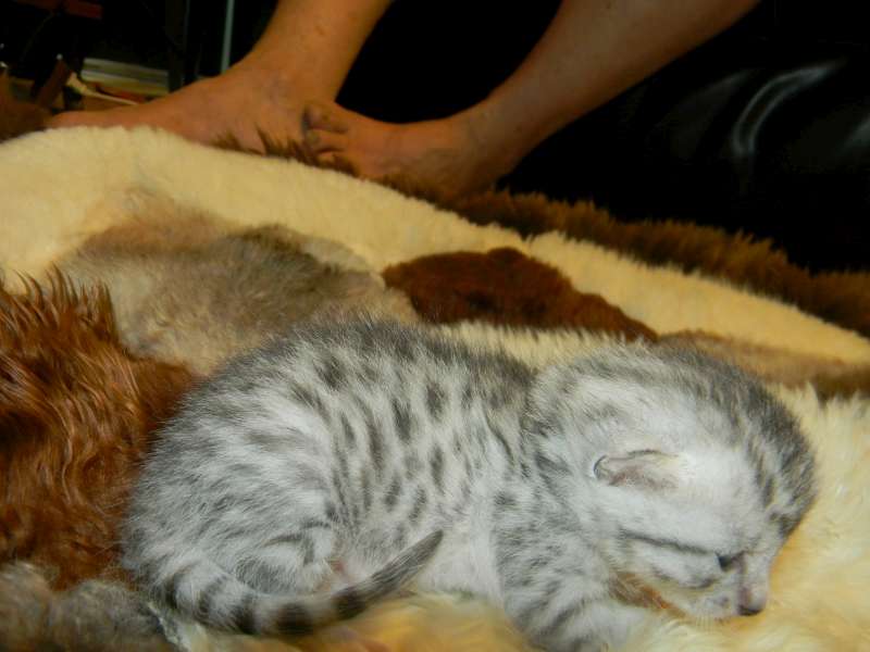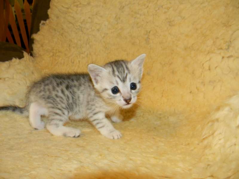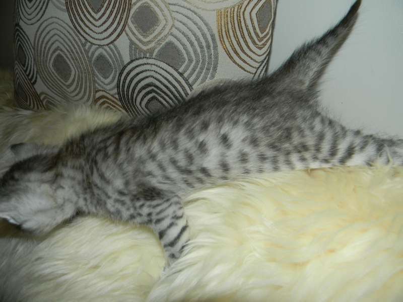 Zena is new in 2012 to our breeding program. She has a lovely pale clear silver coat with darker silver spots. She has a lovely wedge head and expressive eyes along with a winning personality. We are sure she will and some exceptional kittens to our fur family.