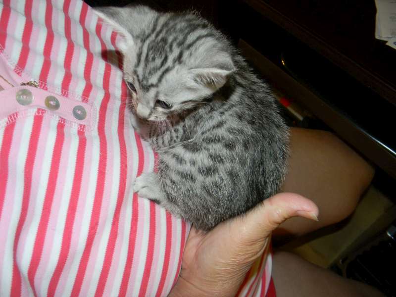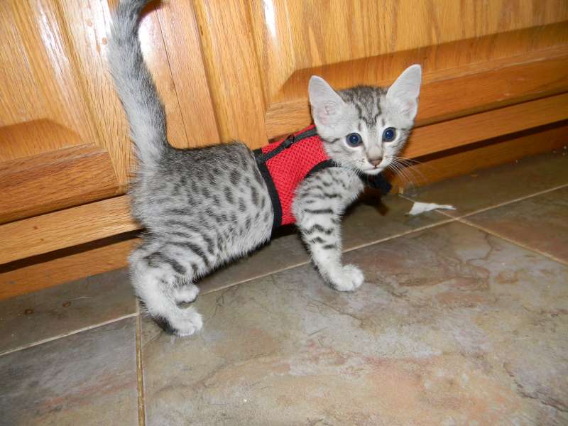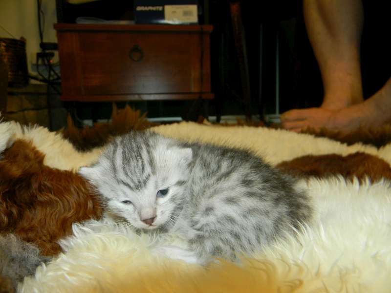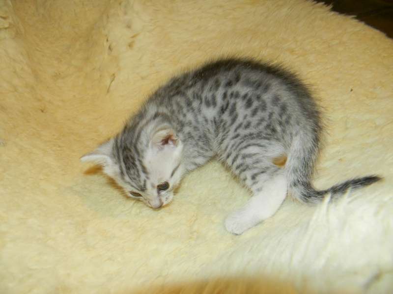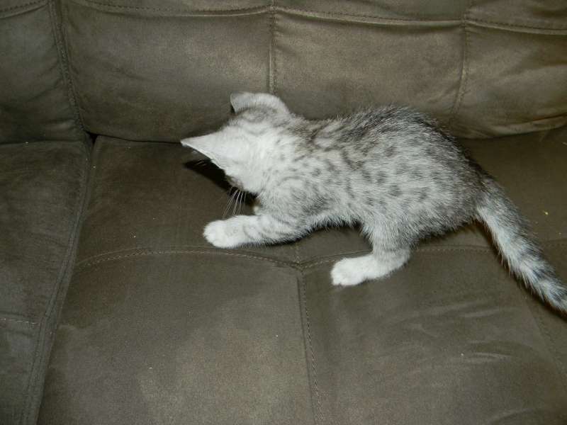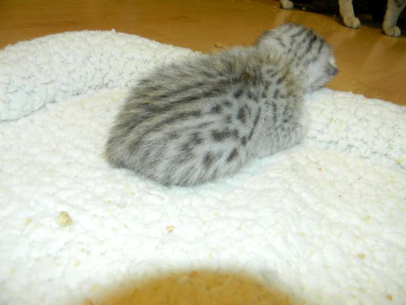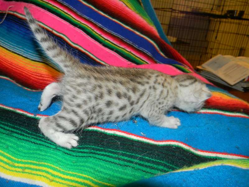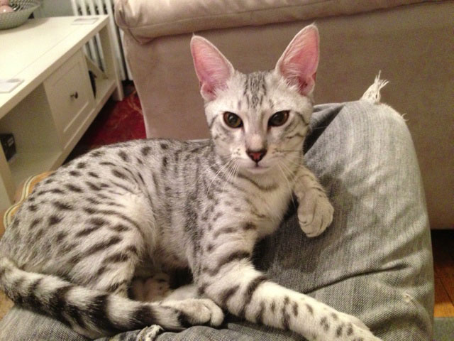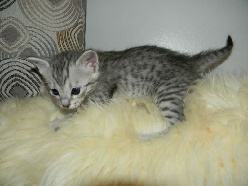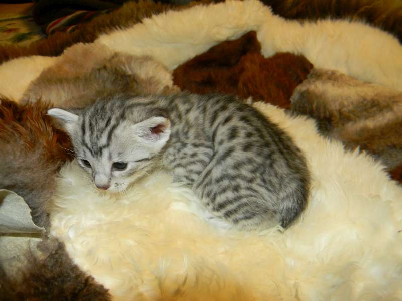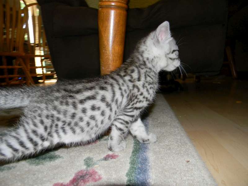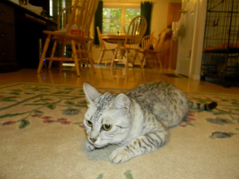 Zena is new in 2012 to our breeding program. She has a lovely pale clear silver coat with darker silver spots. She has a lovely wedge head and expressive eyes along with a winning personality. We are sure she will and some exceptional kittens to our fur family.