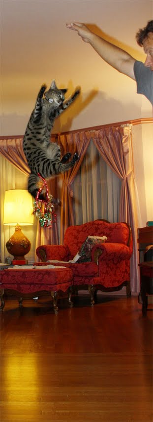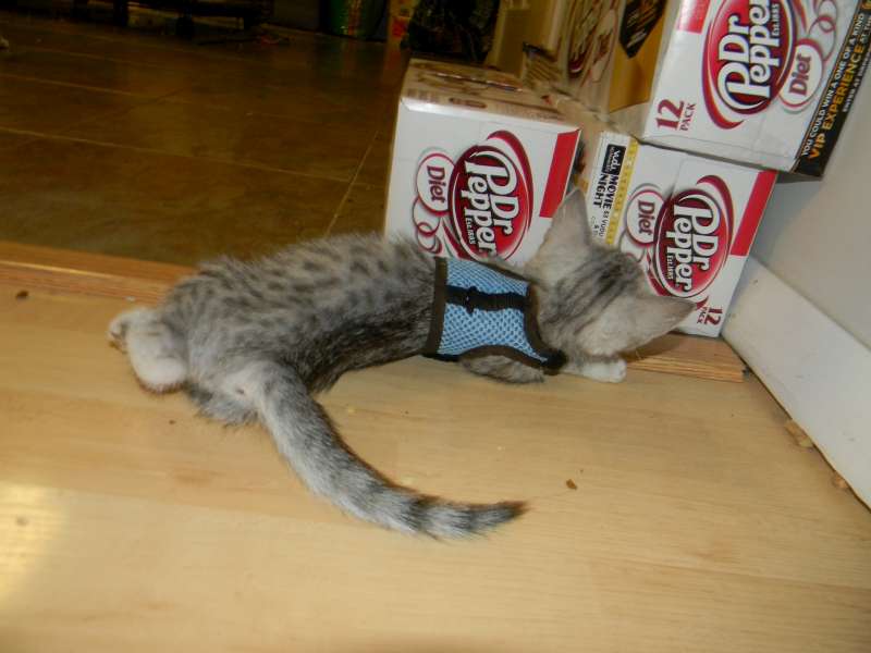 He is really growing now, a little over 14 lbs.He has quite the personality and is incredibly curious about everything that is going on. We had our plumber and furnace guys in this past week to do service work before winter sets in and they both said he was in the middle of everything they were doing. He even climbed into the plumbers tool box and was pulling out stuff and dragging it across the floor. I've also taught him to fetch. I can throw his toy almost anywhere and he goes and gets it and brings it back to me. He lays it down beside me, I can't get him to put it in my hand yet. He will only do it for me which aggravates my husband to no end.