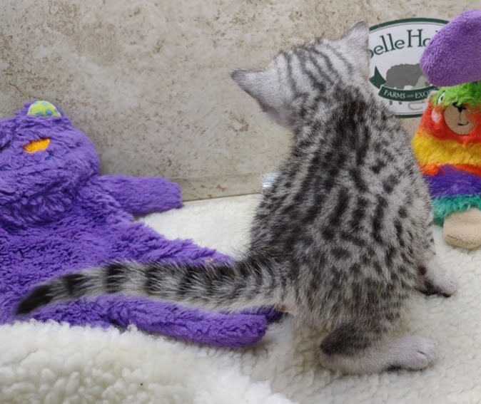 Black on grey and Red on gold spots makes the bi-color kitten a one of a kind non-standard savannah.