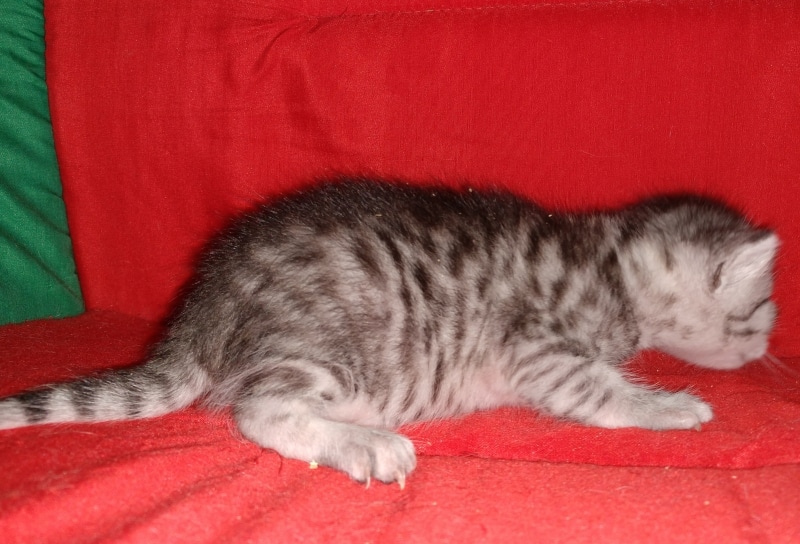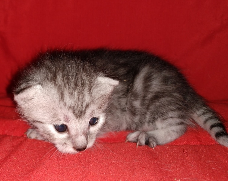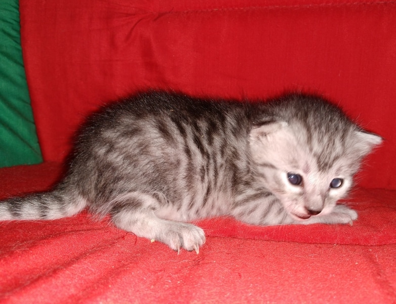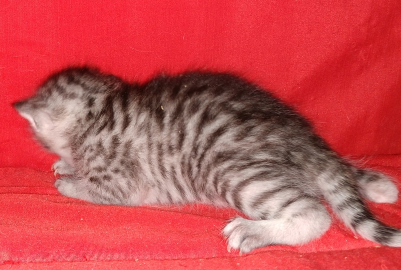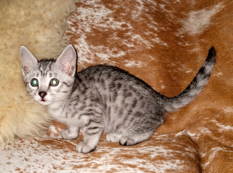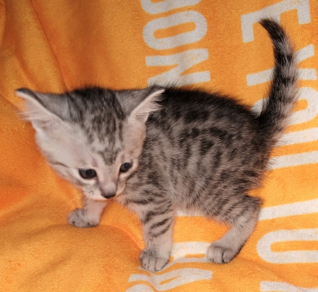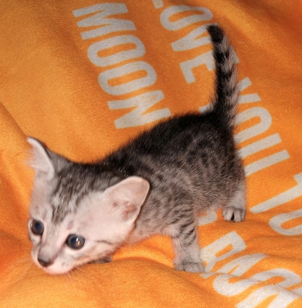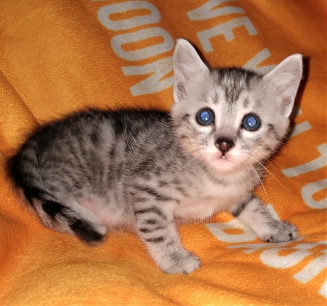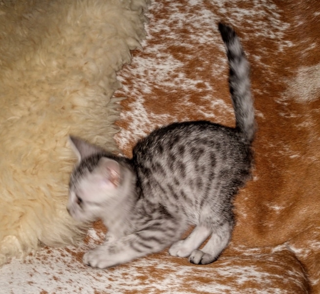 Egyptian Mau Silver female #2 DOB 6-5-20This silver sweet girl will make someone a loving and sweet companion. She will have good contrast and dark spots as an adult. She will be going home to OK with David. [Show slideshow]