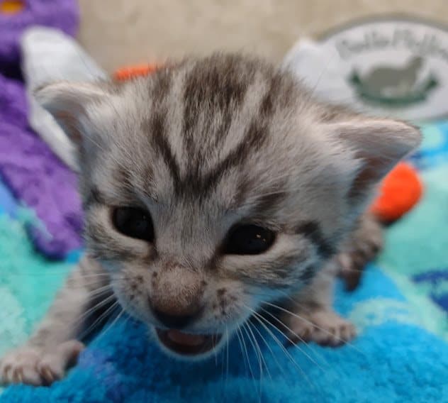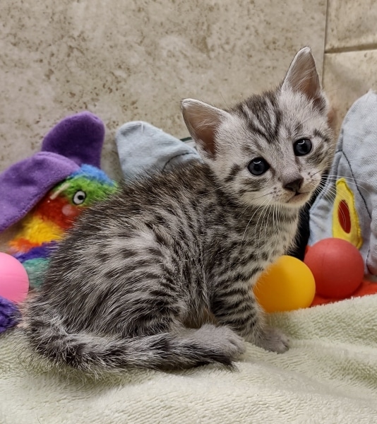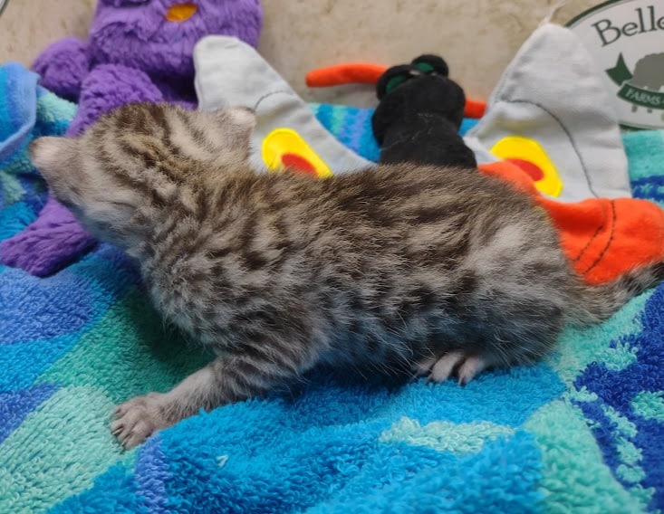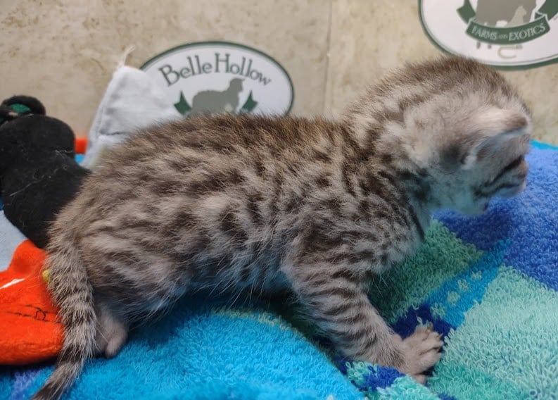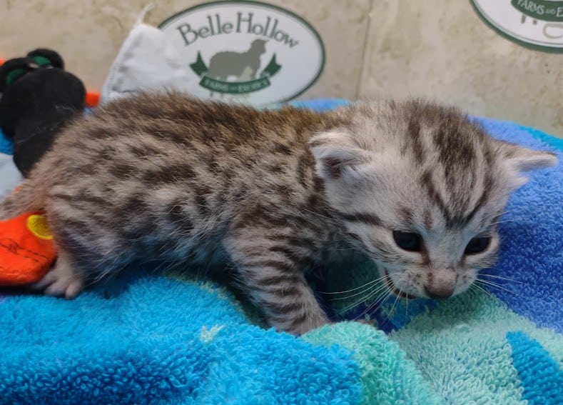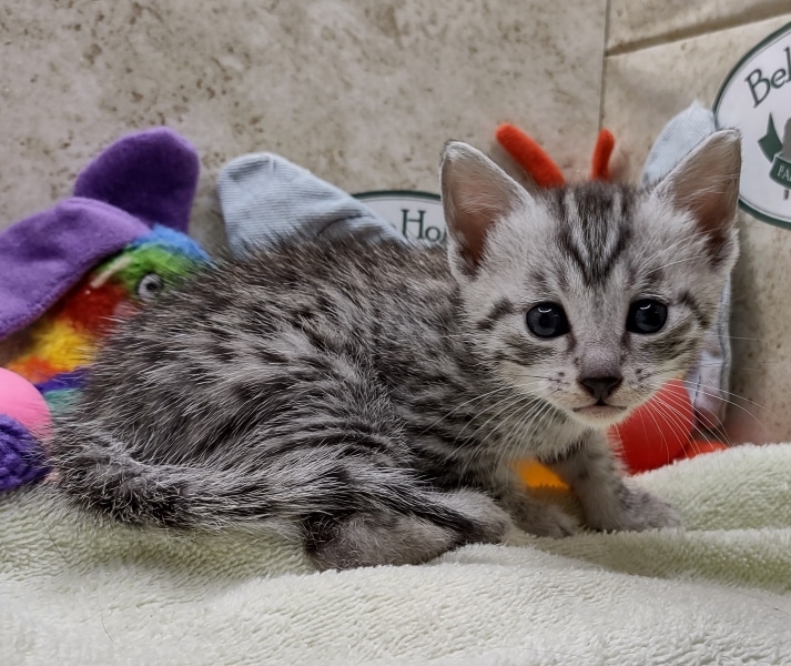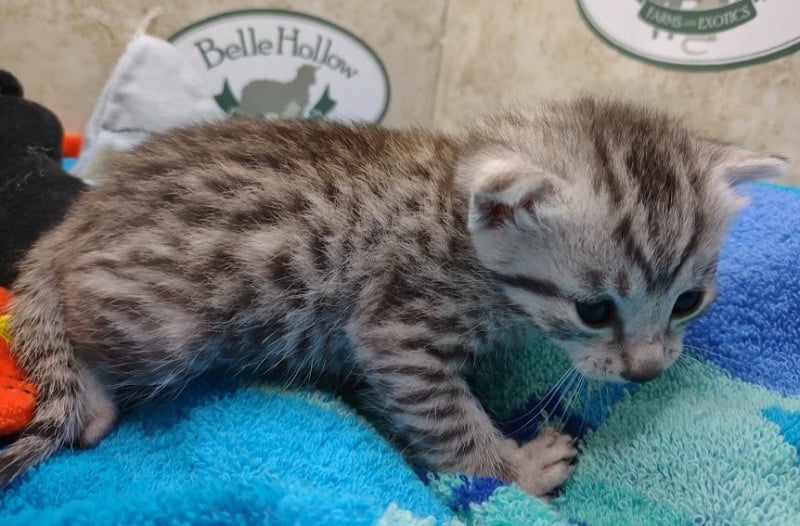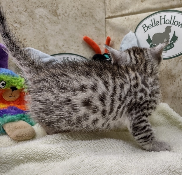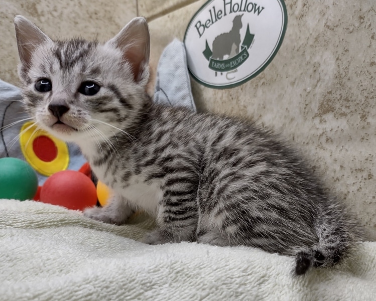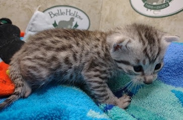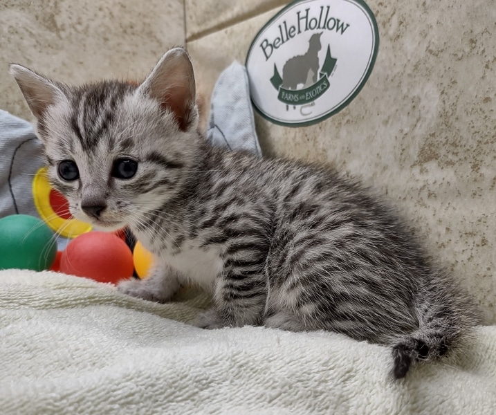 Egyptian Mau Silver Male #2 DOB 8-19-22What an exceptional companion this little Egyptian Mau boy will be. Born to love people this guy will be a beloved pet for Karin, James and family along with Seamus, an F-4SBT savannah boy, also from Belle Hollow [Show slideshow]
