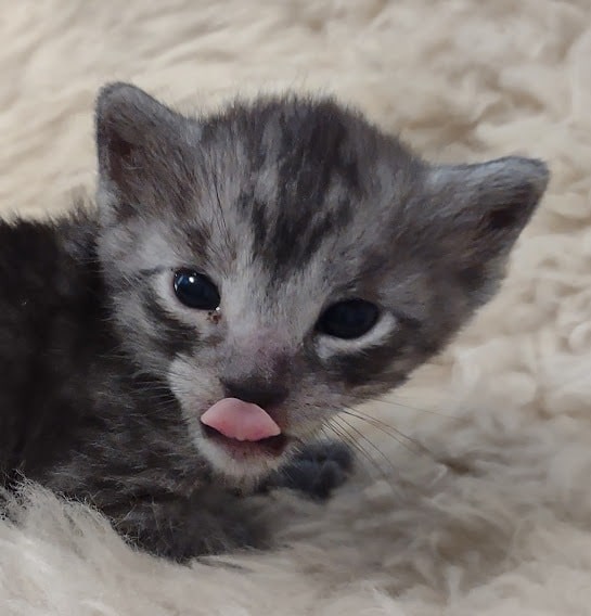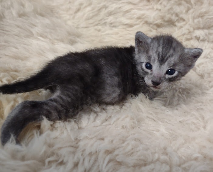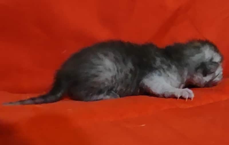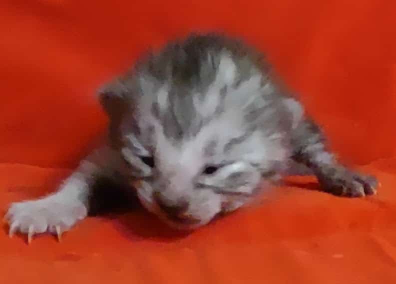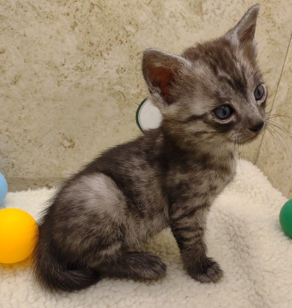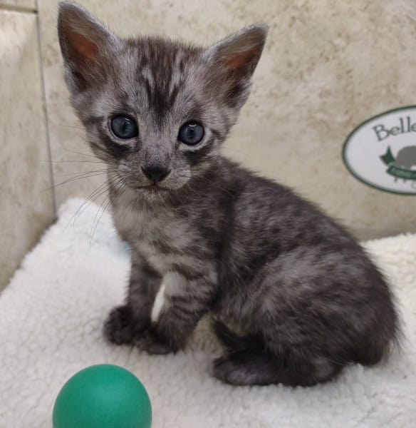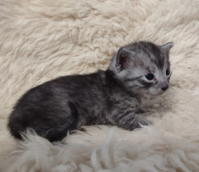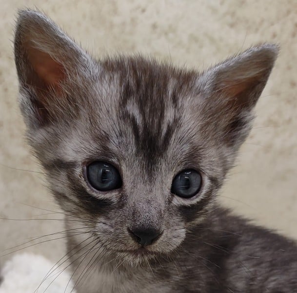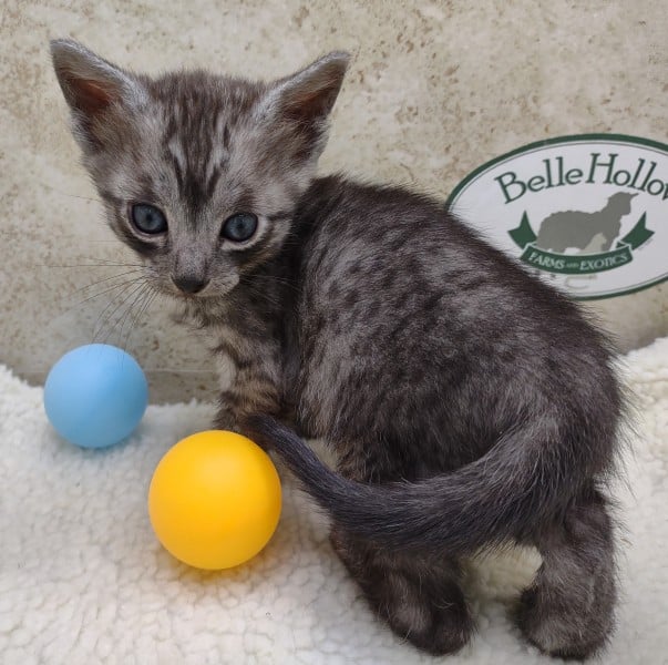Mau Smoke Male #1 DOB 2-21-23This fabulous smoke Egyptian Mau boy will make an extremely exotic looking and unique loving pet. Mau is one of the few breeds with this unique color pattern. He will be going home to Oliver in NY. [Show slideshow]