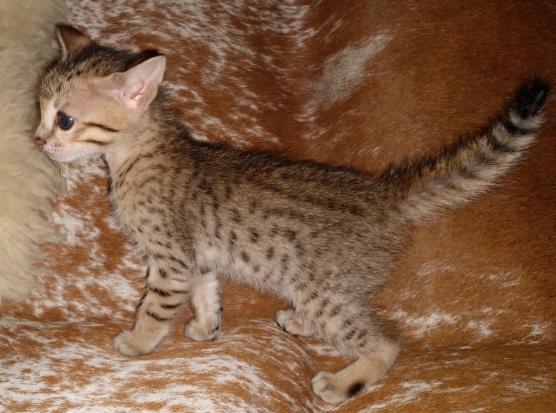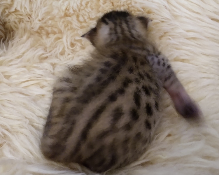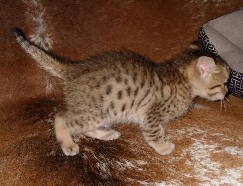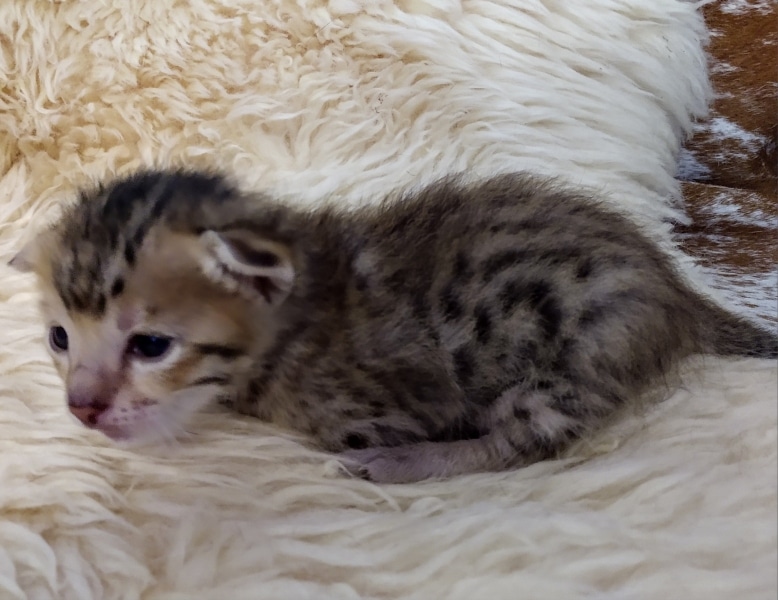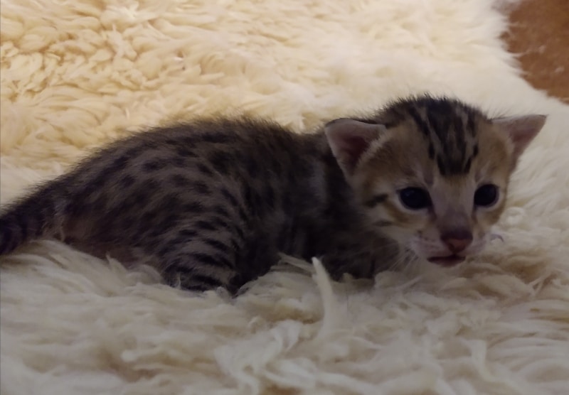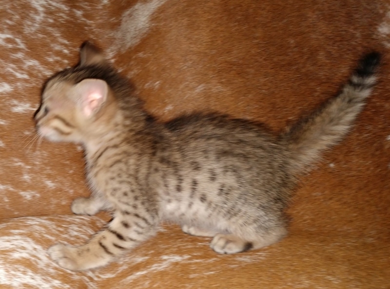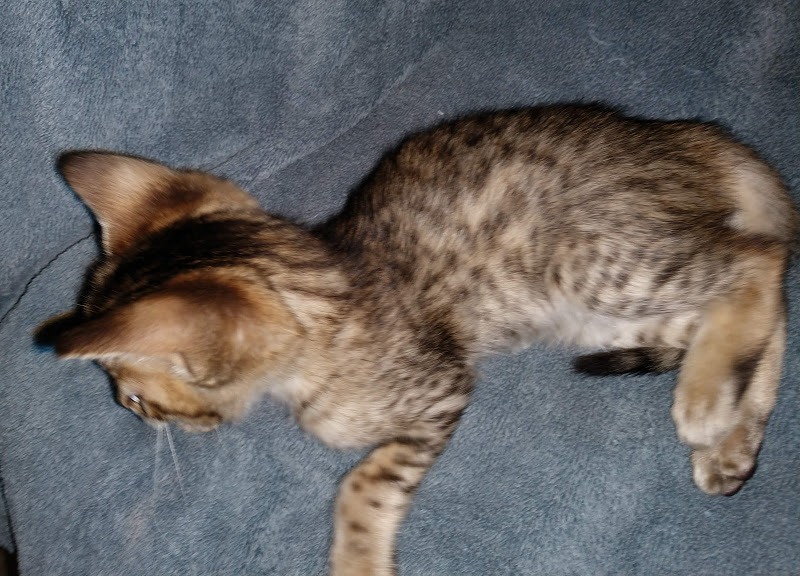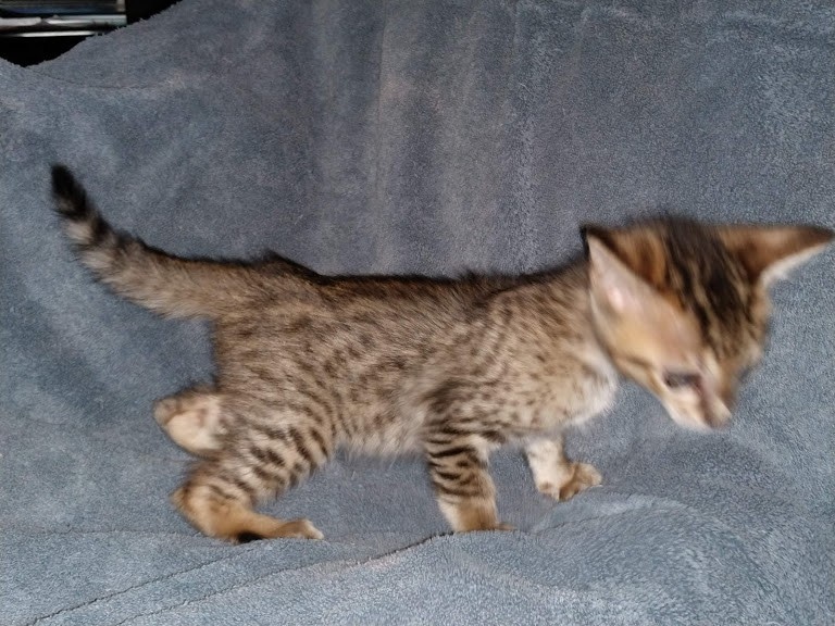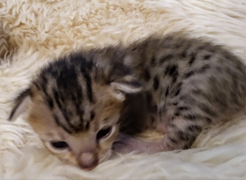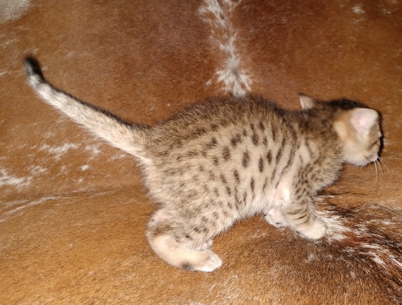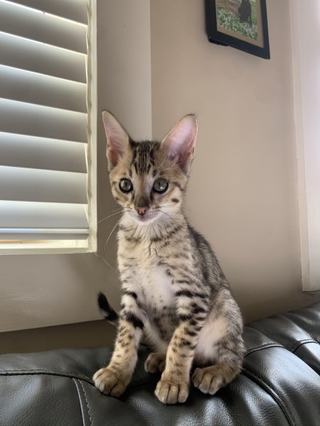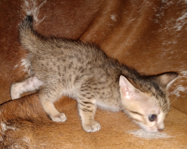 Savannah F-5SBT Male # 2 DOB 7-6-20This sweet Savannah boy will be a lovely adult and exceptional companion. At F-5SBT he is eligible for show in TICA. He will be going home to Patricia in SC [Show slideshow]1 2 ►