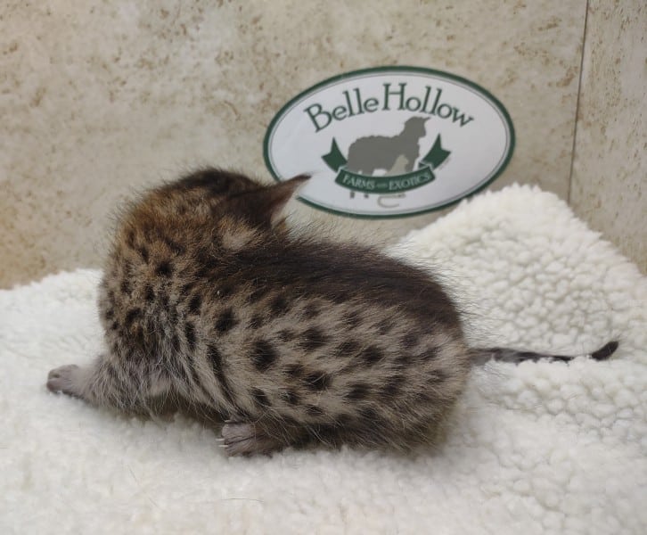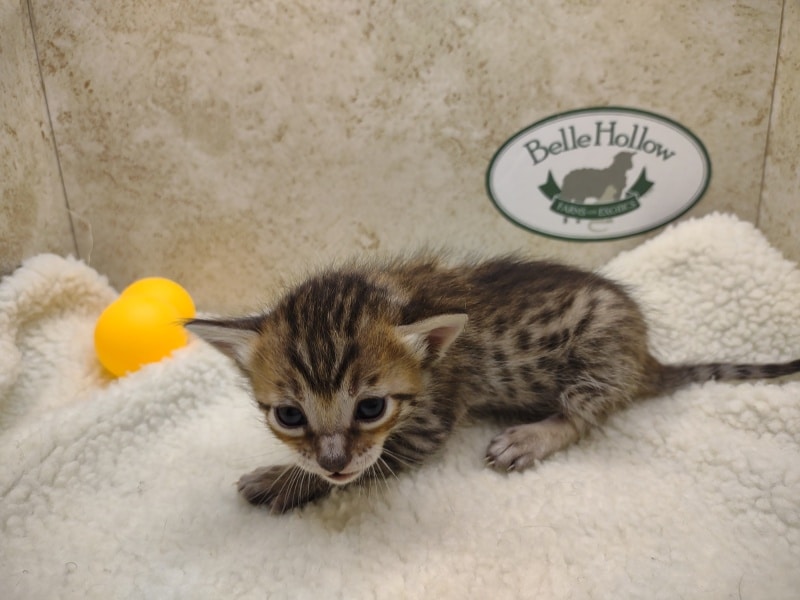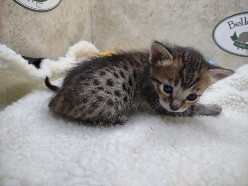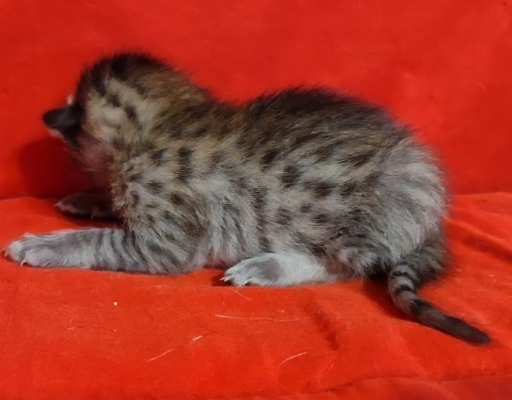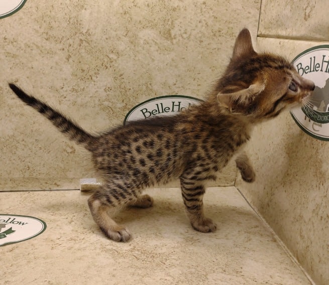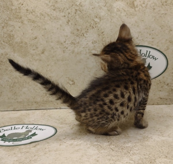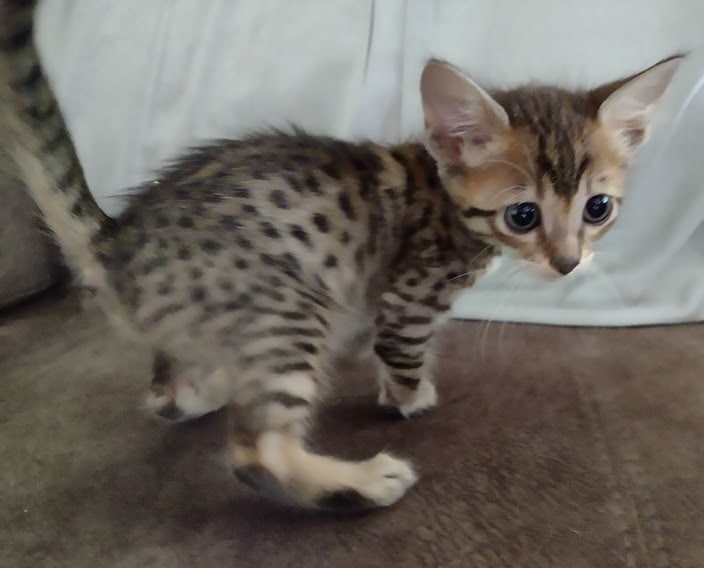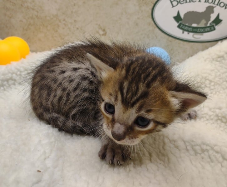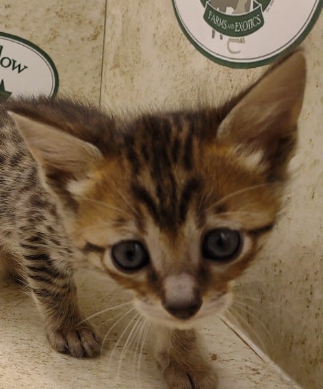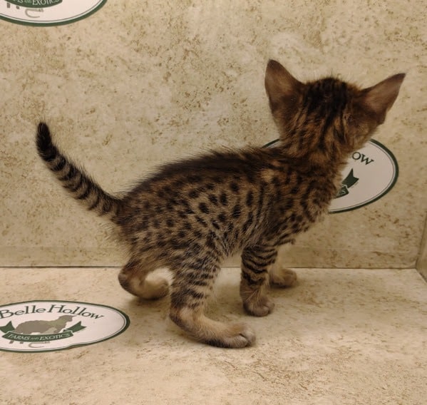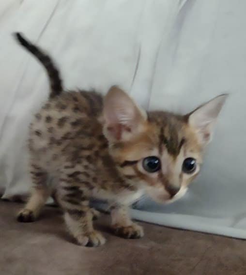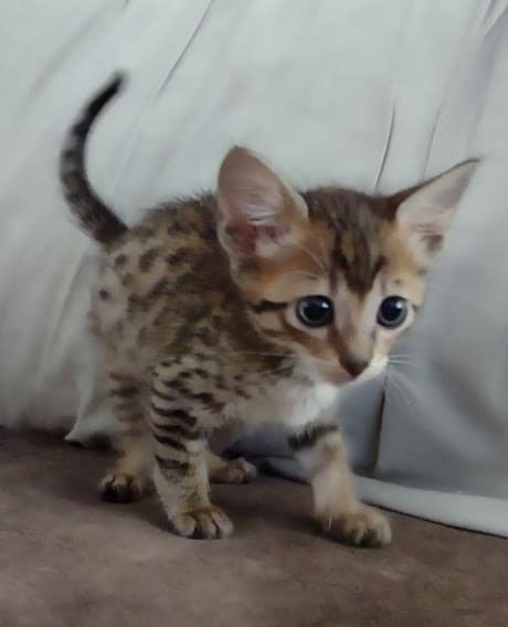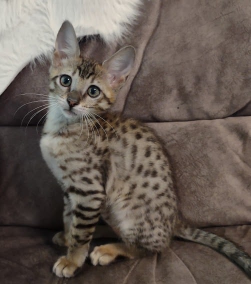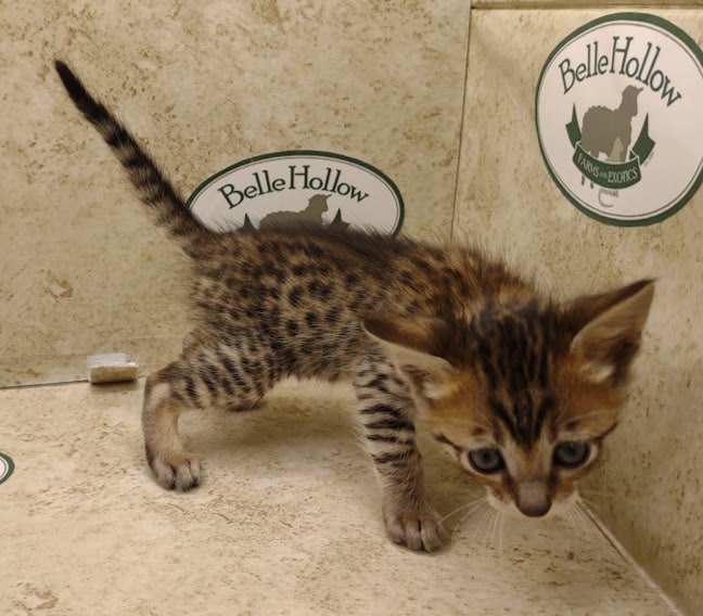 Savannah F-6SBT BST Female DOB 3-10-23This precious Brown Spotted savannah girl will be a wonderful loving friend and companion. She is a real character. She and her sister a snow girl will be going home to Tracy, Brian and their children. [Show slideshow]1 2 ►