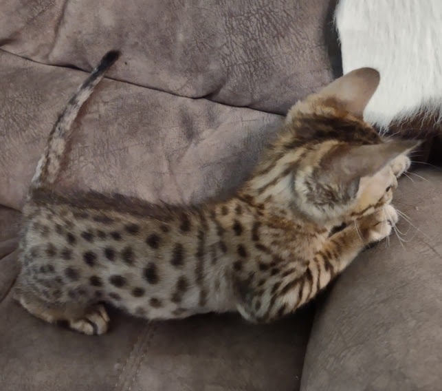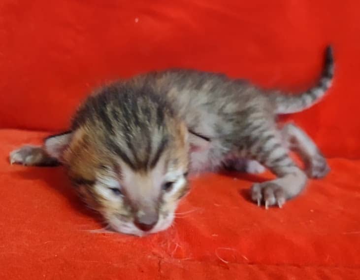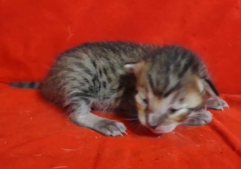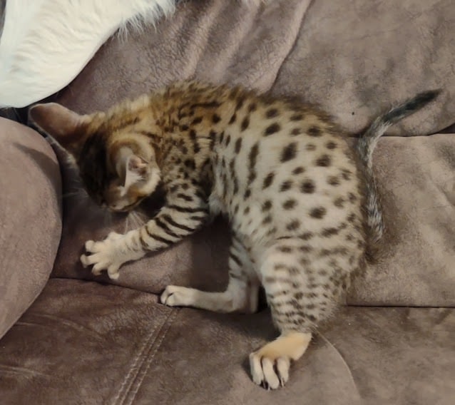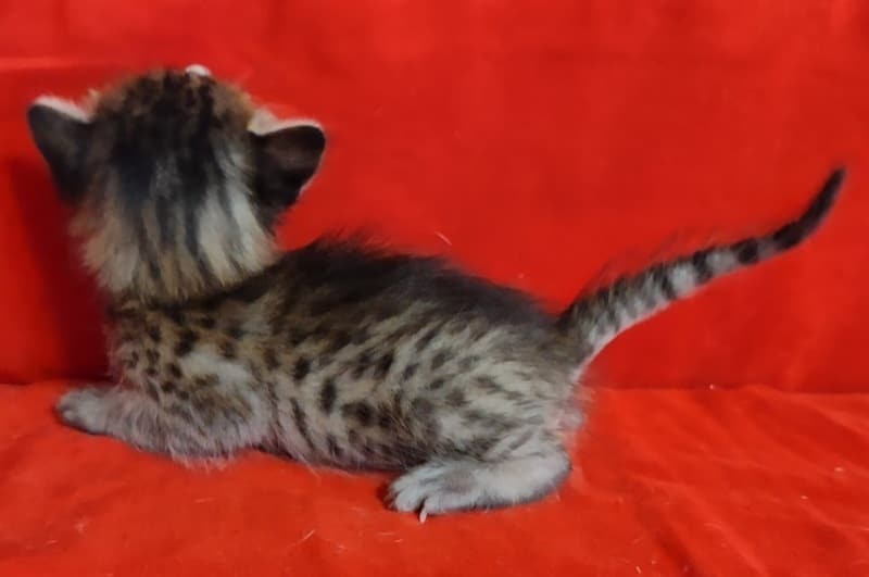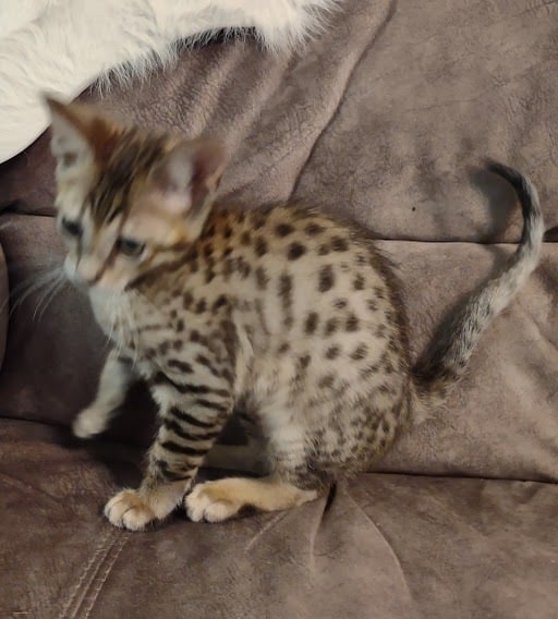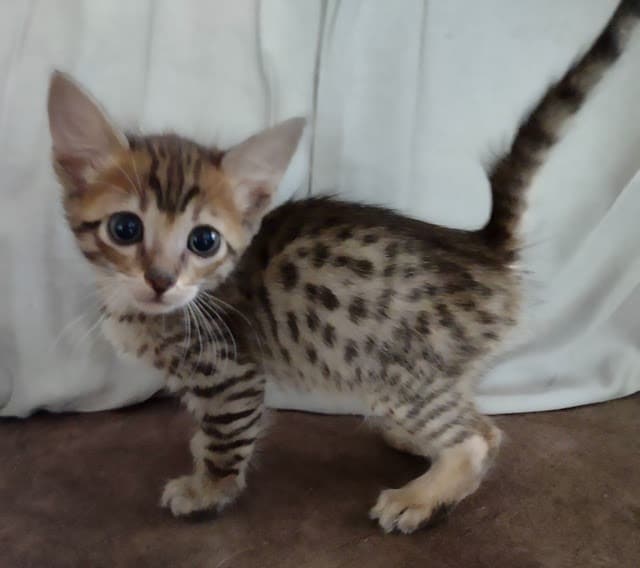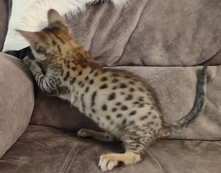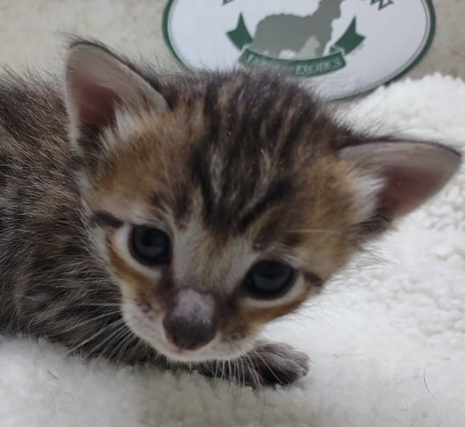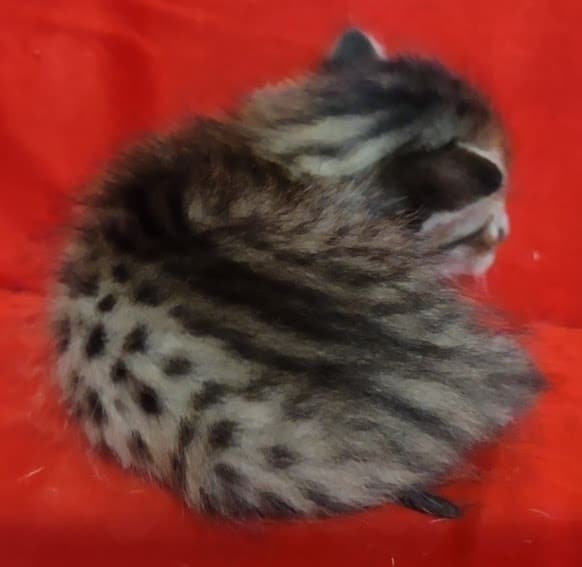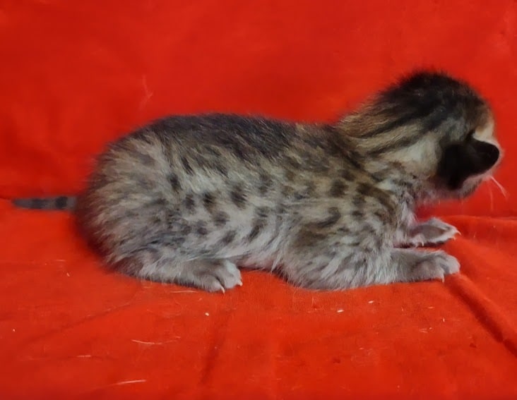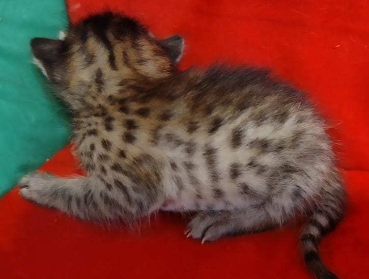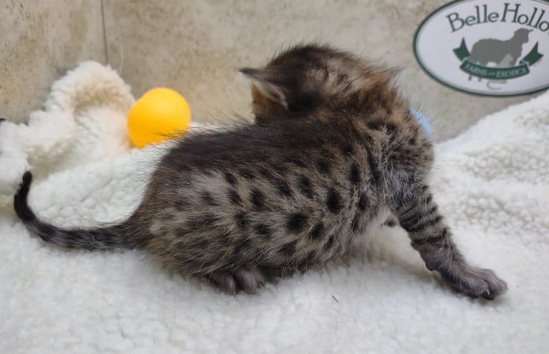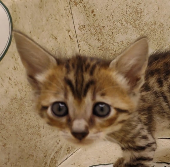 Savannah F-6SBT BST Female DOB 3-10-23This precious Brown Spotted savannah girl will be a wonderful loving friend and companion. She is a real character. She and her sister a snow girl will be going home to Tracy, Brian and their children. [Show slideshow]1 2 ►
