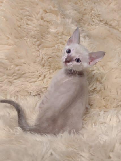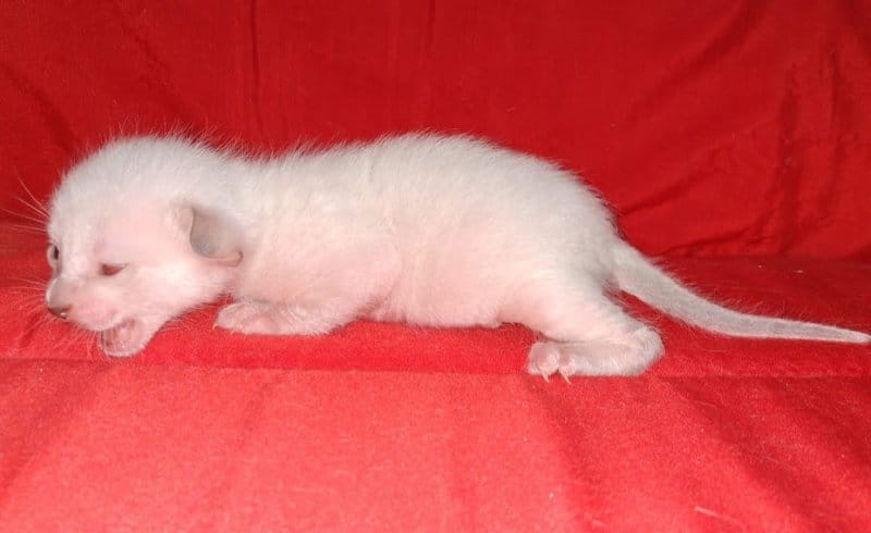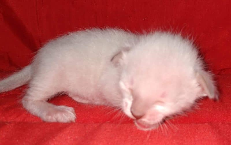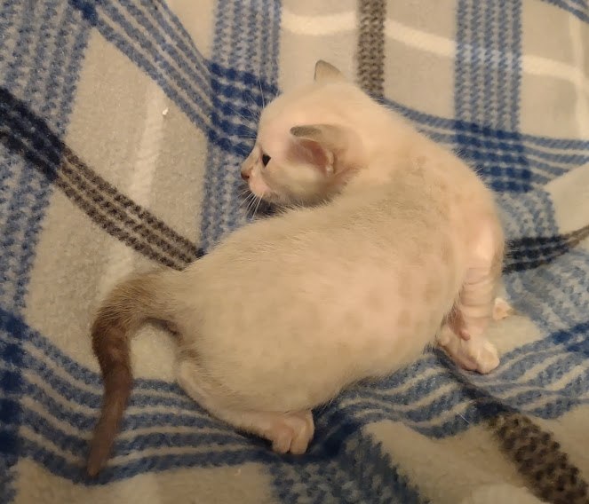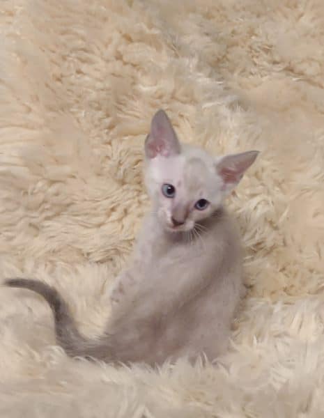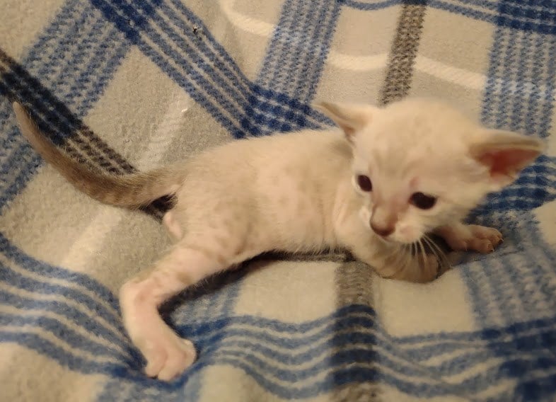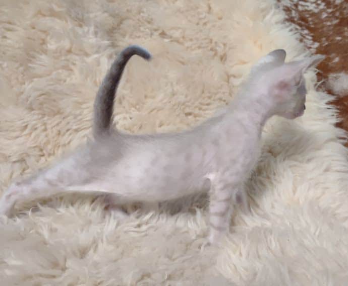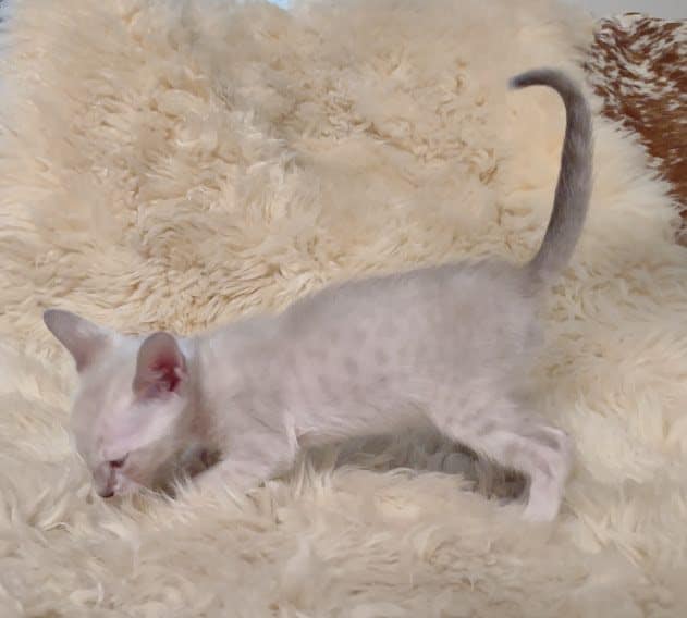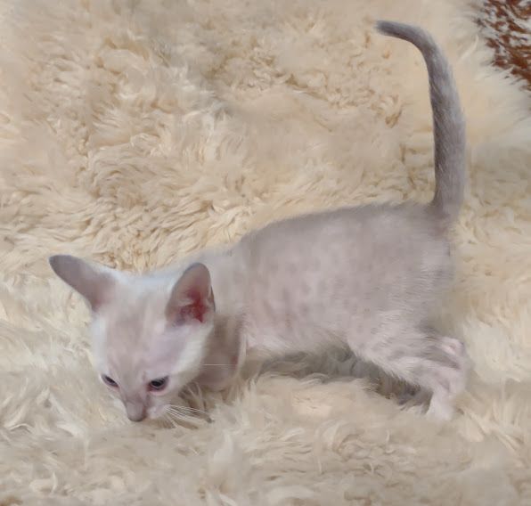This little snow savannah is the lightest of the males at this time. It's impossible to know if he will stay that way but he will have beautiful Blue eyes and Lynx Point marking on his ears, tail, feet and spots. You can see the shadows of his color just starting on his ears and body spots. He will be going home to Joanna in IL.