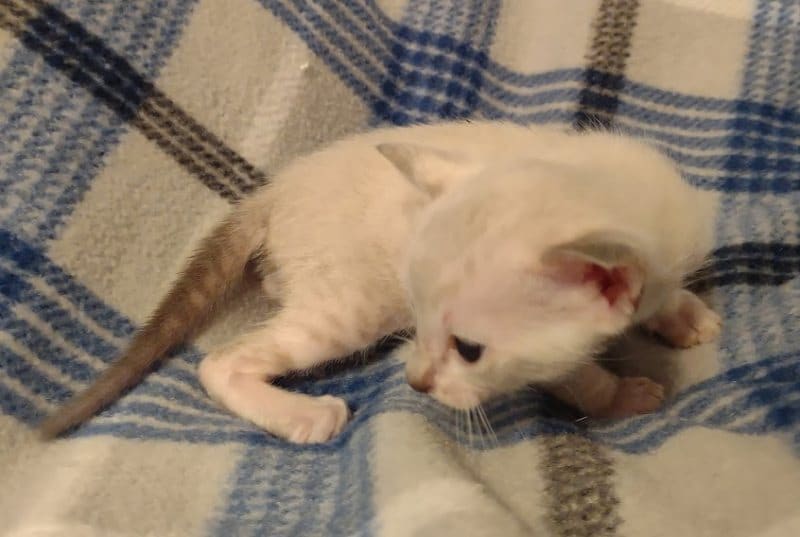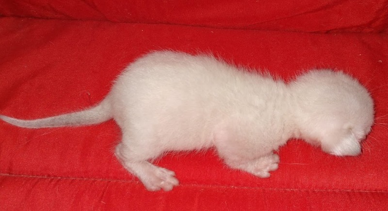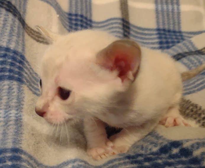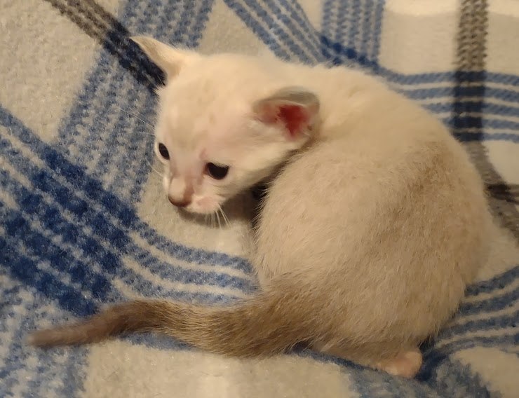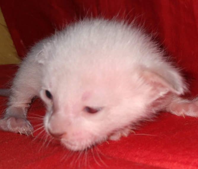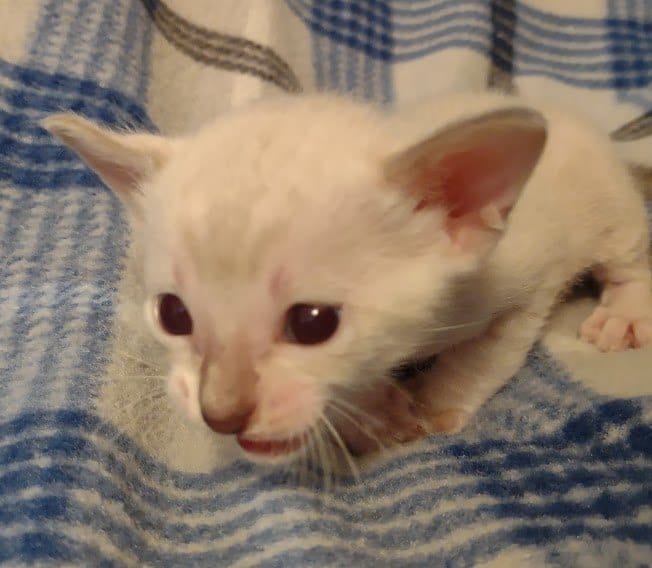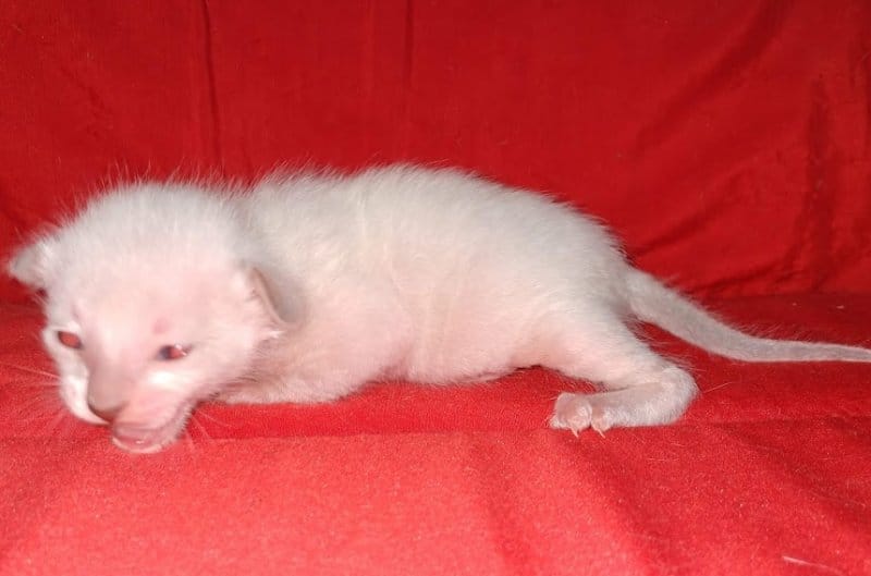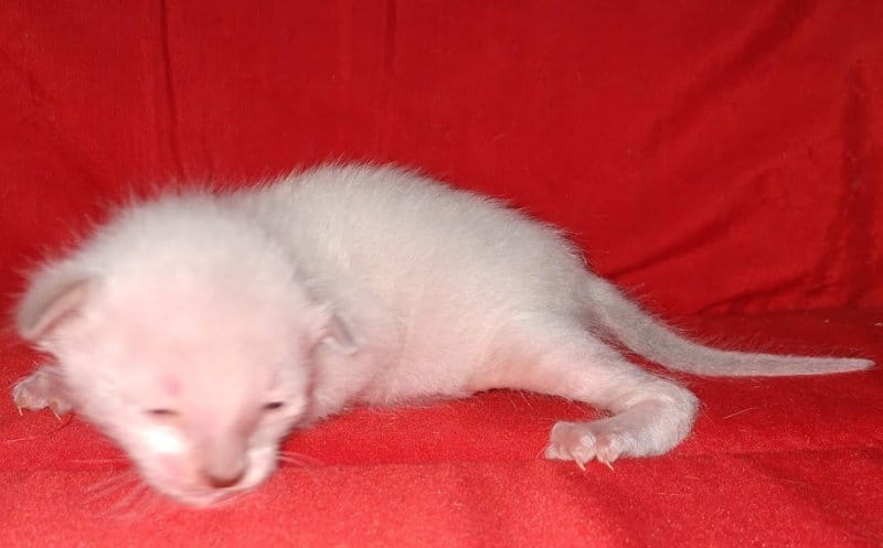 This little snow savannah is the lightest of the males at this time. It's impossible to know if he will stay that way but he will have beautiful Blue eyes and Lynx Point marking on his ears, tail, feet and spots. You can see the shadows of his color just starting on his ears and body spots. He will be going home to Joanna in IL.