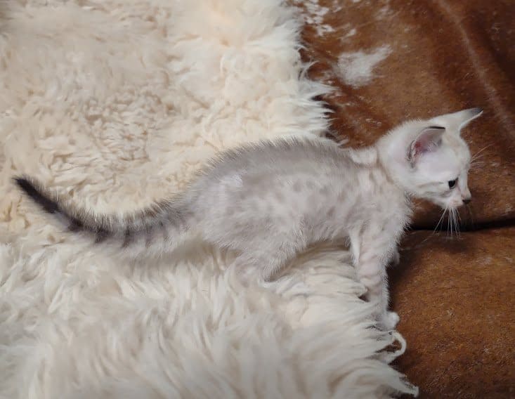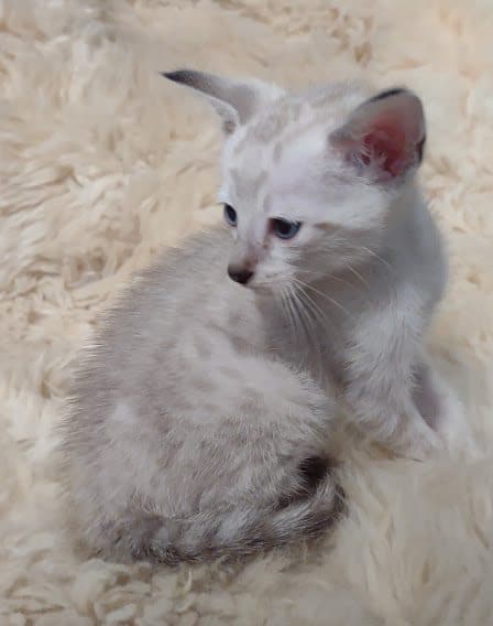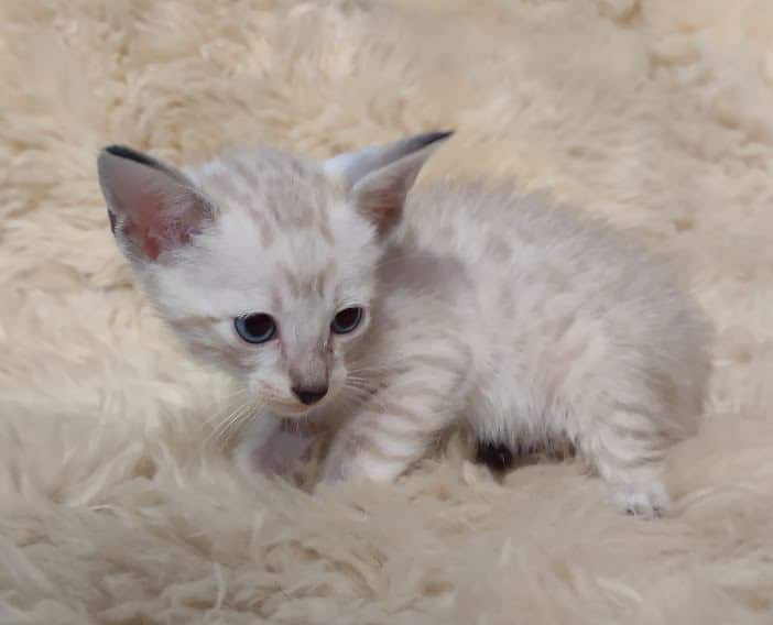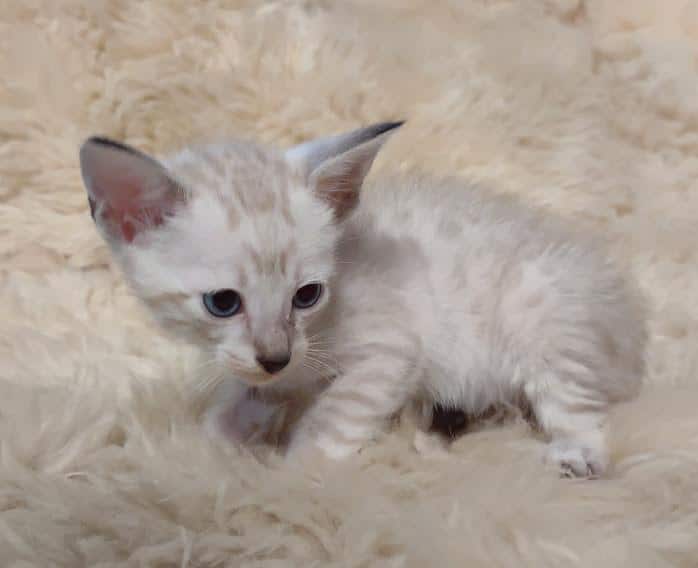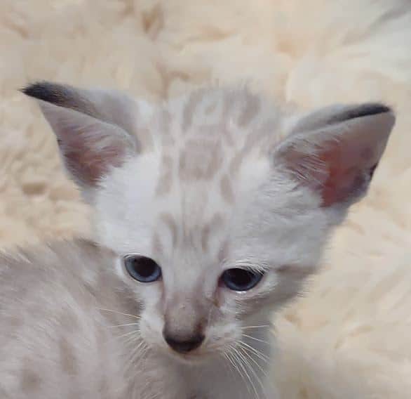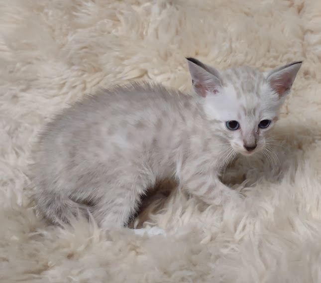 Snow savannahs are so unique. The lovely spots of savannah but the color points and blue eyes you find in siamese cats. Born white their color comes in as the grow and age with many not reaching their final color for 2 years. This boy will be stunning and a wonderful loving companion to Thomas and Flavia in SC where he joins another Belle Hollow girl.