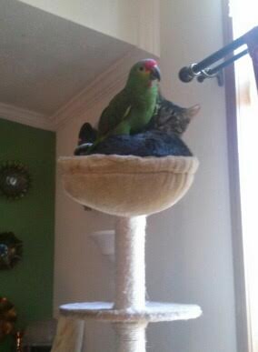 The pictures is of him in his tower basket with his friend my amazon parrot cupid they are best buds