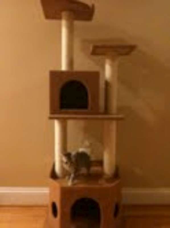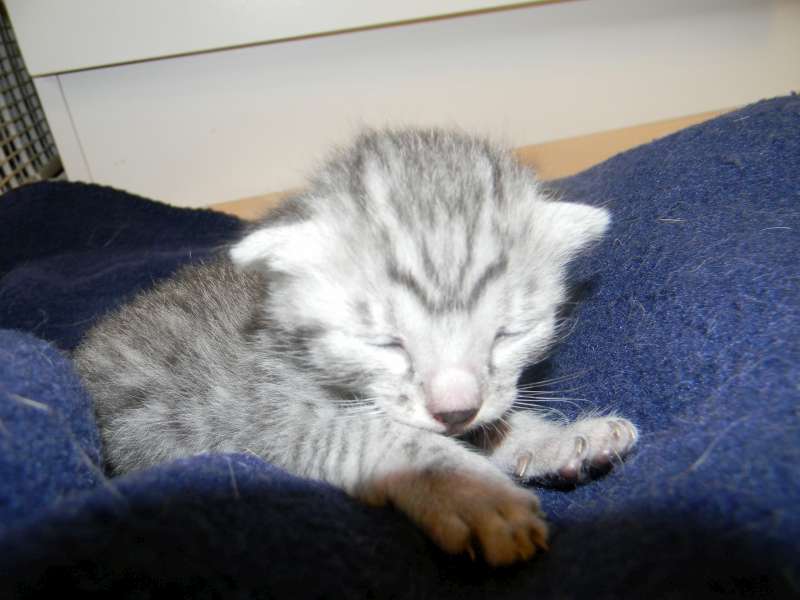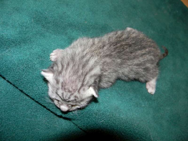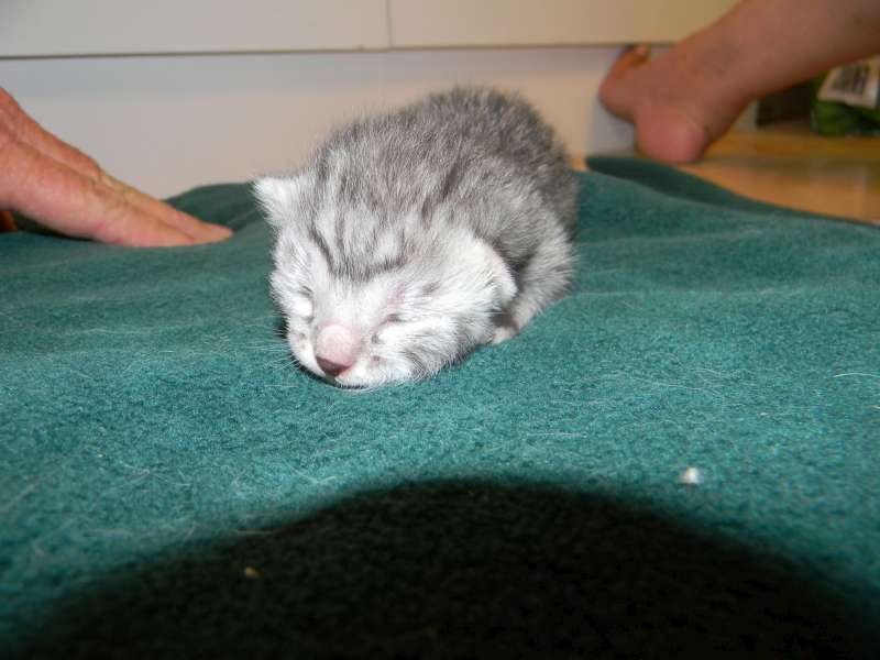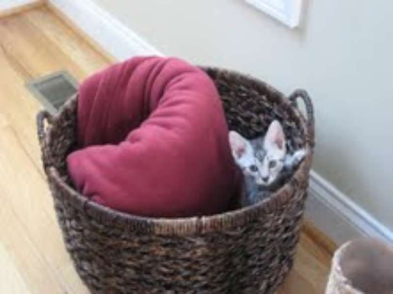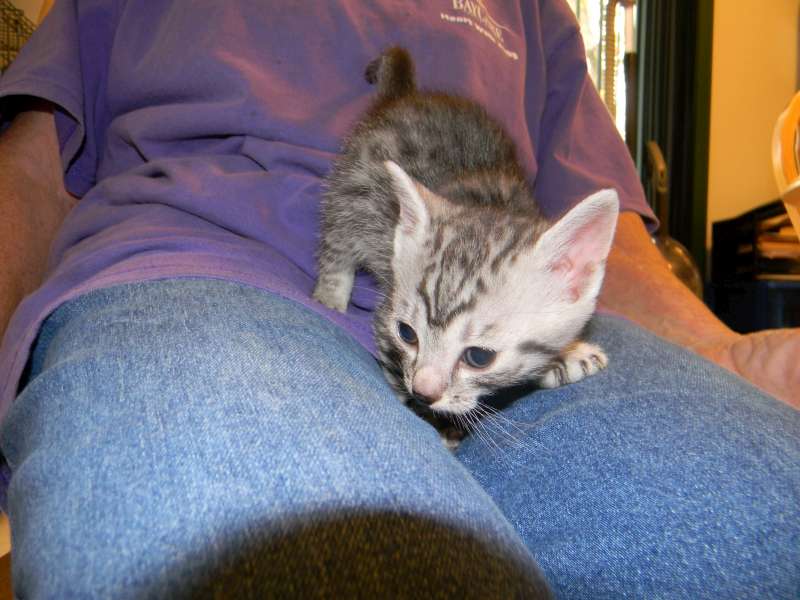 His first week home he was shy but still playful and interactive with people. Soon after his first week he gained quite a bit of confidence and has been ruling the house ever since! He likes to stick close beside us and enjoys play time together. He seems to want to find every nook and cranny in the house (especially ones we try to keep him out of)! He is also very much a snuggler and purrs constantly. He is eating up a storm and getting bigger everyday.