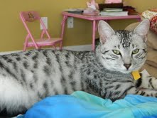 Cairo – Silver Male DOB 7-17-11This beautitful Silver Egyptian Mau kitten will e going to live with Mari in Tennessee! This tiny little 4 day old silver Egyptian Mau boy will grow to be a beloved family member What great spots at only 5 days old! Just watch me grow! Check out the spots on this little guy at Just over 2 weeks! Just another Beautiful face! I have attached photos of our wonderful, adorable, headstrong son. He has trained us well. We can no longer leave the bathroom door open due to his love for playing with the toilet paper. I'm happy to report, Cairo is doing well and is a wonderful cat. He also trained us never to leave any food on the table or counter. We are much neater family do to Cairo's strict training. [Show slideshow]