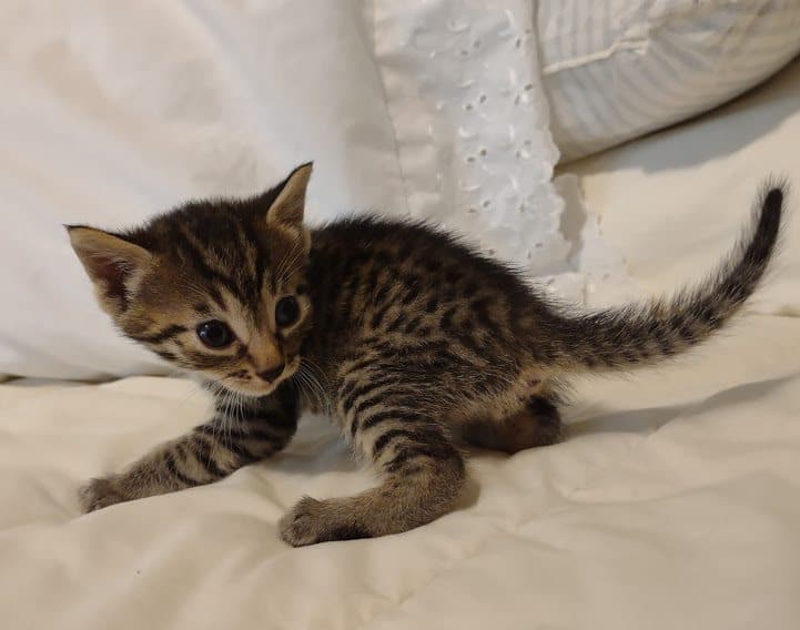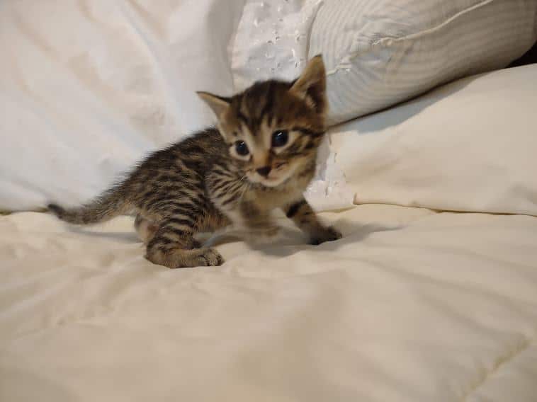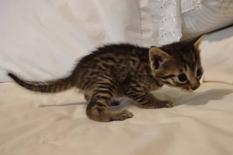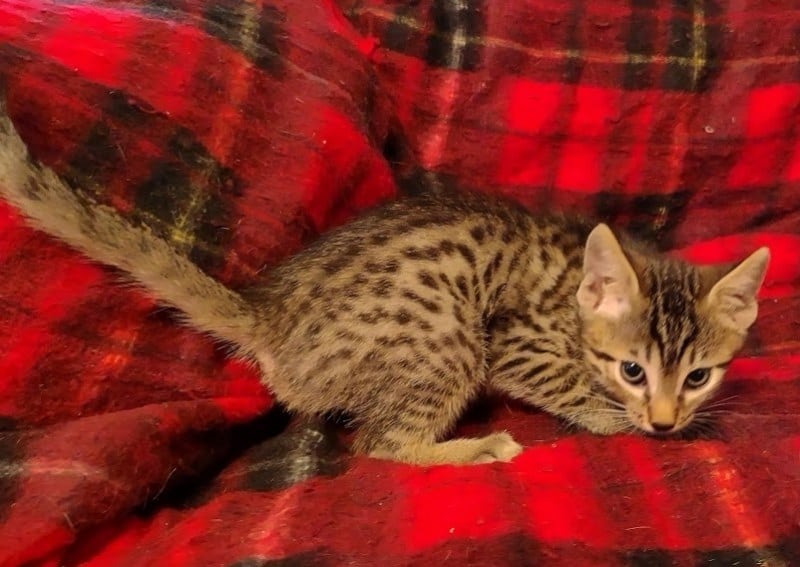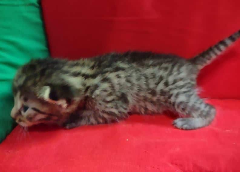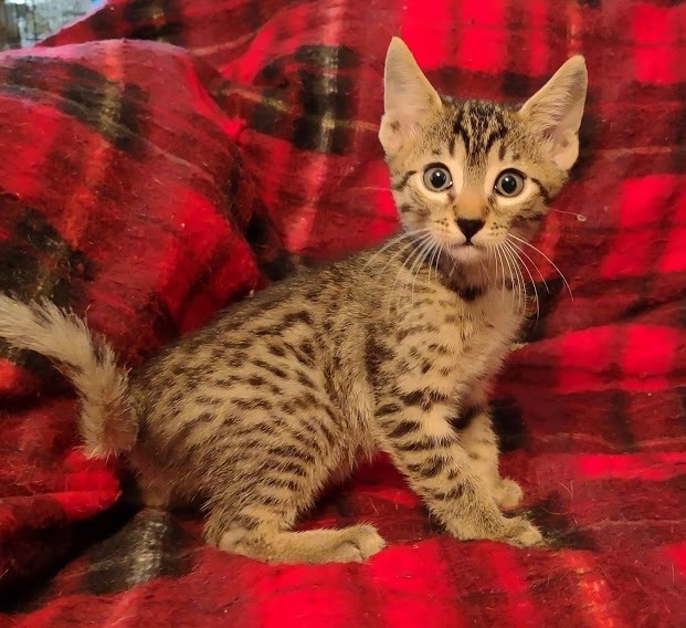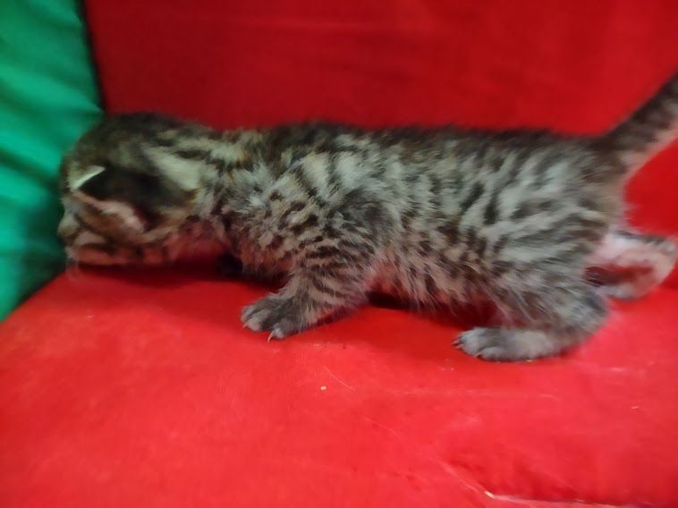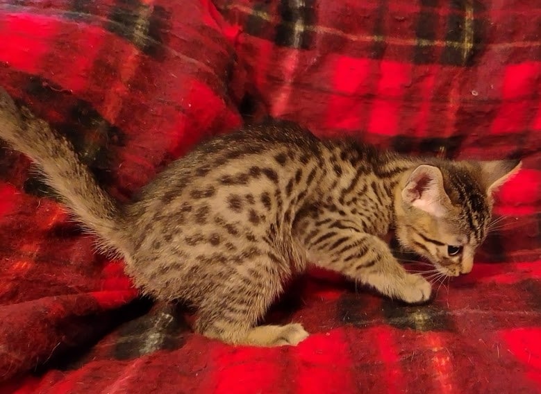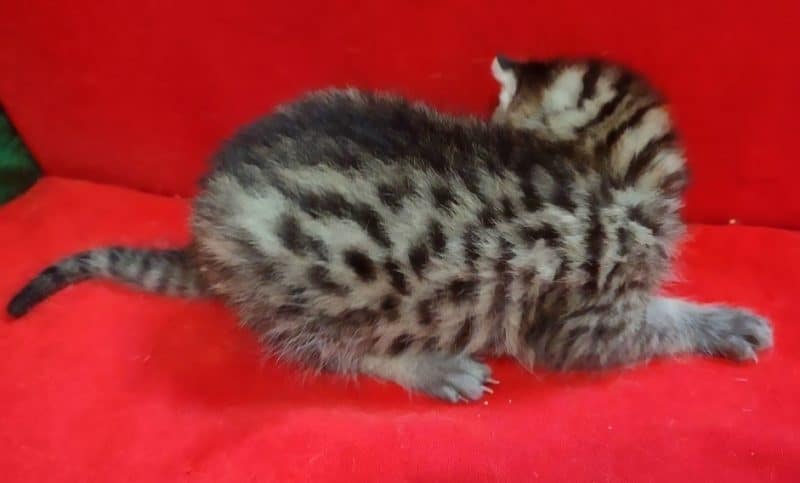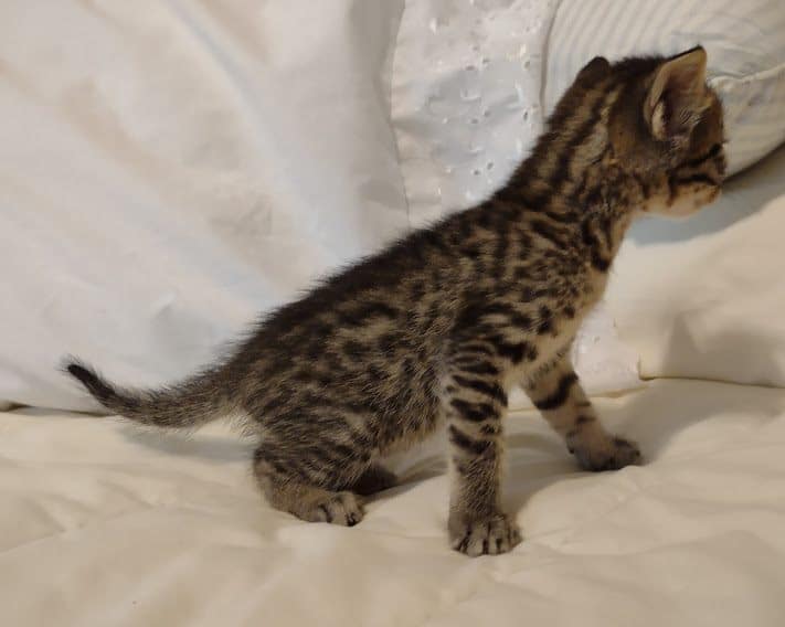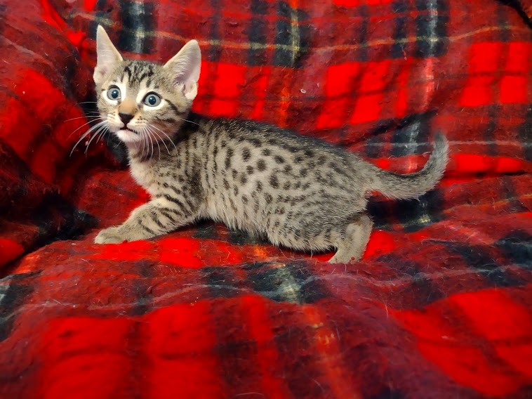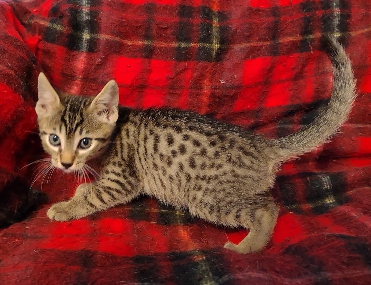 Egyptian Mau Bronze Male #1 DOB 5-11-21This bronze Mau boy is a cooler color which means he has more silver in his coat and will have less golden tones than his brothers. He has excellent spots and will be a stunning adult cat and an excellent and loving pet. for Akzhan and family in FL. [Show slideshow]