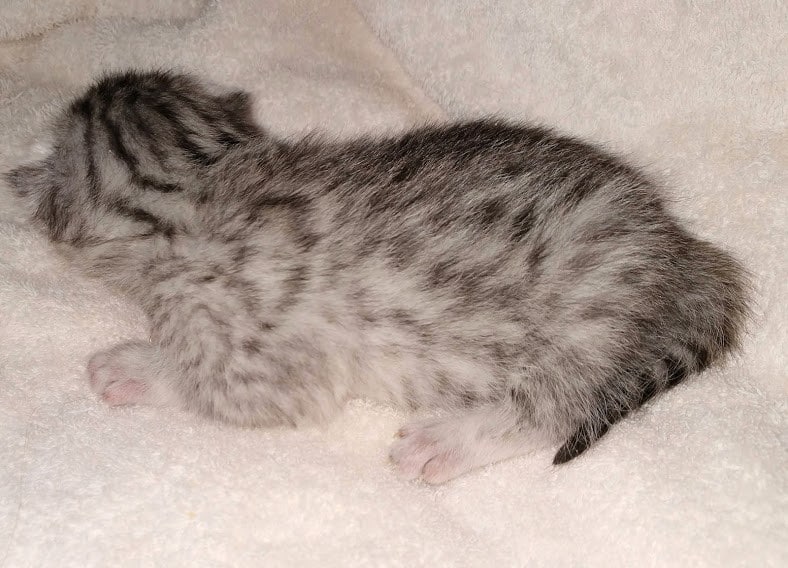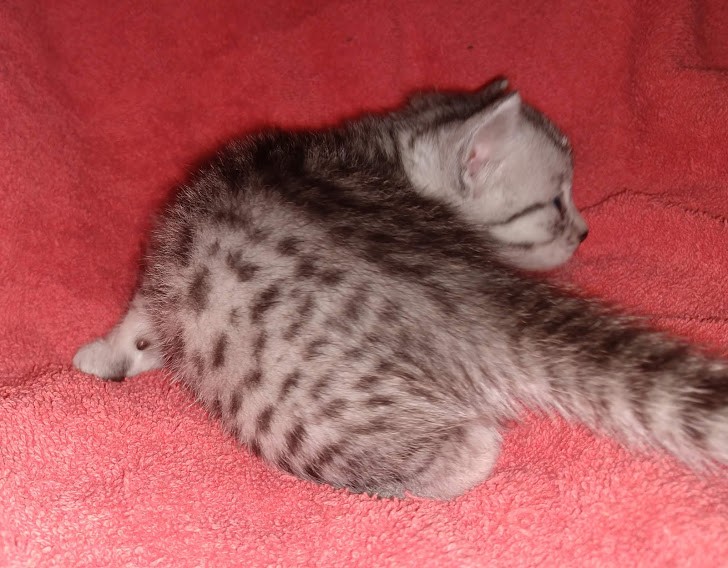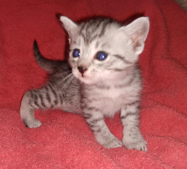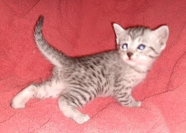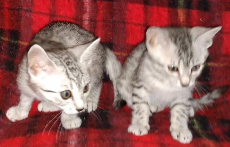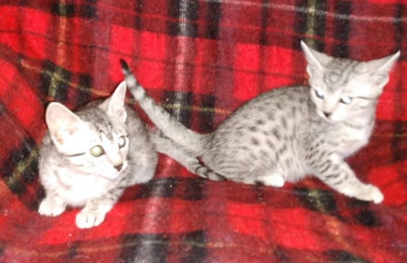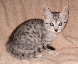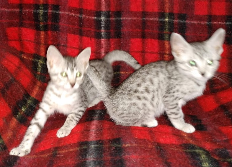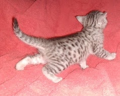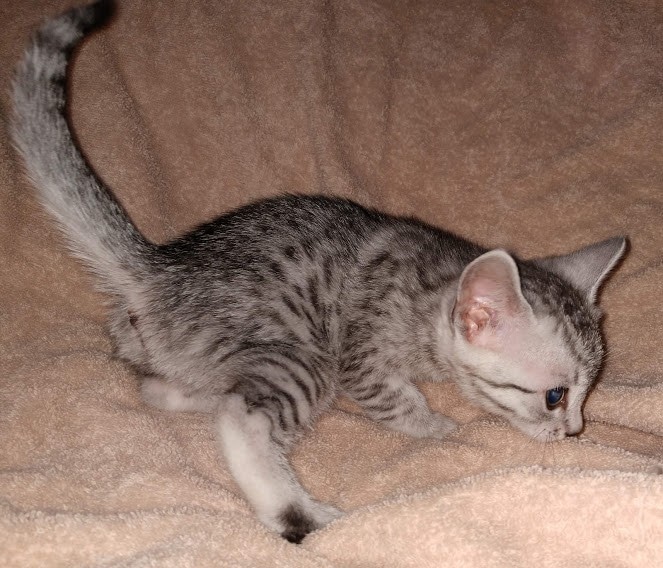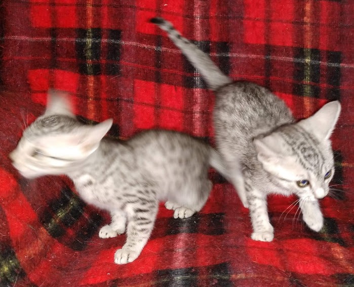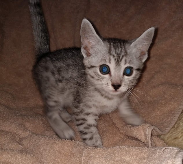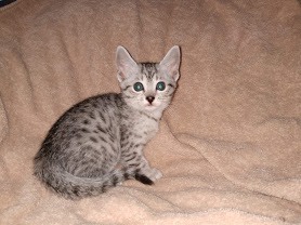Egyptian Mau SIlver Female #1 DOB 2-27-21This beautiful girl will make a fabulous pet and devoted companion for some lucky family. Slightly lighter than her sisters she is beautifully spotted. She and her sister will be going to Live with King and his wife in OH. [Show slideshow]