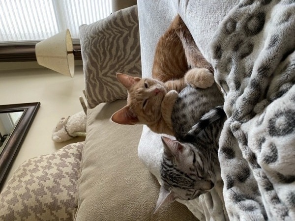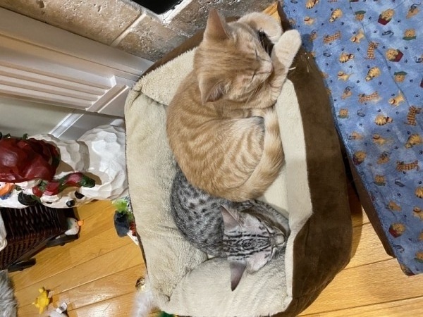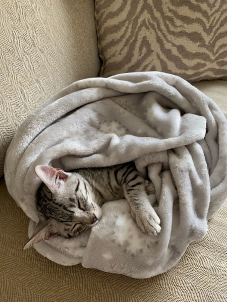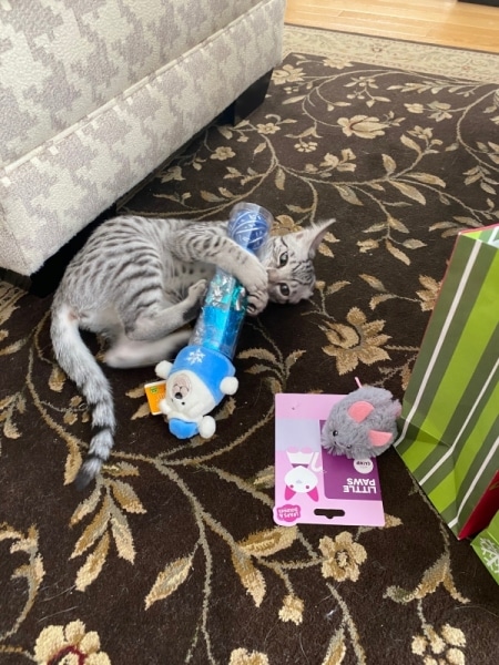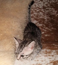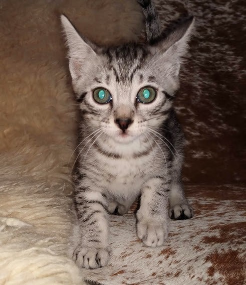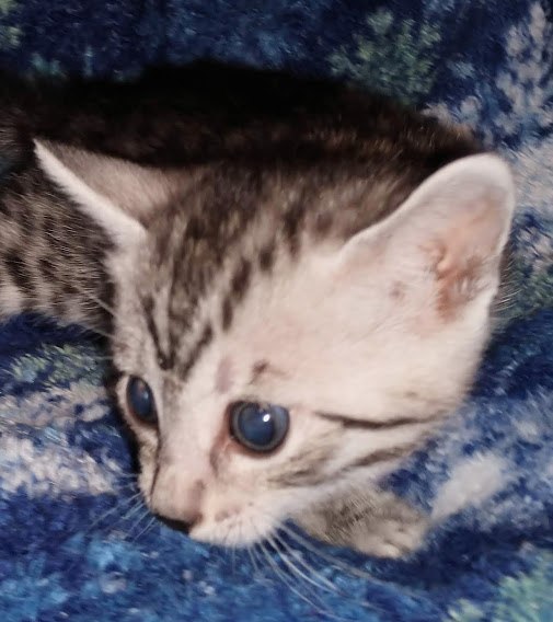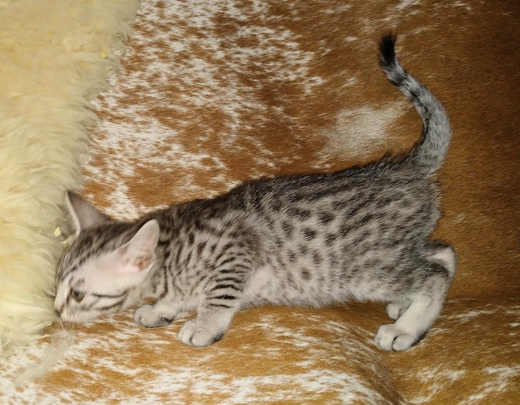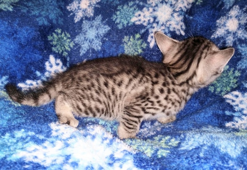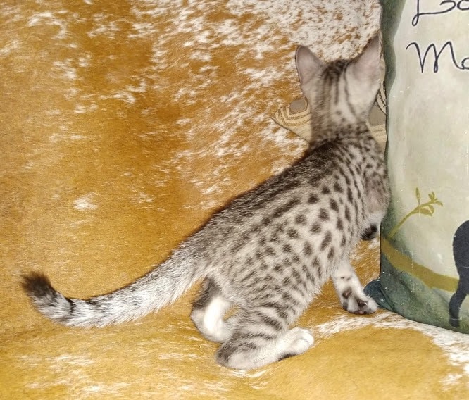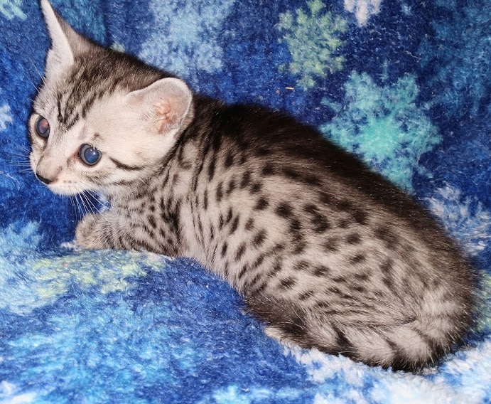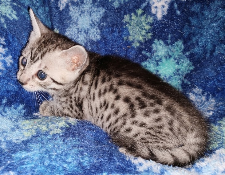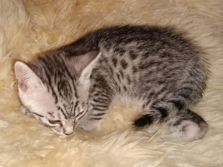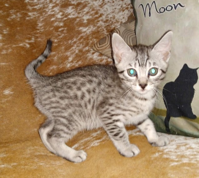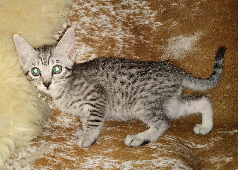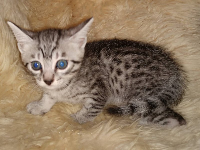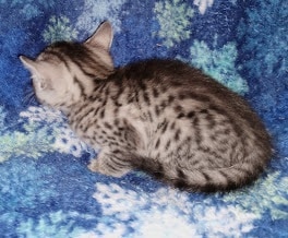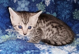 Egyptian Mau Silver female #1 DOB 9-30-20So sweet and shiny this silver girl will make a wonderful pet and stunning adult for Bonnie and her husband in NY. Here are few more pictures of her (and her brothers): They nap together and love to cuddle and they are just adorable together. [Show slideshow]1 2 ►