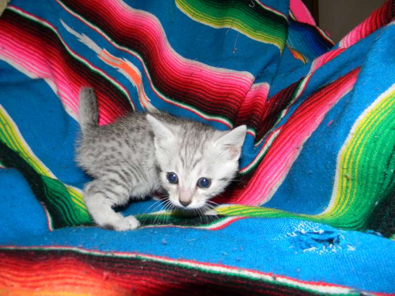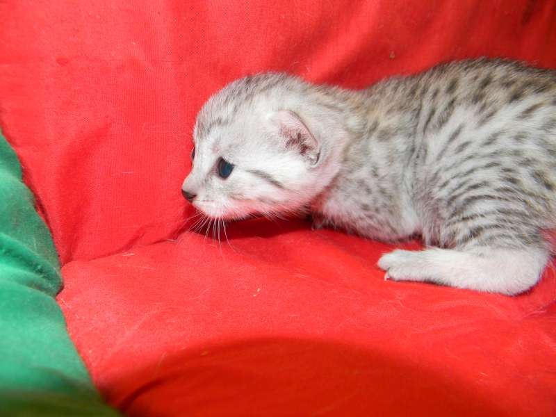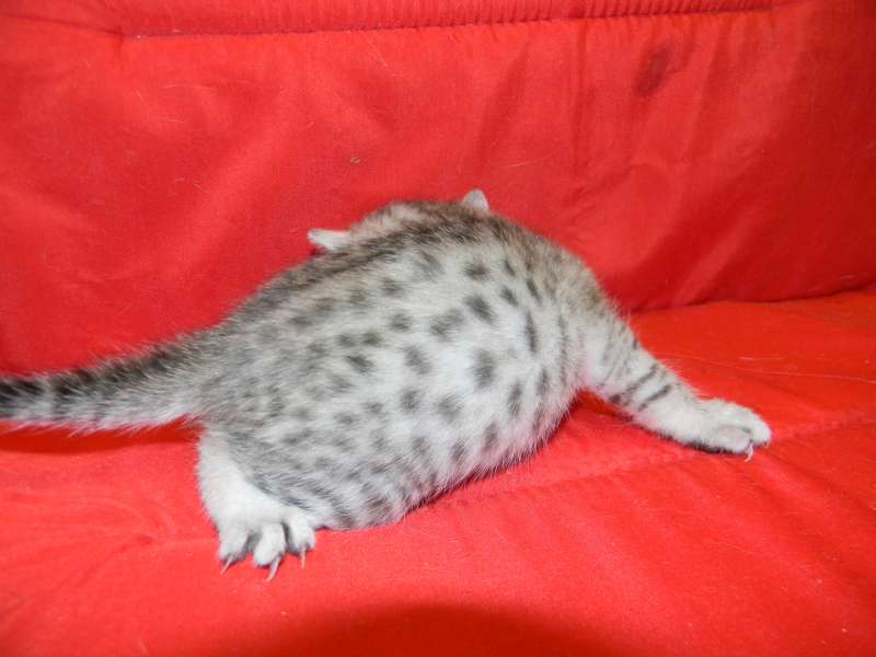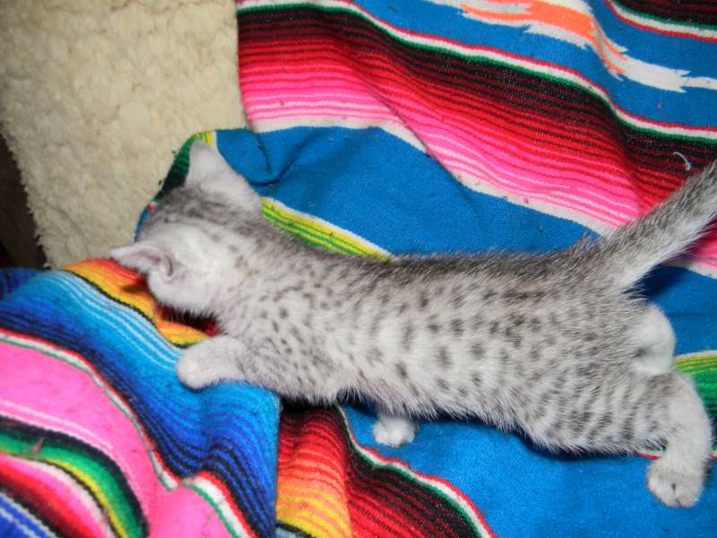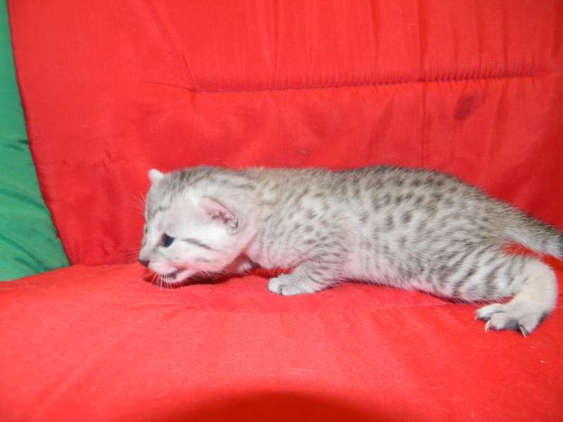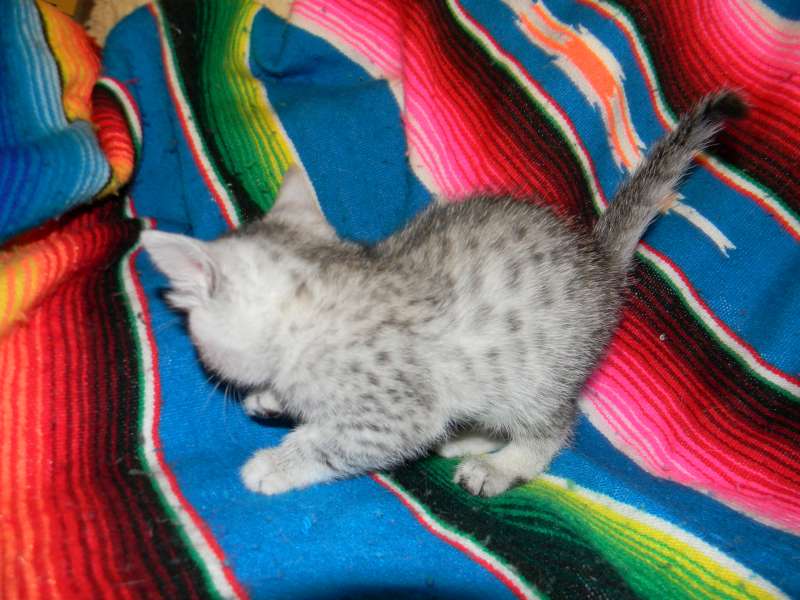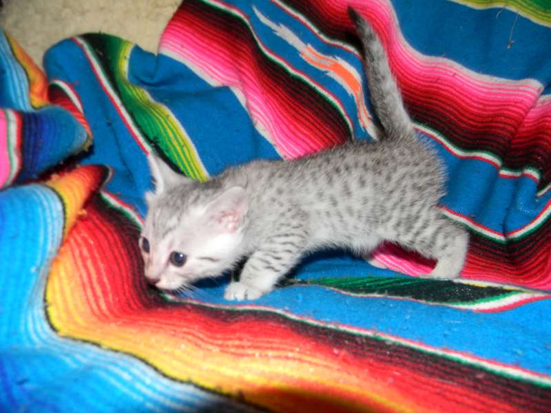 Egyptian Mau Silver female Lightest DOB 9-27-15This stunning Mau girl has a pale silver coat and more spots than stars in the sky. Sure to make a super pet and beautiful adult cat for Melissa and Linda in NY. [Show slideshow]