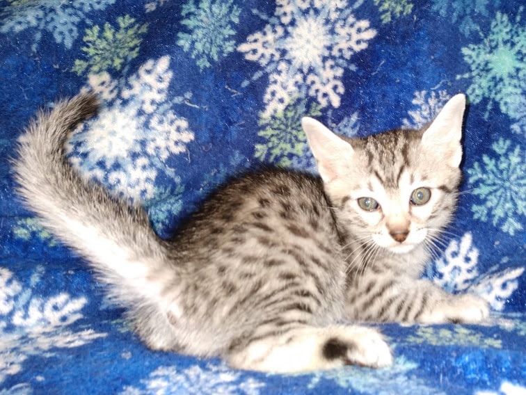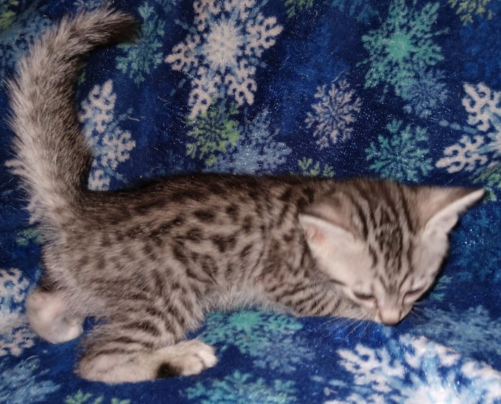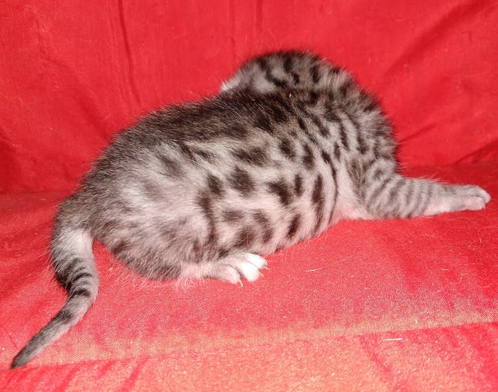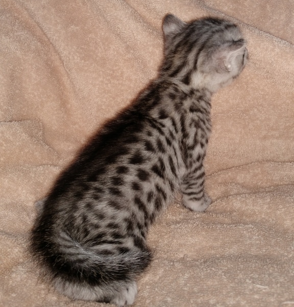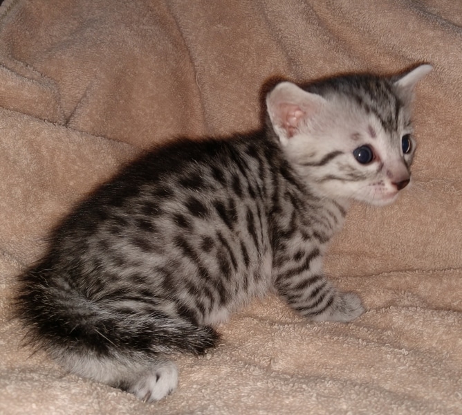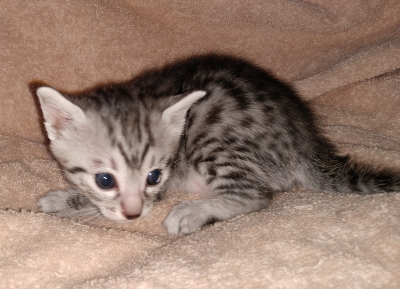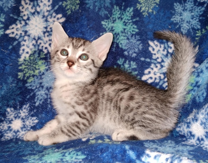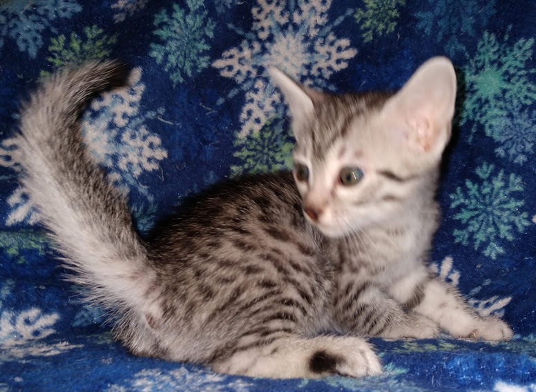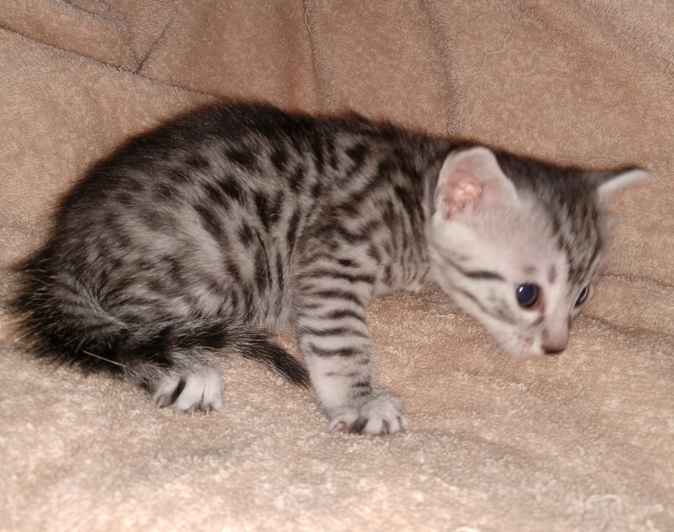 Egyptian Mau SIlver Male #1 DOB 3-24-21Like his Bronze Brother this boy has huge black spots. He will be a exotic looking adult and a sweet and loyal companion. for Ahmed in NJ. [Show slideshow]