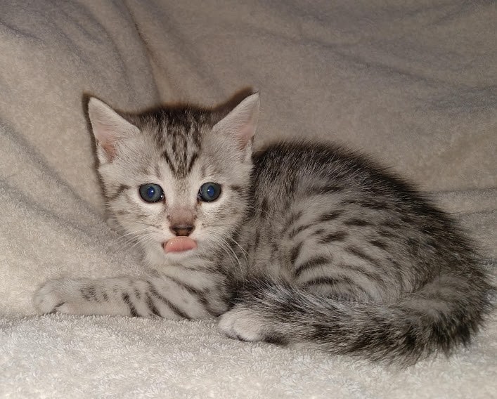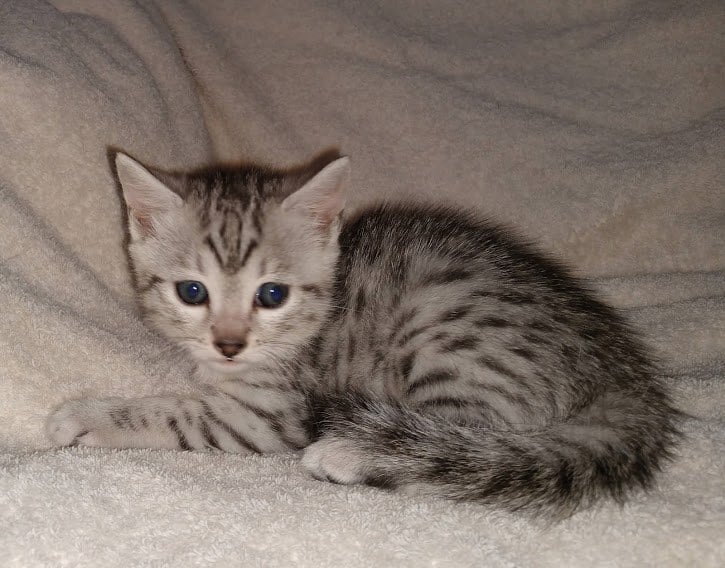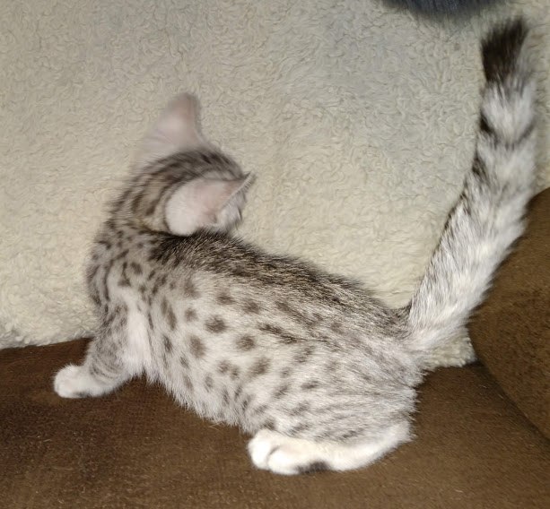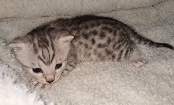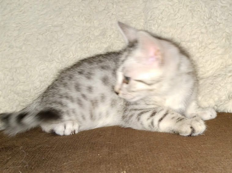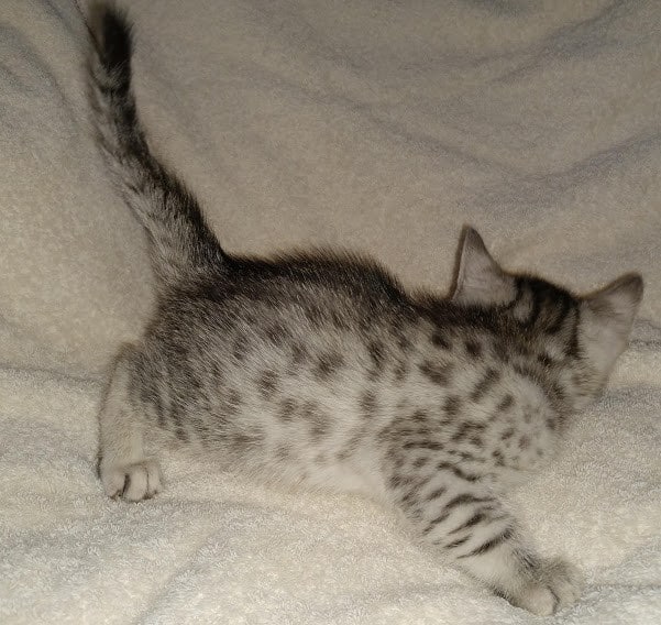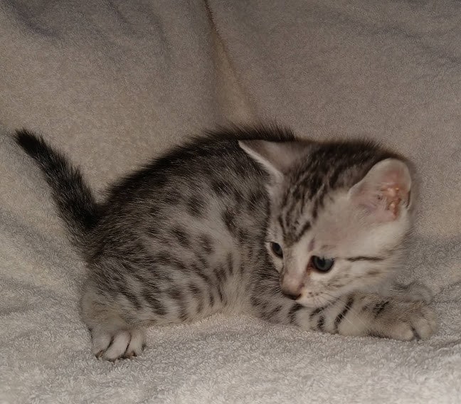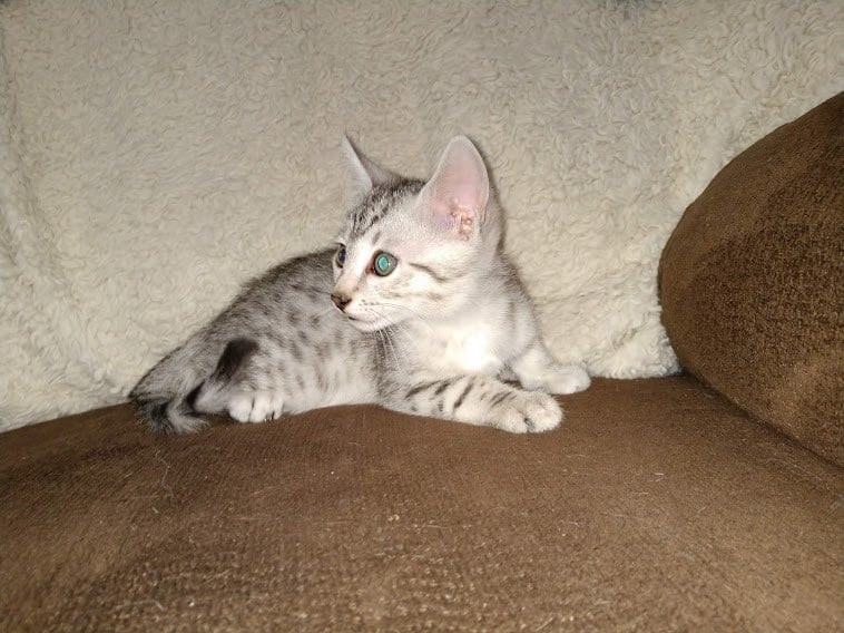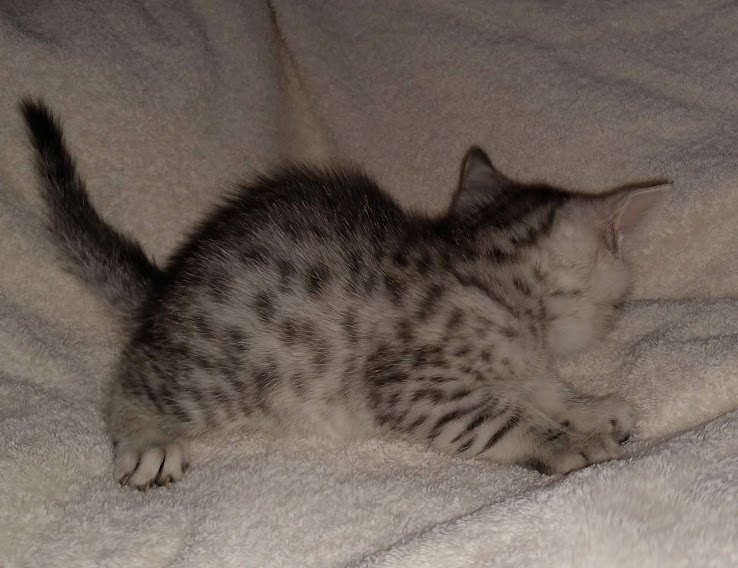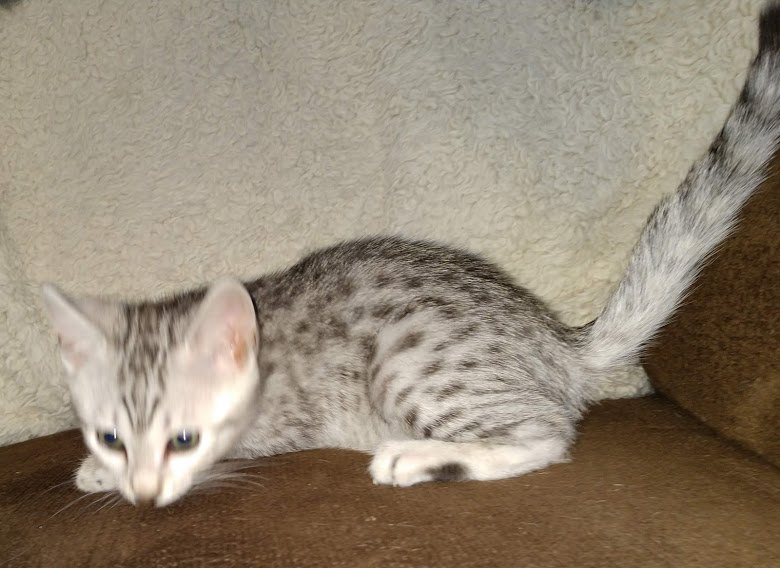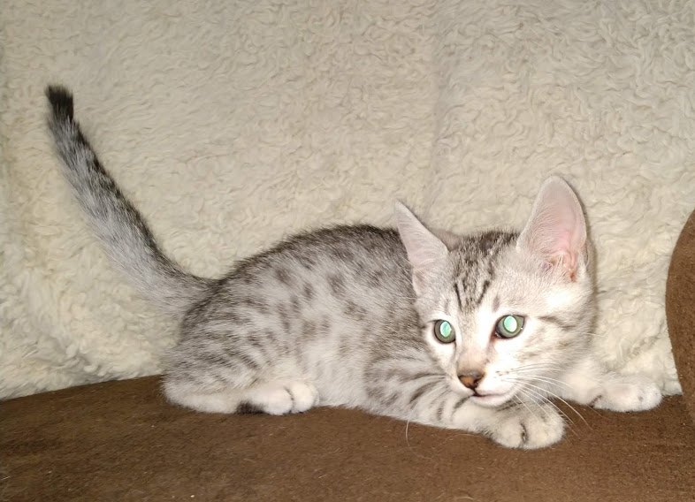 Egyptian Mau Silver Male DOB 2-15-21Shinny like a new dime this boy is going to make a beautiful and loving companion for Marianna and Mathias in MA. [Show slideshow]1 2 ►