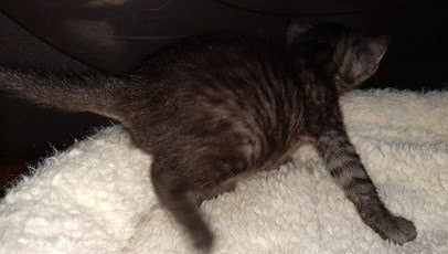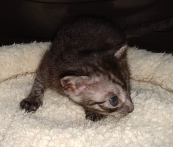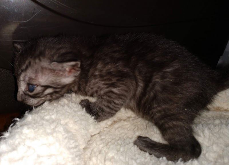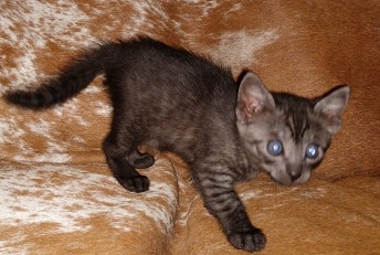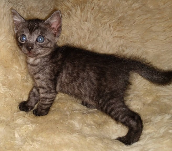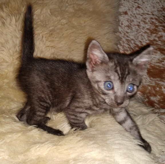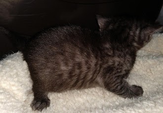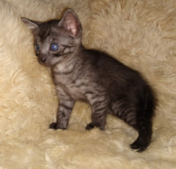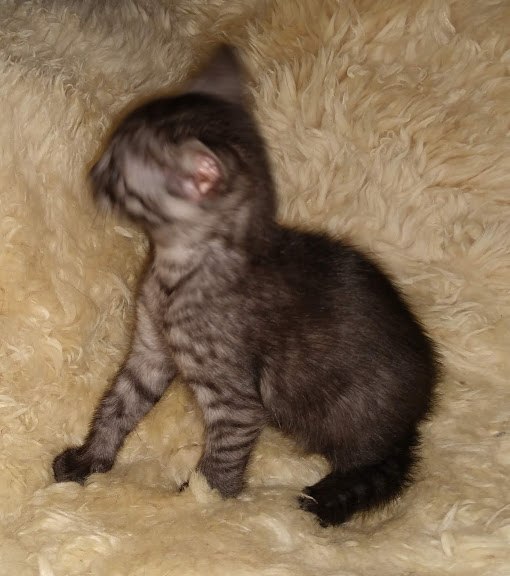 Smoke is my favorite color of Mau as it is so very different than any other, Niether black, grey or silver but clearly spotted, a good smoke is truely hard to describe. This girl is a very good smoke and is already showing a real perky personality as well. She will be going home to Nancy and Dan and there other Belle Hollow Baby.