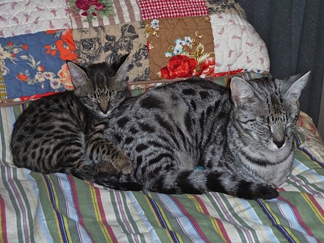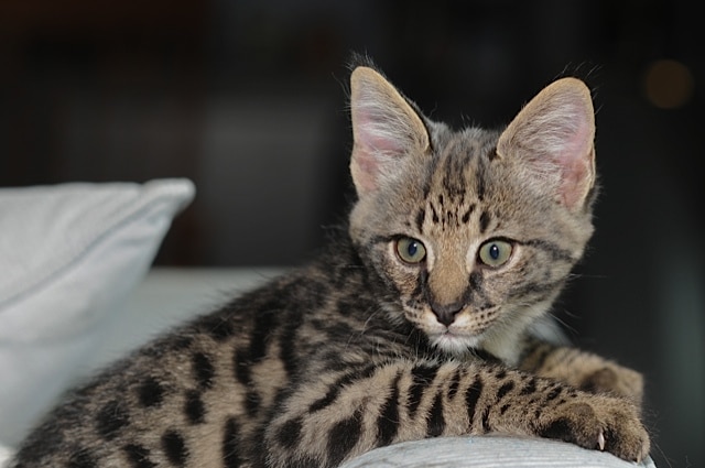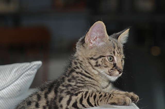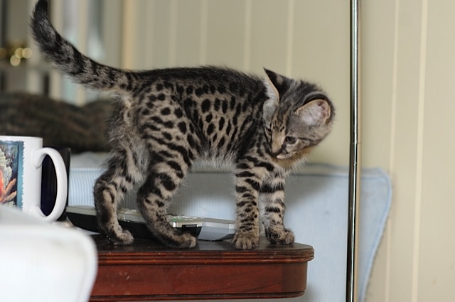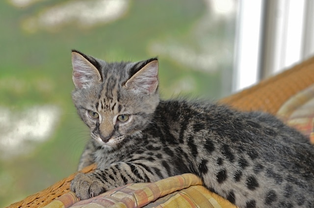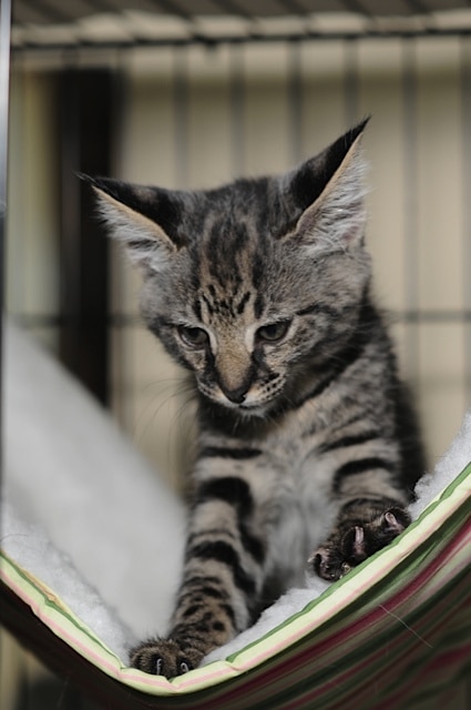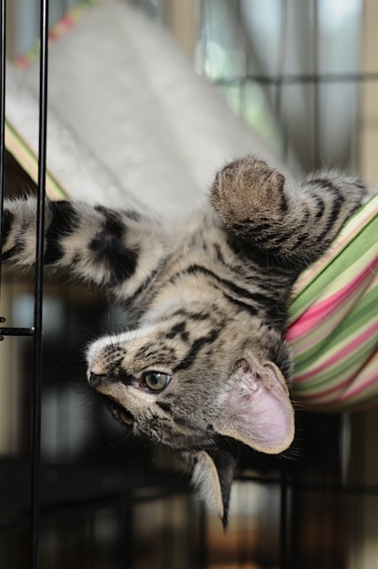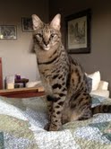 Hobbes – F-1 Savannah Male DOB 4-29-11This beautiful little guy is destined to Join Toby in Tn. So sweet and tiny he will grow to be a very hansome boy! What a sweet angel little Hobbes is. He will soon grow out of his baby coat and be a spectacular spotted boy. Displaying his signature cute expression Hobbes, F-1 Male Savannah, is a real character. Hobbes explores his new home on his very first day there. Hobbes,F-1 Savannah Male, shown here with his domestic friend Sandy is a super sweet guy. Always ready to play or cuddle. What did you say? This looks like my Hammock at Belle Hollow Hobbes settles into his new home. He is just too cute! I have an older Brother? Hobbes and his older brother Toby just chilling out! Hobbes Just Hangin' out Good Morning from Hobbes, F-1 Savannah Male. [Show slideshow]