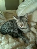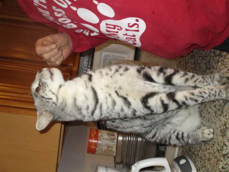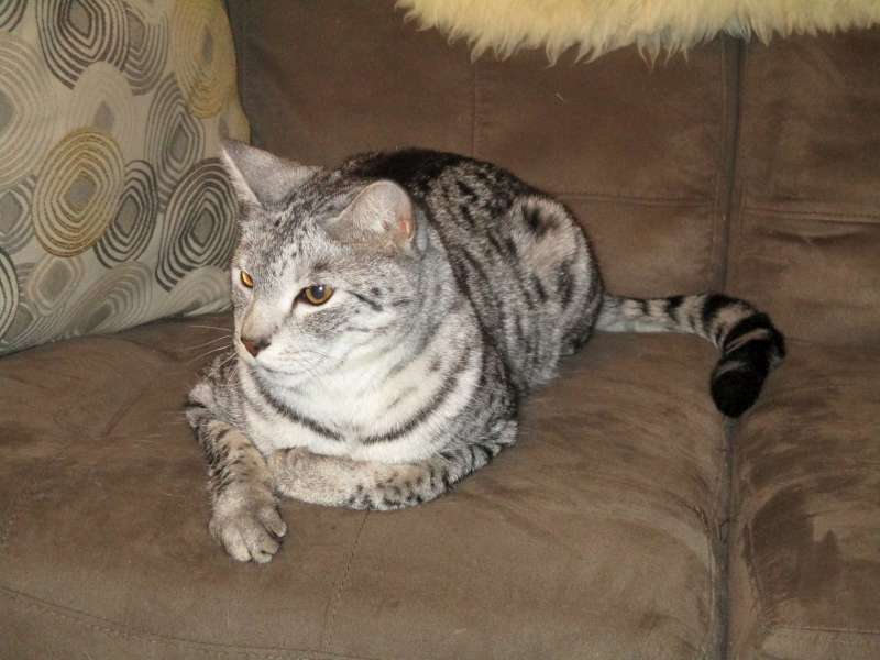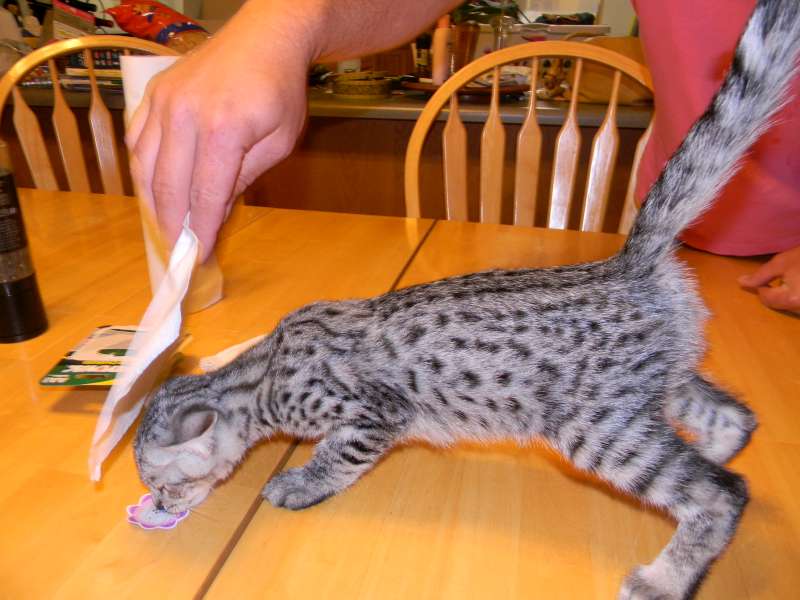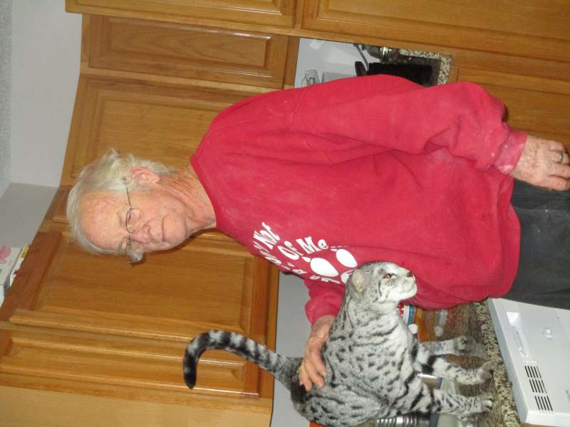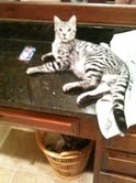 KJ is a truly beautiful Silver F-2 Savannah soul. From Pearl and Merit, He returned to Belle Hollow because his owners divorced. He is now a happy household pet weighing roughly 24 pounds.