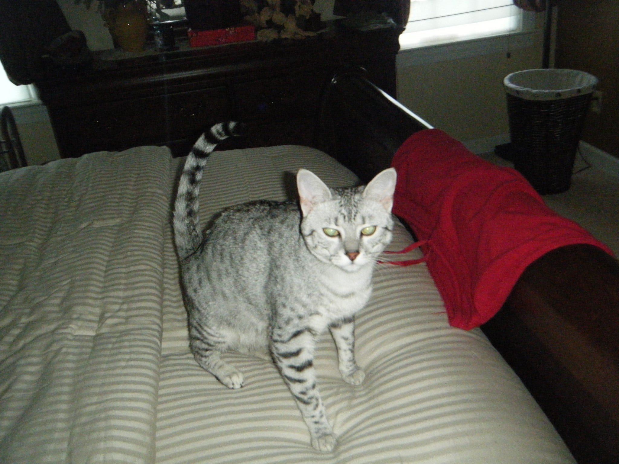 Layla – Egyptian Mau SilverLayla, Egyptian Mau female DOB 5/2/09 living with Tim and family in Charlotte, NC Shown here @ 1 day, Gone to live with Tim and family Tim in Charlotte NC Shown here @ 1 day, Gone to live with Tim and family in Charlotte, NC Silver Mau Female has gone to live with Tim and family in Charlotte, NC Shown here on her first birthday, Layla, a Silver Egyptain Mau runs her whole household. [Show slideshow]