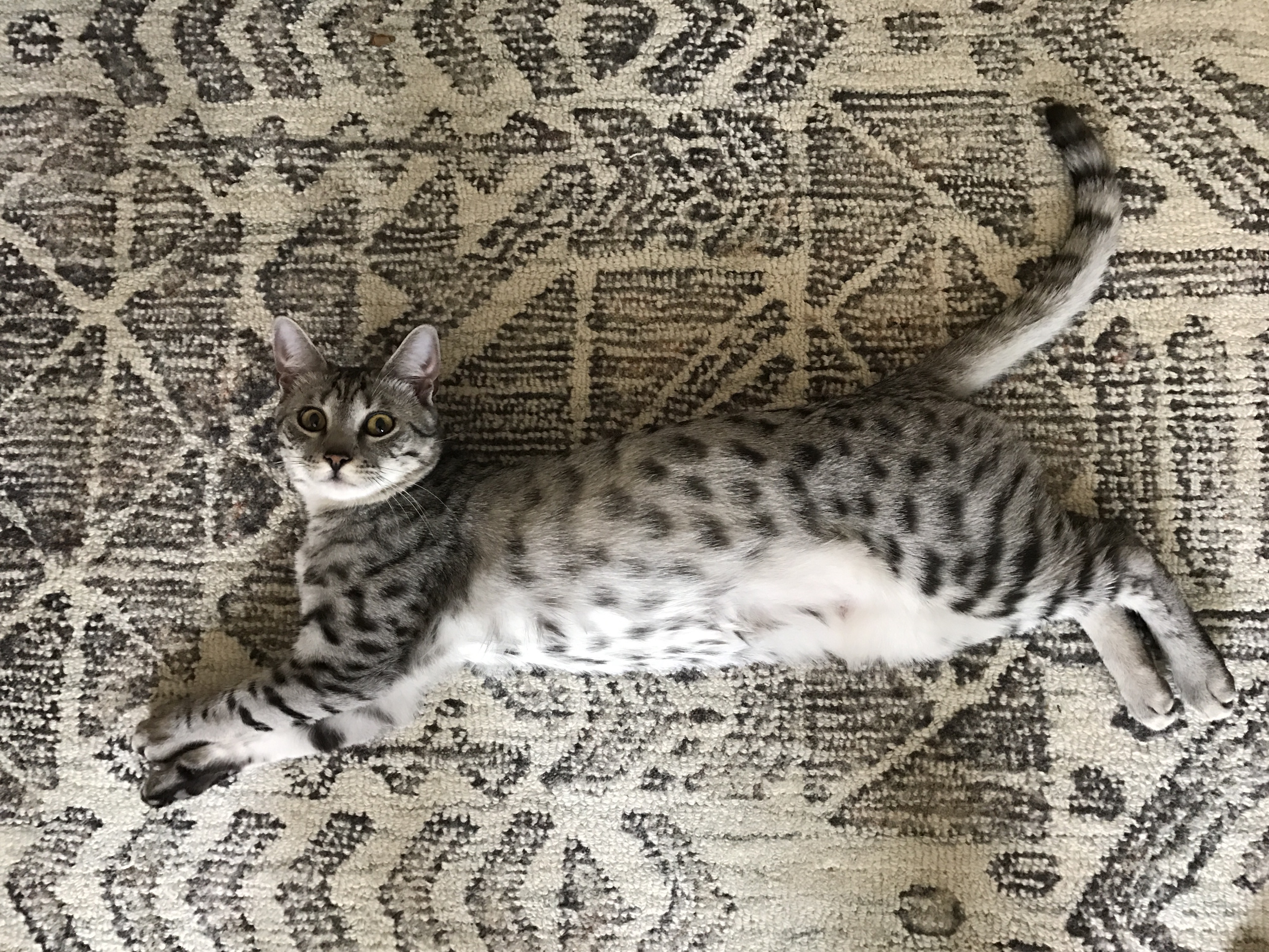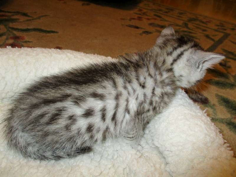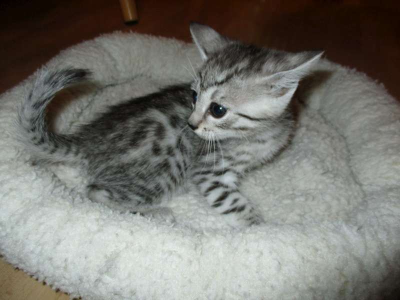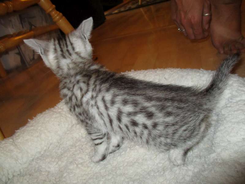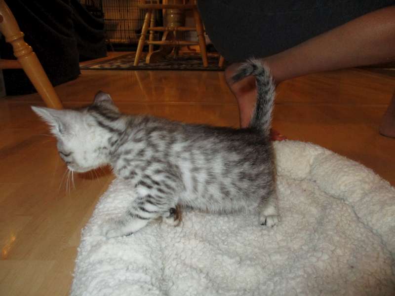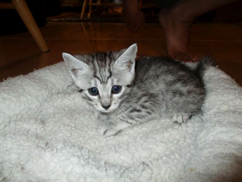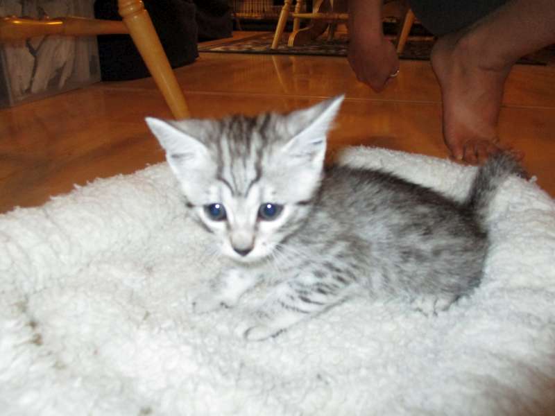 Mau Silver female #6 DOB 4-15-16This Silver Egyptian Mau girl will be a stunning adult and a superior pet. She will be going to live with Jeremy and Jennfer and Oz another Belle Hollow Mau in TX. [Show slideshow]1 2 ►