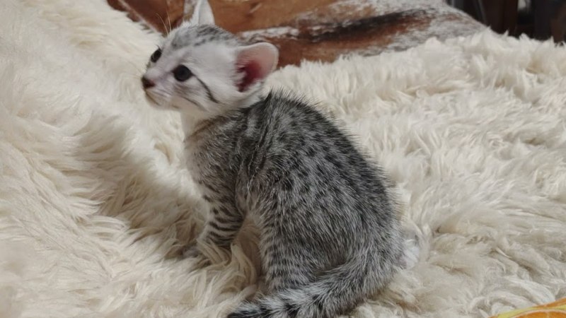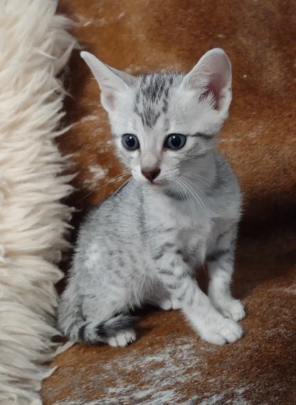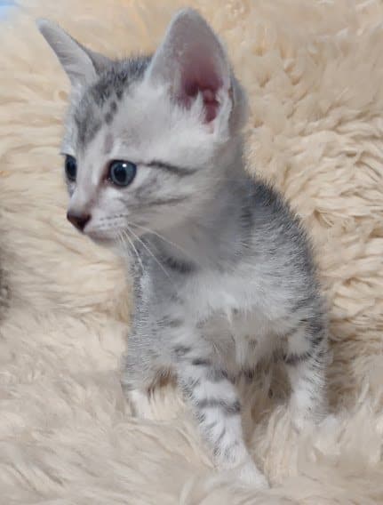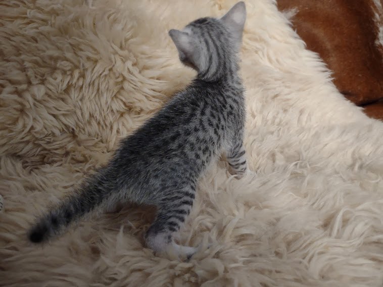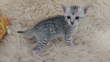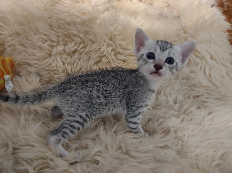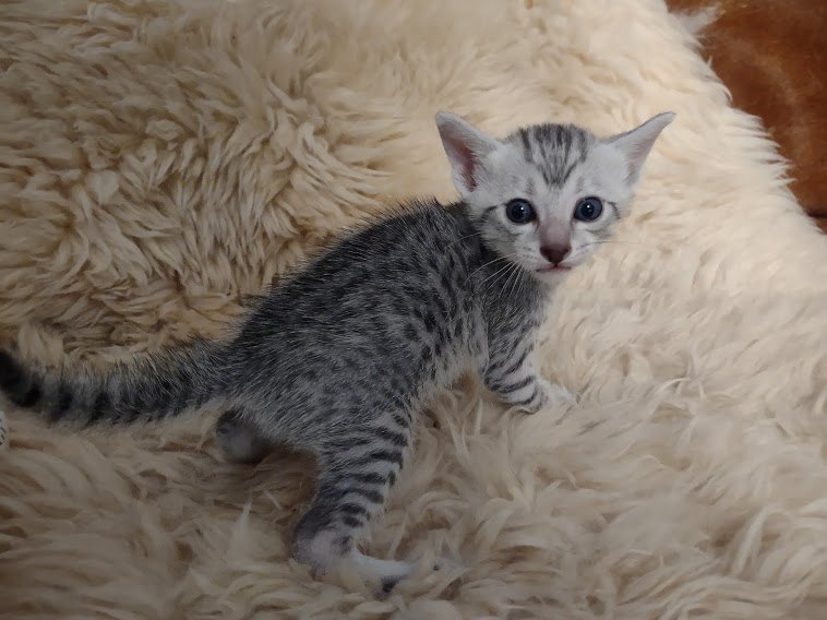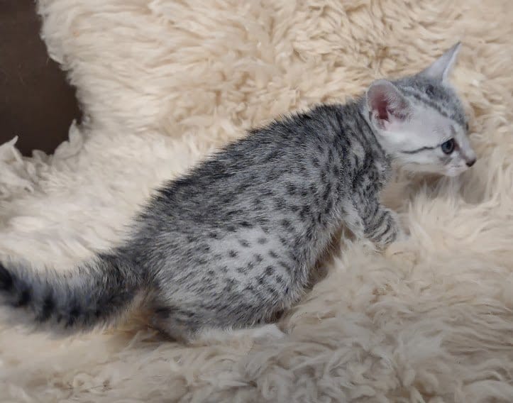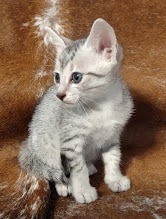Mau Silver male DOB 5-19-21 rt hip DariaThis beautiful silver boy is going to a breeding program. He will contribute valuable genetics to the Mau gene pool. [Show slideshow]