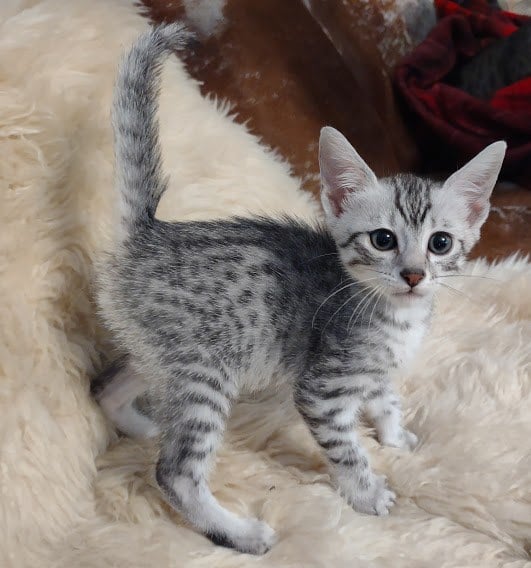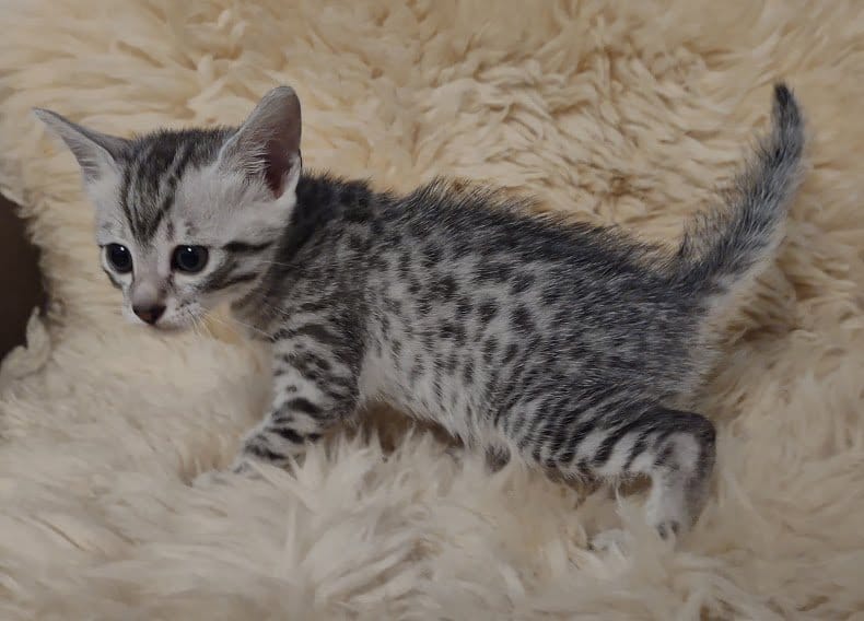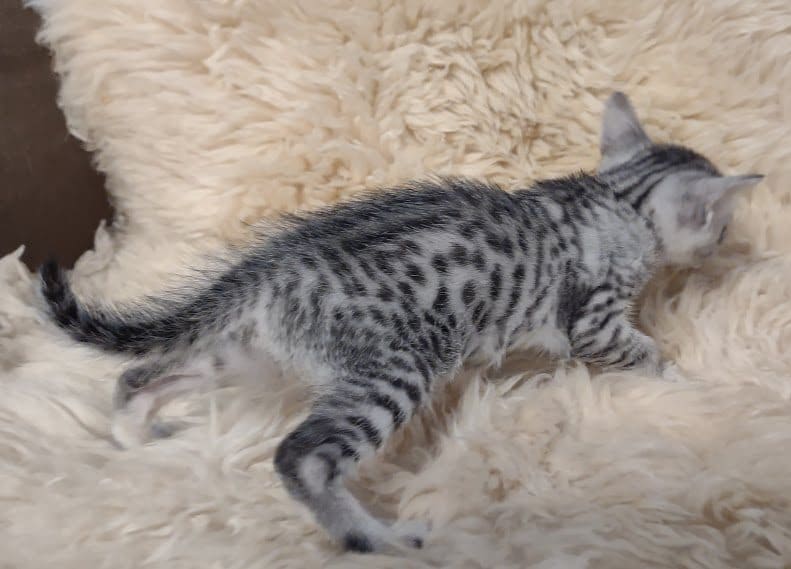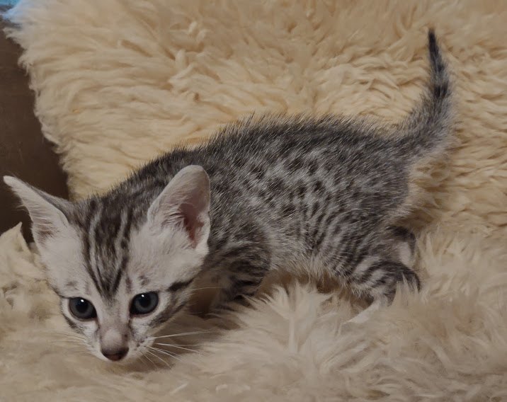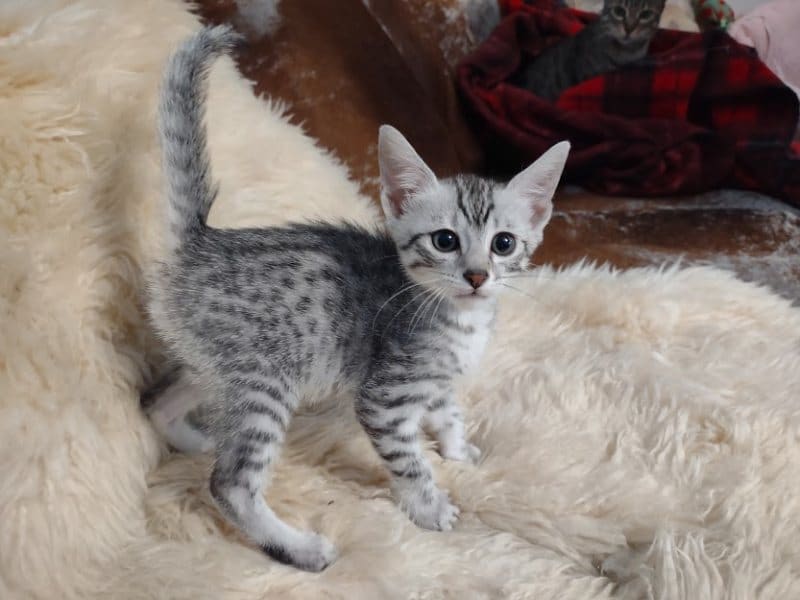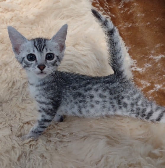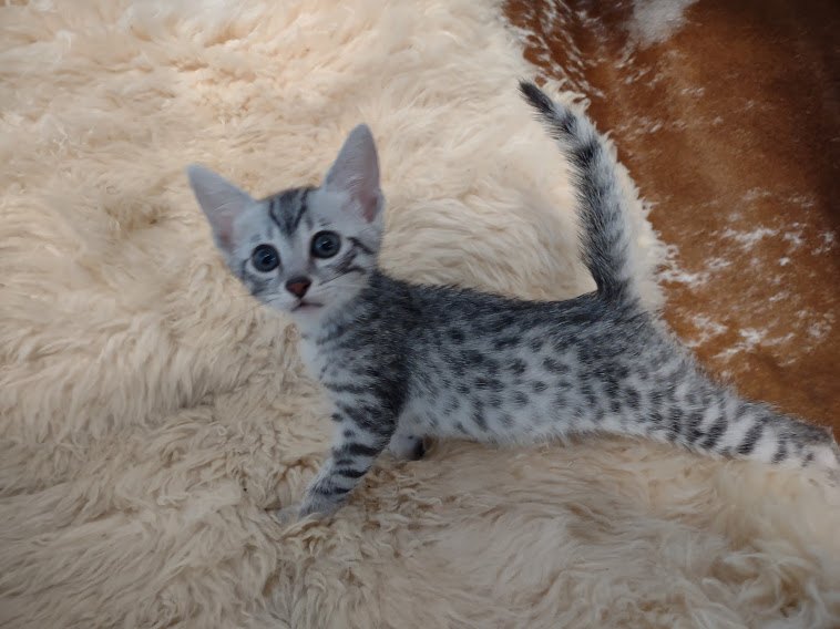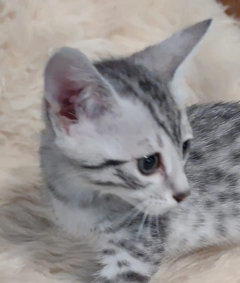 Mau silver male DOB 5-19-21 shoulderThis stunning silver boy has the sweetest face. He will grow to be an exceptional companion and bff for Laura in VT. [Show slideshow]1 2 ►