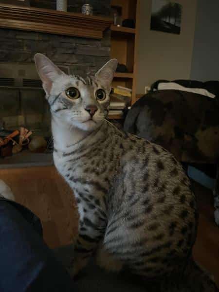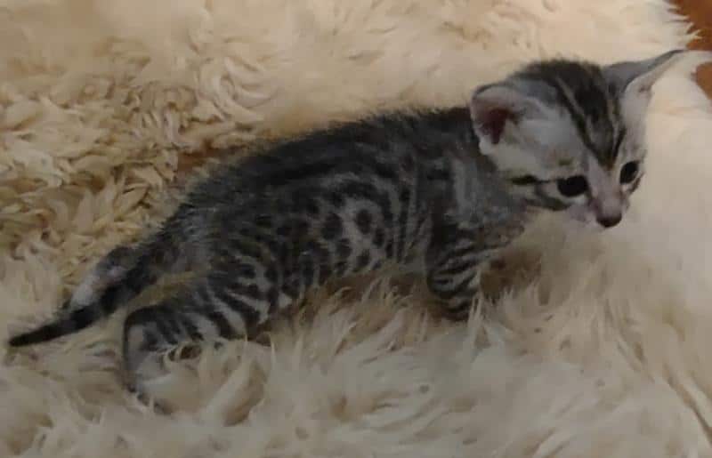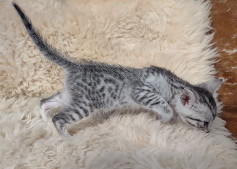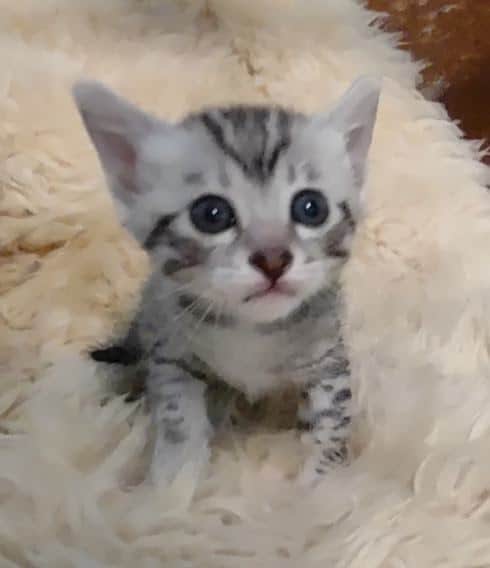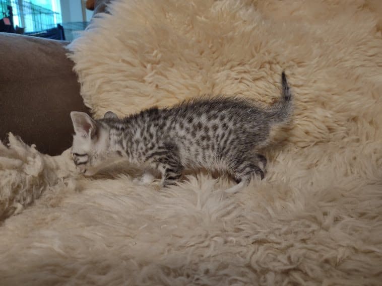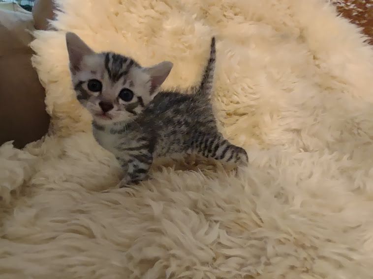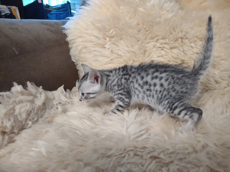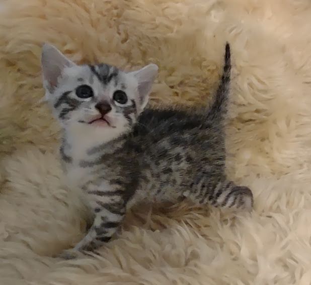 Mau silver male DOB 5-19-21 shoulderThis stunning silver boy has the sweetest face. He will grow to be an exceptional companion and bff for Laura in VT. [Show slideshow]1 2 ►