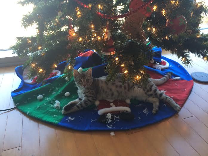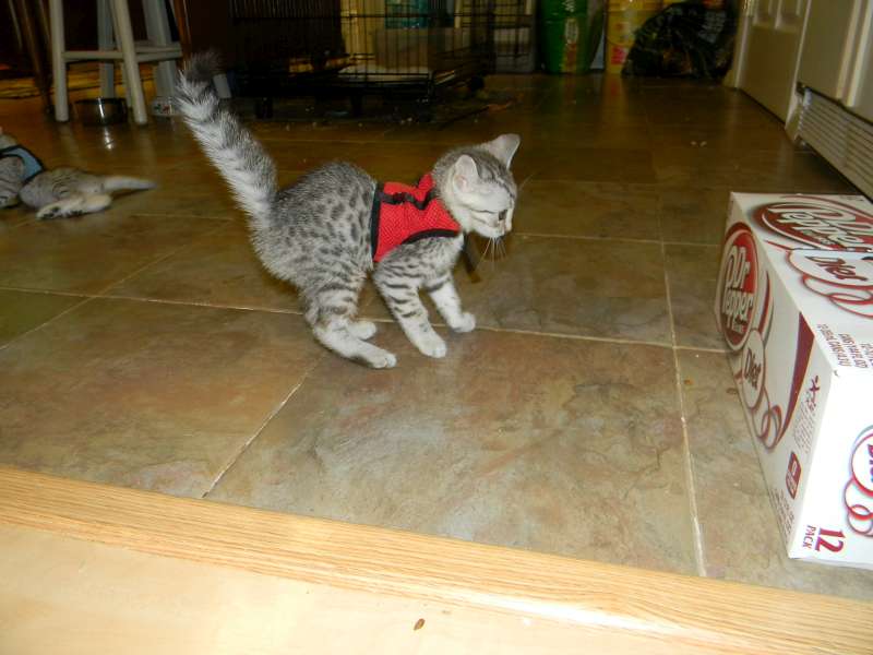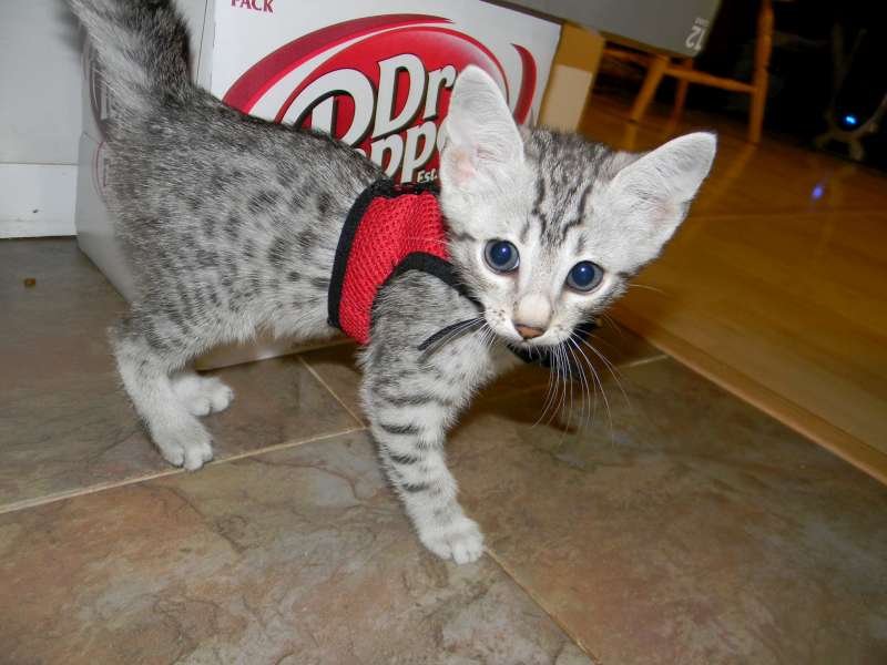 Miggy, silver mau male, has become accustomed to wearing his red harness.