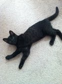 We are thrilled to introduce Mystic our first Safari. From her father Mystery (Melanistic Geoffroy's cat) and her mother Duck ( Melanistic DSH) she is sure to out grow both and be the rare beauty only Safari's are. Gentle in disposition and growing to roughly twice the size of either parent, Safari is the rarest hybrid of all. She will make a superior pet and although we do not guarentee fertility she will come with full breeding rights as well.