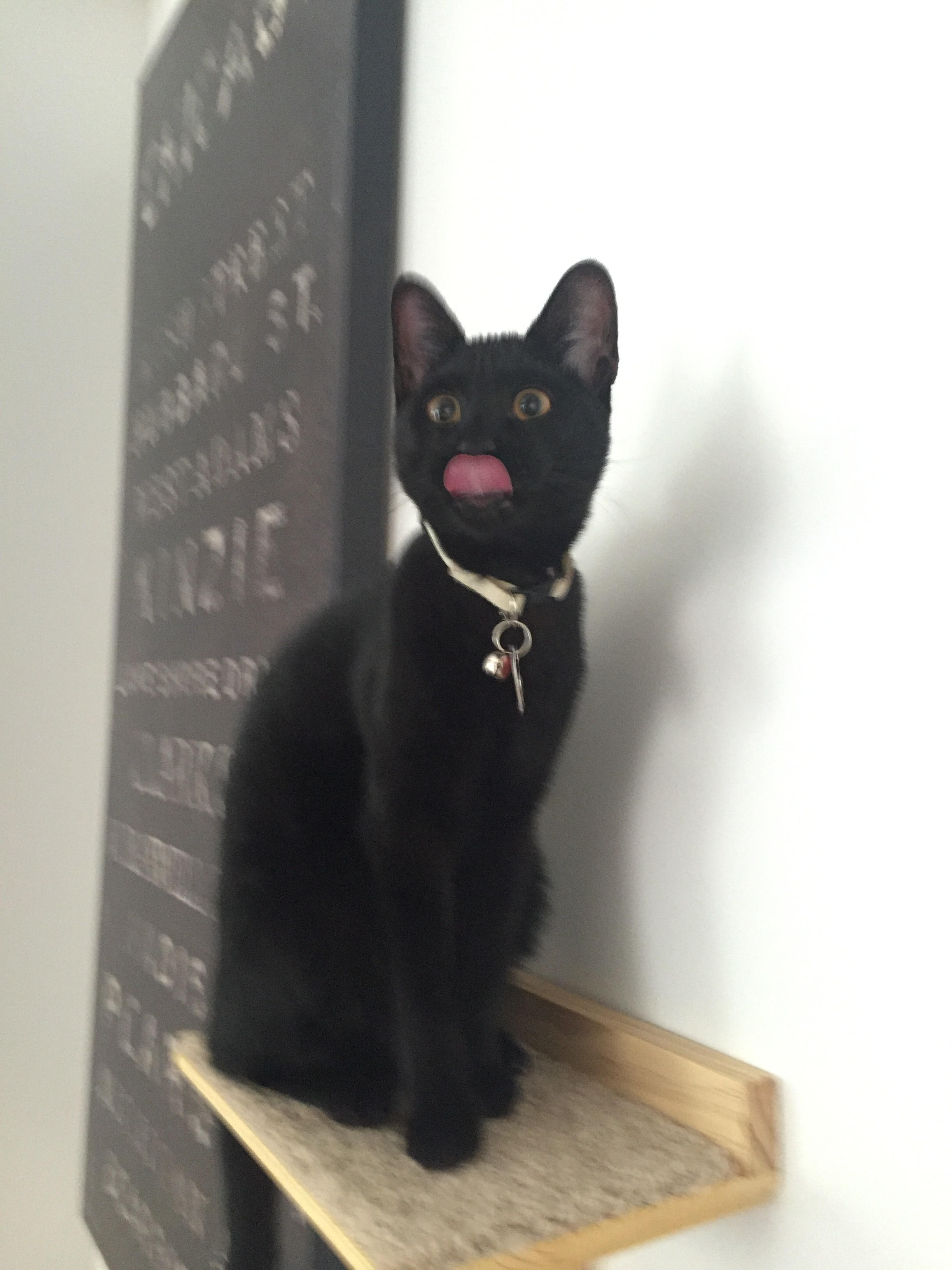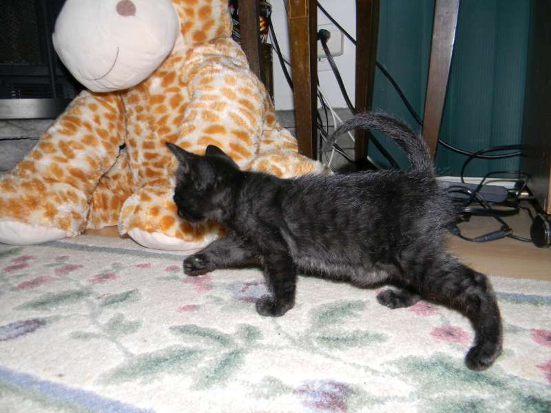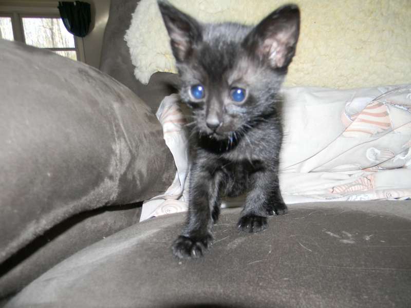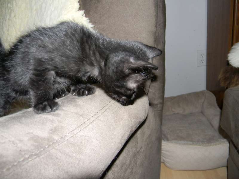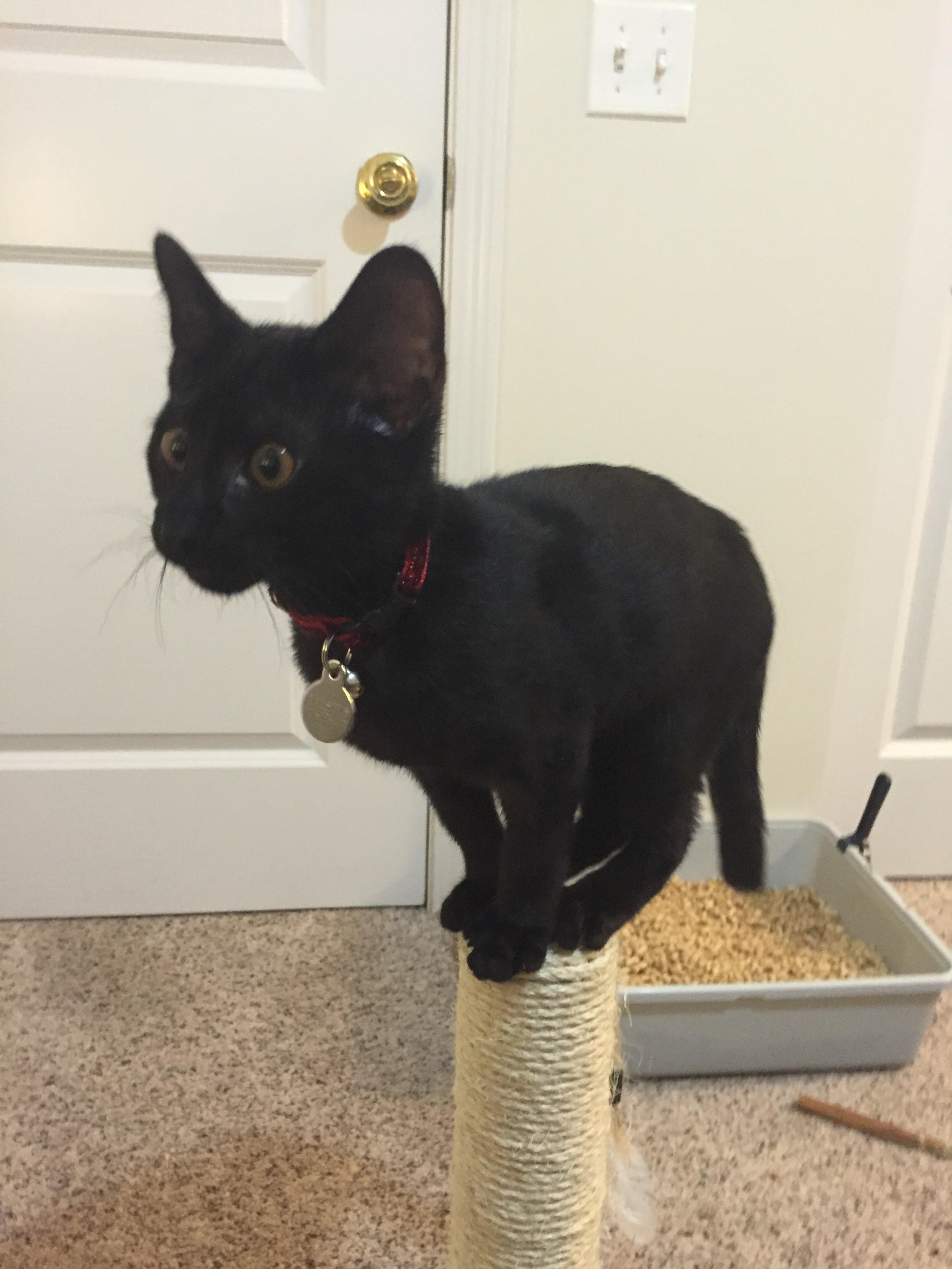 I attached an updated picture of the little guy when he jumped up on his scratching post! This image captures his personality. He's a little over 4 lbs now.