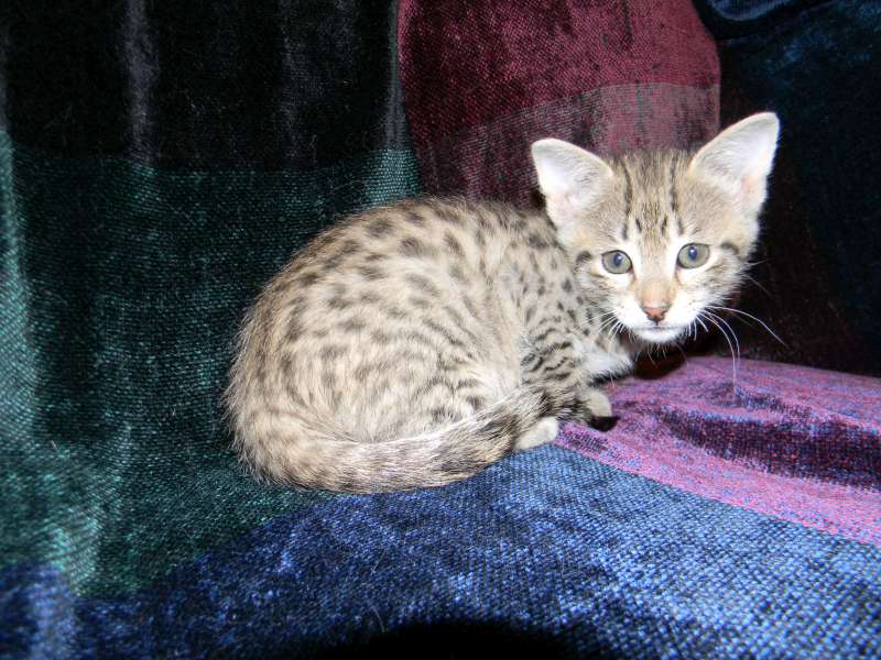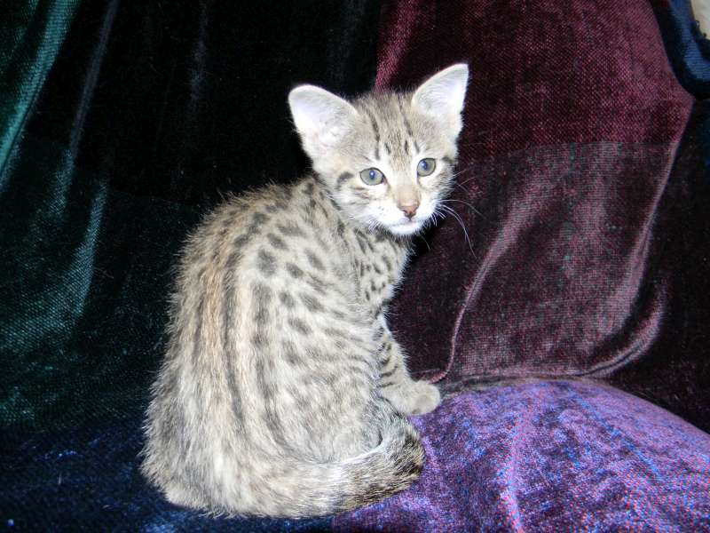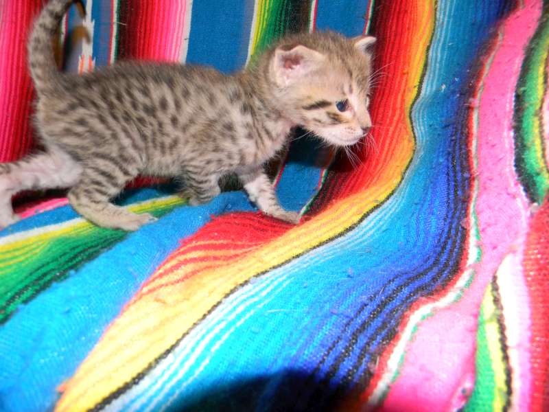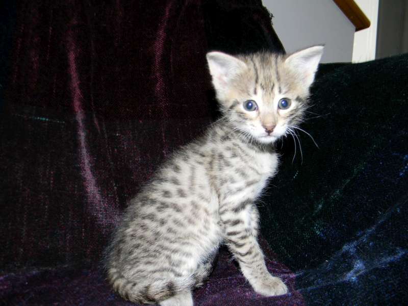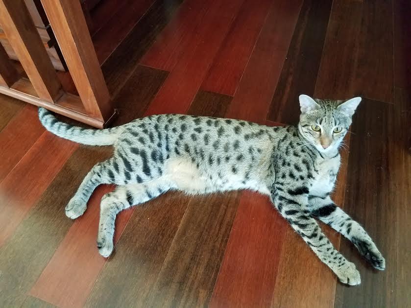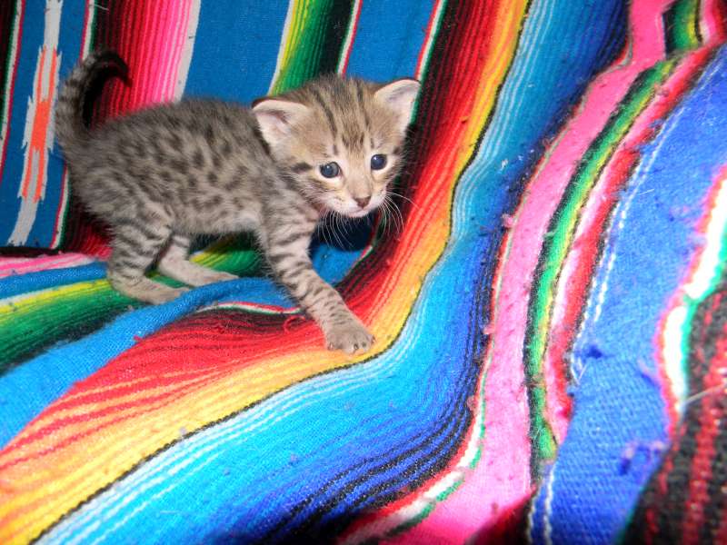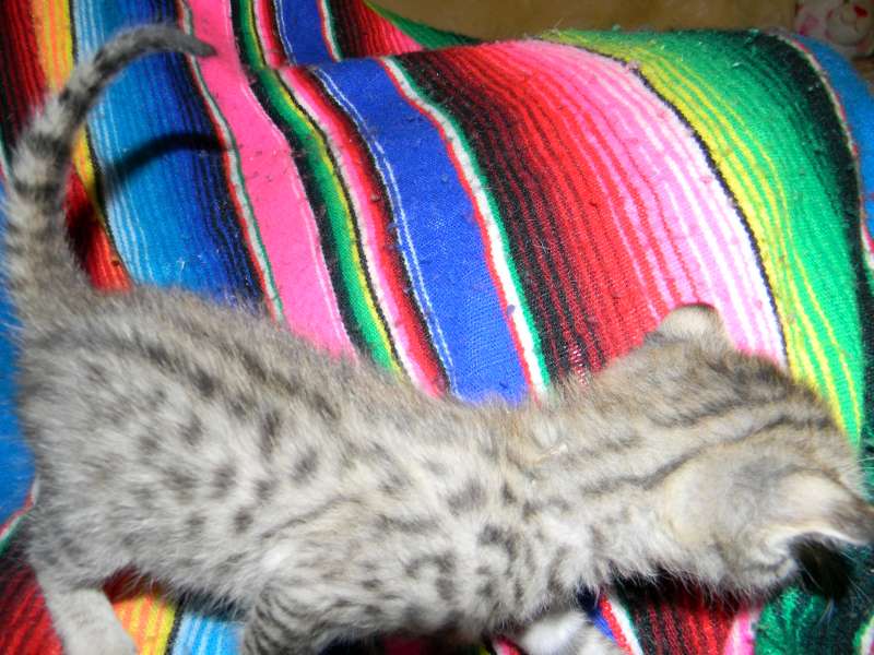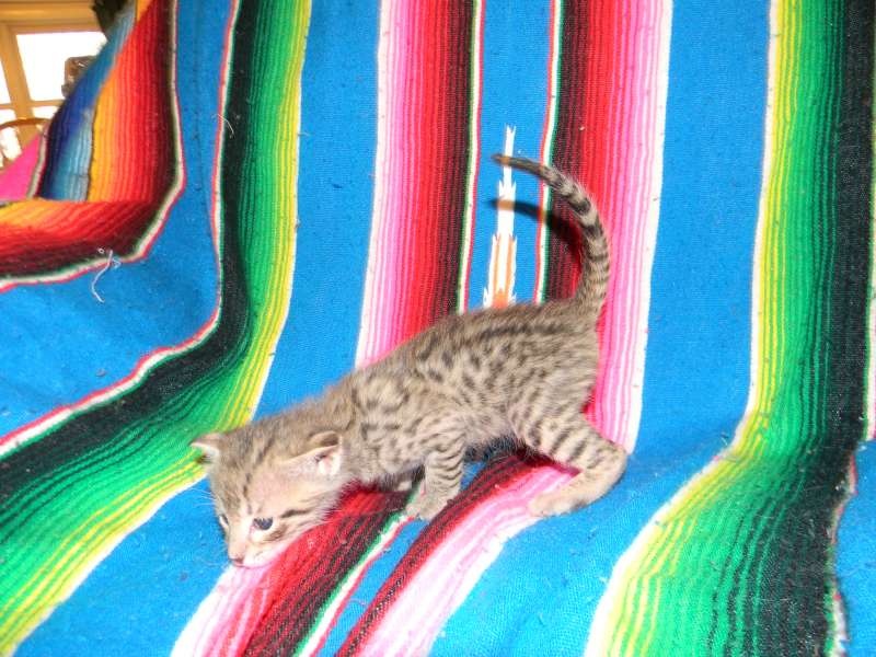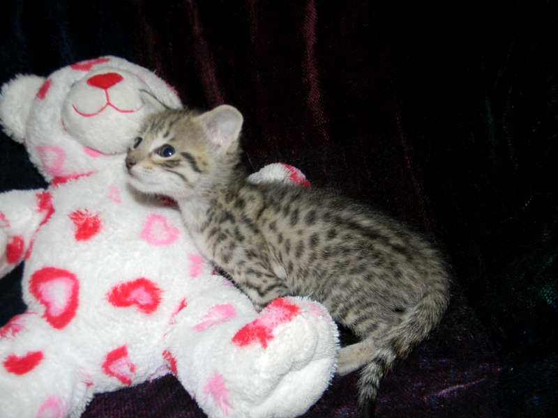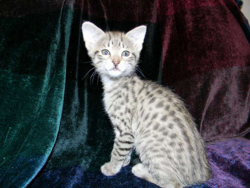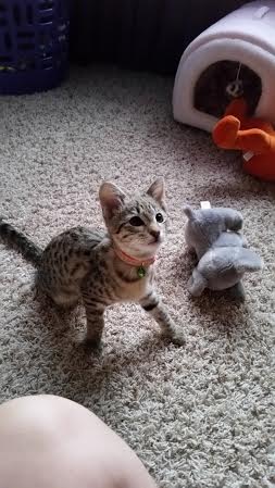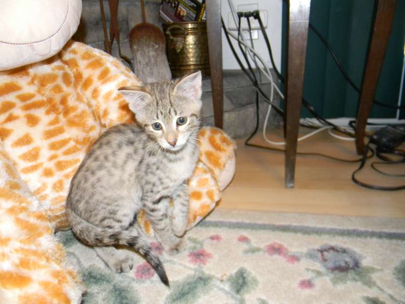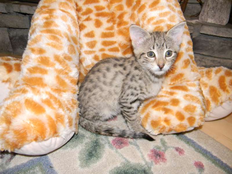 Savannah F-2B female Brown Spotted DOB 1-2-16This Beautiful Girl has great Ocelli, a near back nose and super sweet personality. A 100 % Human Imprint she will make a fabulous family pet and companion for Shelly and Jeff in IL. [Show slideshow]1 2 ►